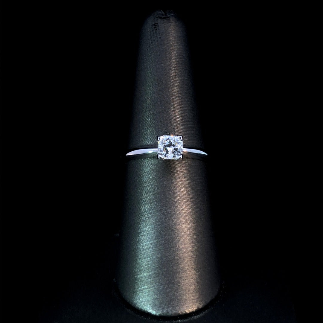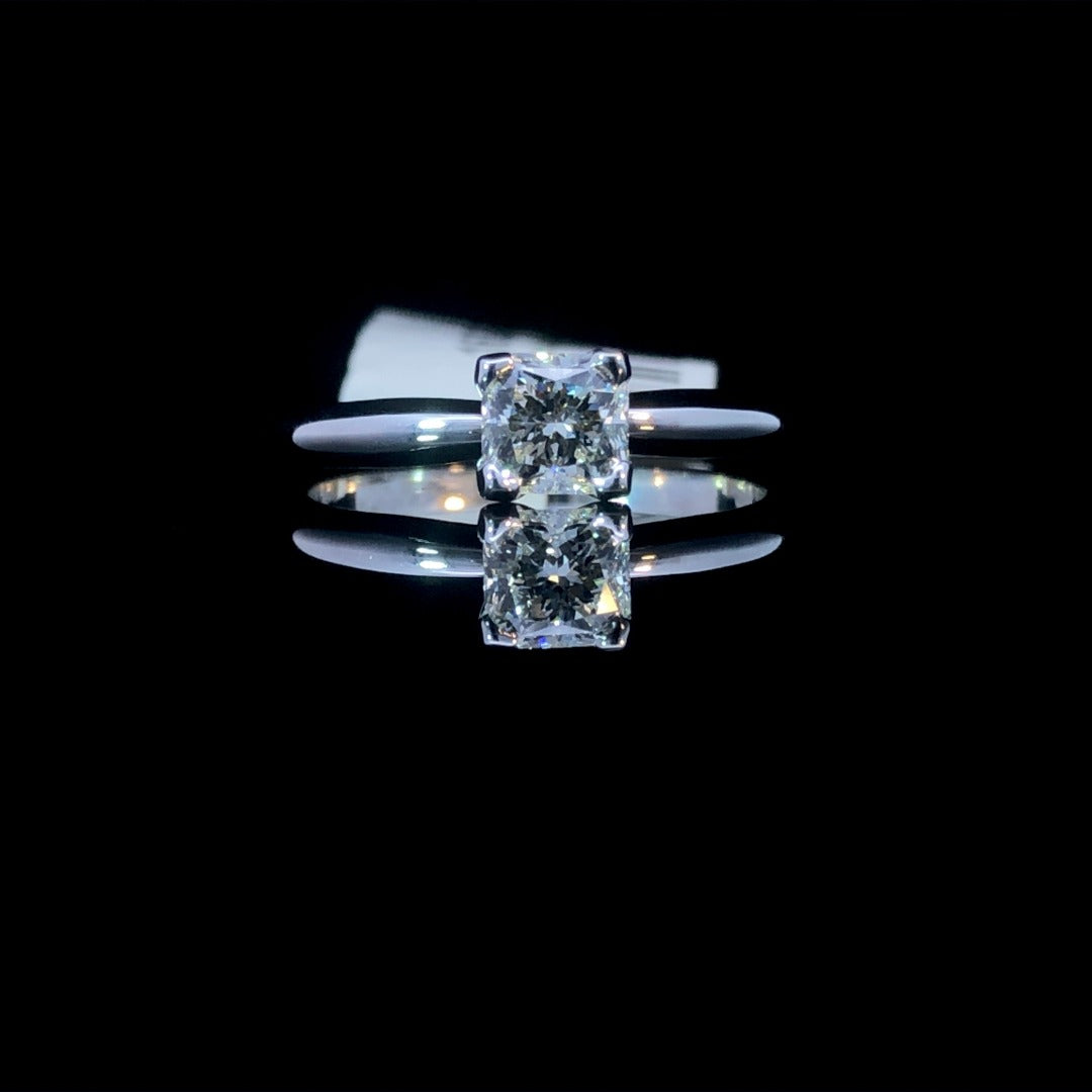 Indulge in luxury with this classic solitaire ring. The certified .71ct square radiant cut diamond shines brilliantly in 14kt white gold. Make a statement with this stunning, exclusive piece. This ring is a size 7. If that size is not a perfect fit, first time sizing is free at the time of purchase. Additional sizing fees may apply.