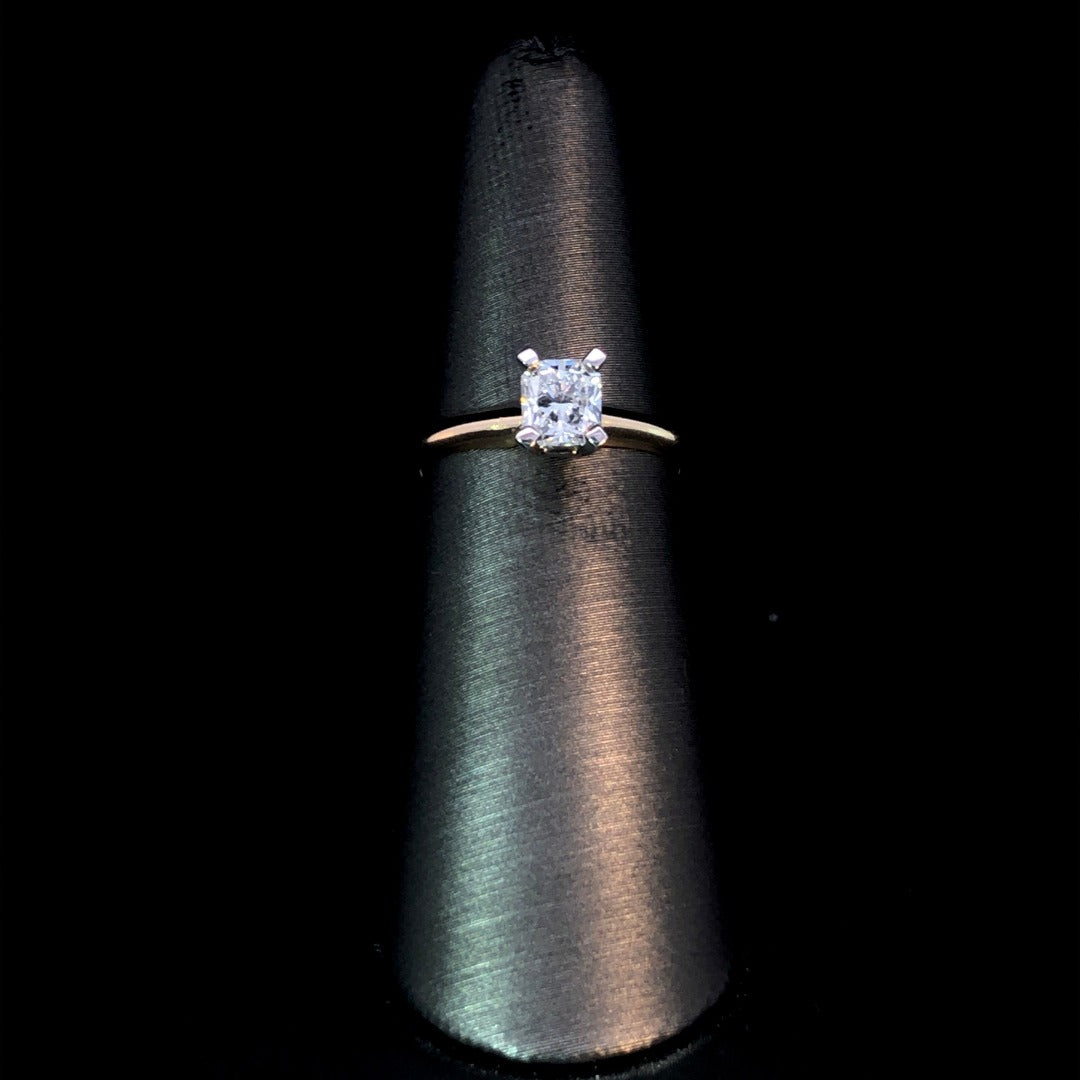 Elevate your style with effortless elegance. Treat yourself to this .82ct solitaire ring, crafted with a certified radiant center stone set in luxurious 2-tone 14kt gold. Let this classic piece be a timeless addition to your collection. This ring is a size 6. If that size is not a perfect fit, first time sizing is free at the time of purchase. Additional sizing fees may apply
