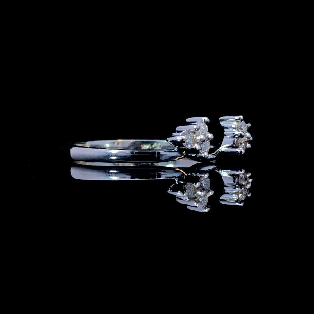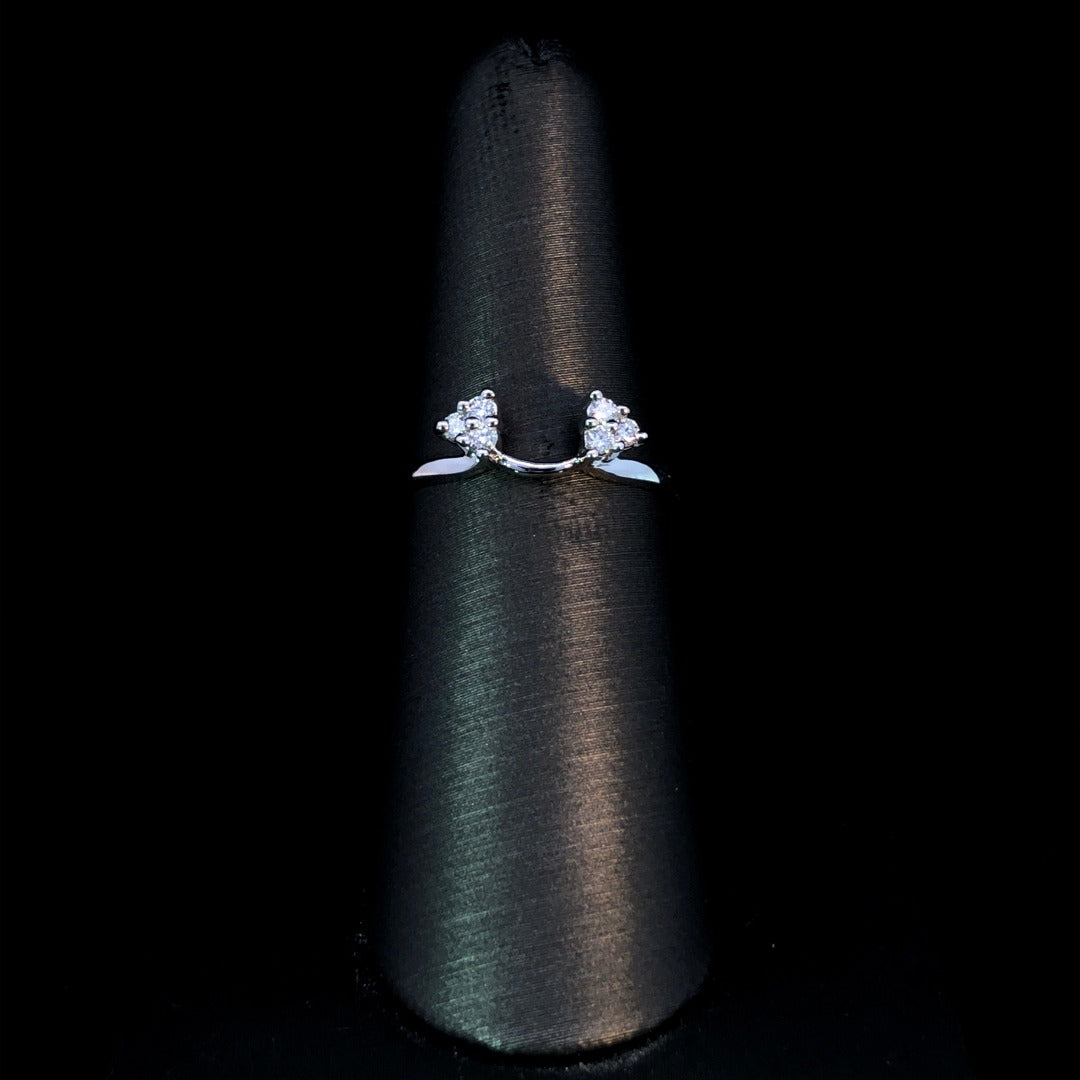 Experience true elegance with this wrap, the perfect complement to your bridal set. Featuring a timeless design with 3 round diamonds in a trillion shape on either side of the head, totaling .15ctw and set in 14kt white gold. Elevate your special day with this exquisite piece. This ring is a size 6.5. If that size is not a perfect fit, first time sizing is free at the time of purchase. Additional sizing fees may apply.
