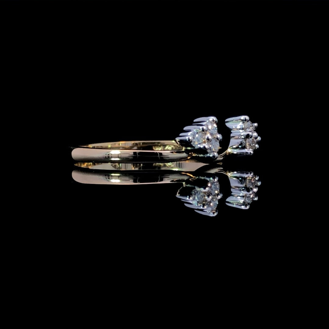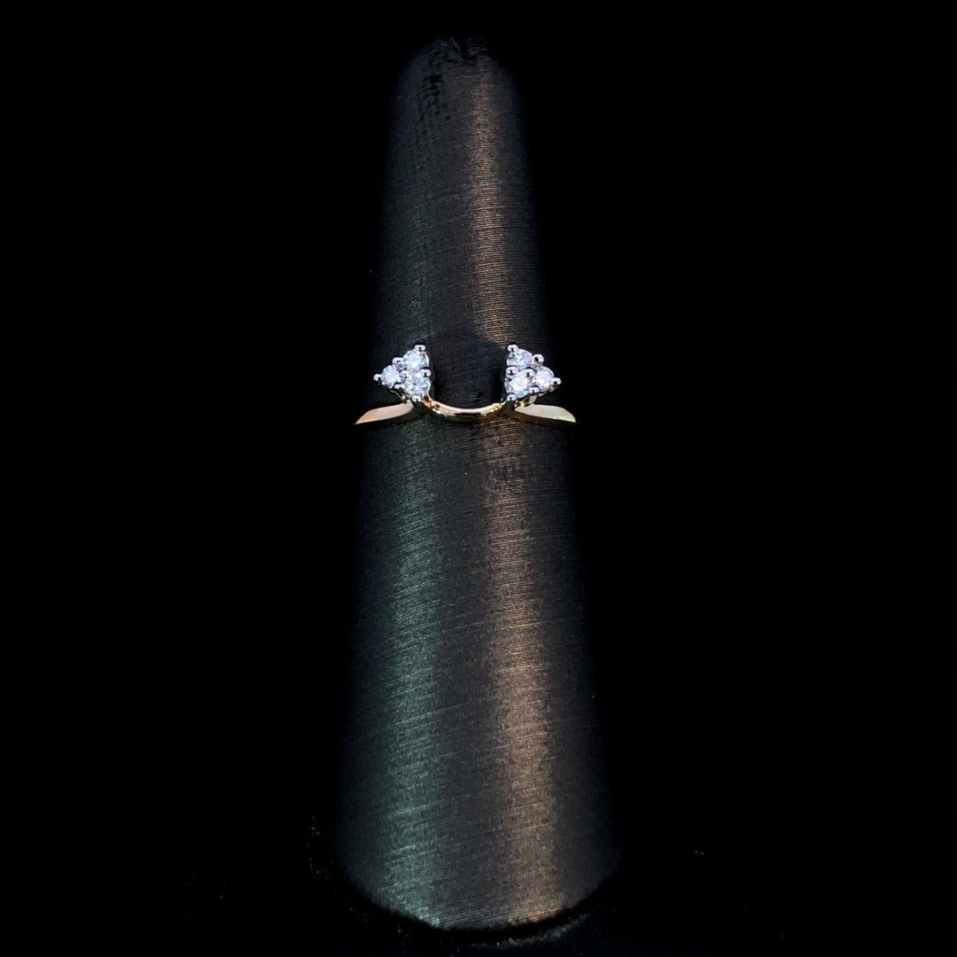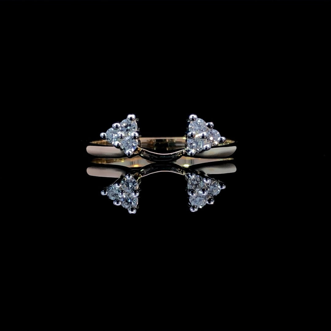 Add glamour to your bridal set with our classic diamond wrap. Featuring .15ctw of round diamonds in a trillion shape on each side of the head, this 14kt 2-tone gold piece is a stunning addition. Elevate your special day with this beautiful choice! This ring is a size 6.5. If that size is not a perfect fit, first time sizing is free at the time of purchase. Additional sizing fees may apply.