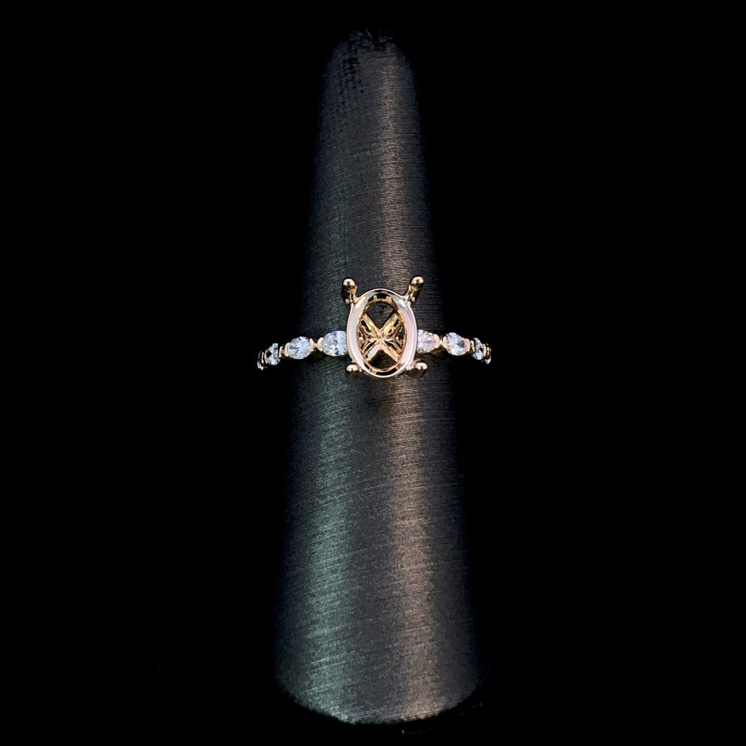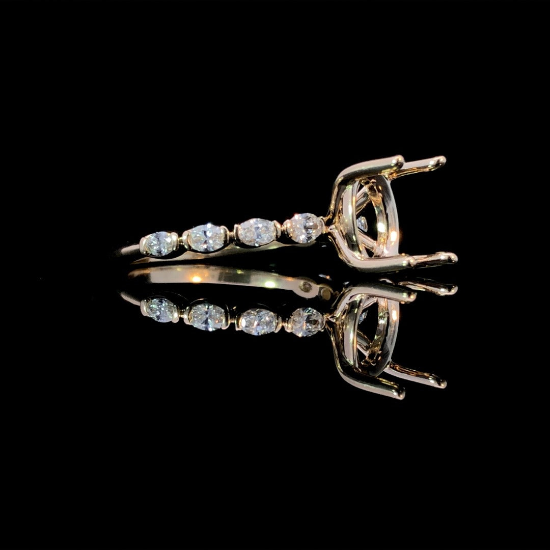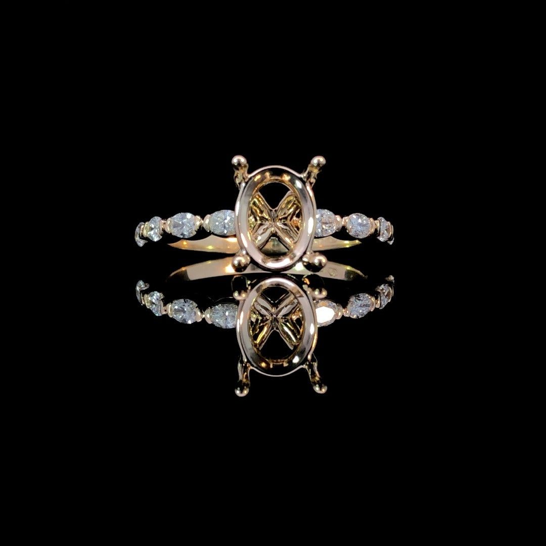 Indulge in exquisite luxury with our diamond semi mount. The 14kt yellow gold band is adorned with .42ctw of marquise diamonds, creating a chic and elegant look. Complete the opulent experience by selecting your own oval center stone from our unmatched collection of loose stones. Price is for the semi mount only. Center stone will be added at an additional cost. This ring is a size 7. If that size is not a perfect fit, first time sizing is free at the time of purchase. Additional sizing fees may apply.