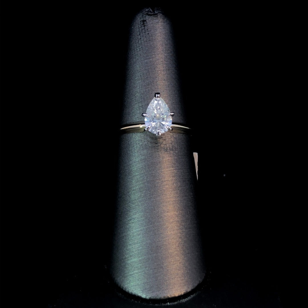 Indulge in luxury with our exquisite solitaire ring. Featuring a stunning 1.00ct pear shaped diamond, set on a 14kt 2-tone gold band, this piece exudes sophistication and elegance. Elevate your style with this exclusive and timeless addition to your jewelry collection. This ring is a size 6.25. If that size is not a perfect fit, first time sizing is free at the time of purchase. Additional sizing fees may apply.