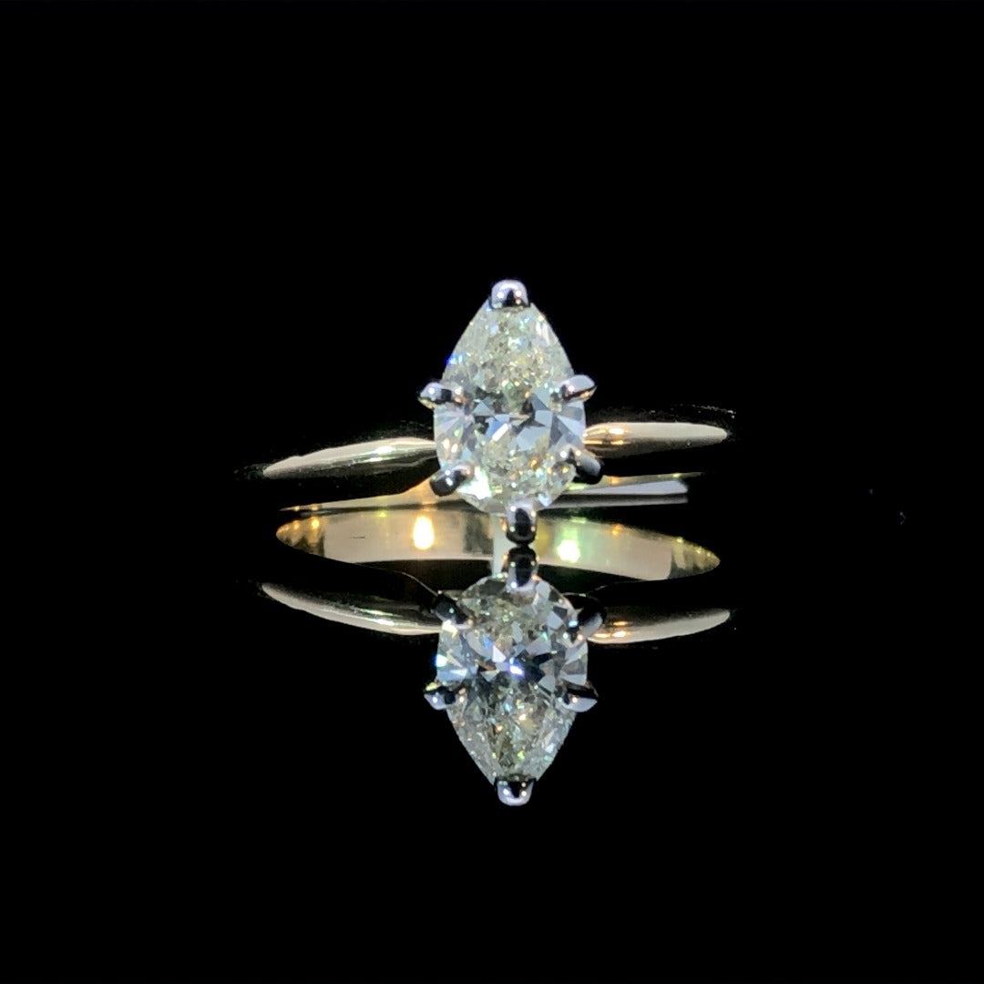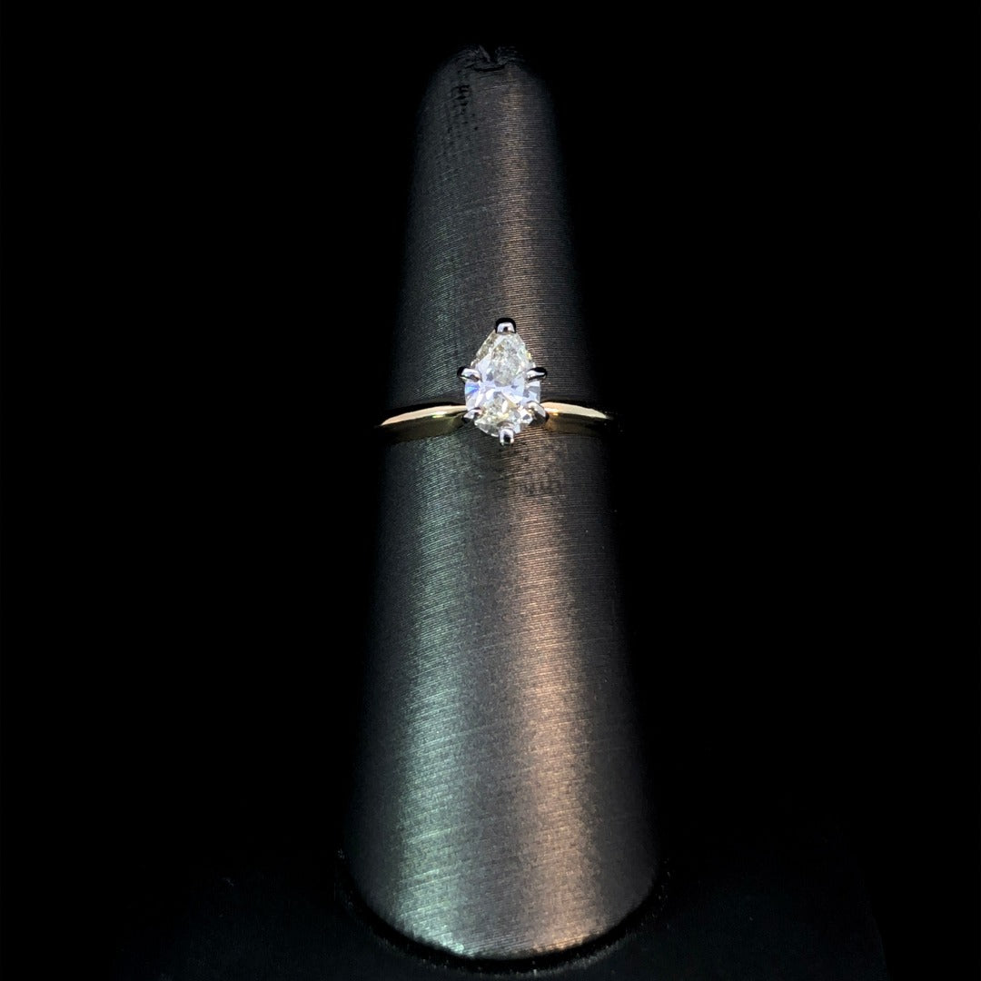 Indulge in timeless elegance with this gorgeous solitaire ring. The .79ct certified pear shape diamond shimmers brilliantly against the 14kt 2-tone gold band. A classic choice for those seeking sophistication and luxury in their jewelry collection. This ring is a size 6. If that size is not a perfect fit, first time sizing is free at the time of purchase. Additional sizing fees may apply.