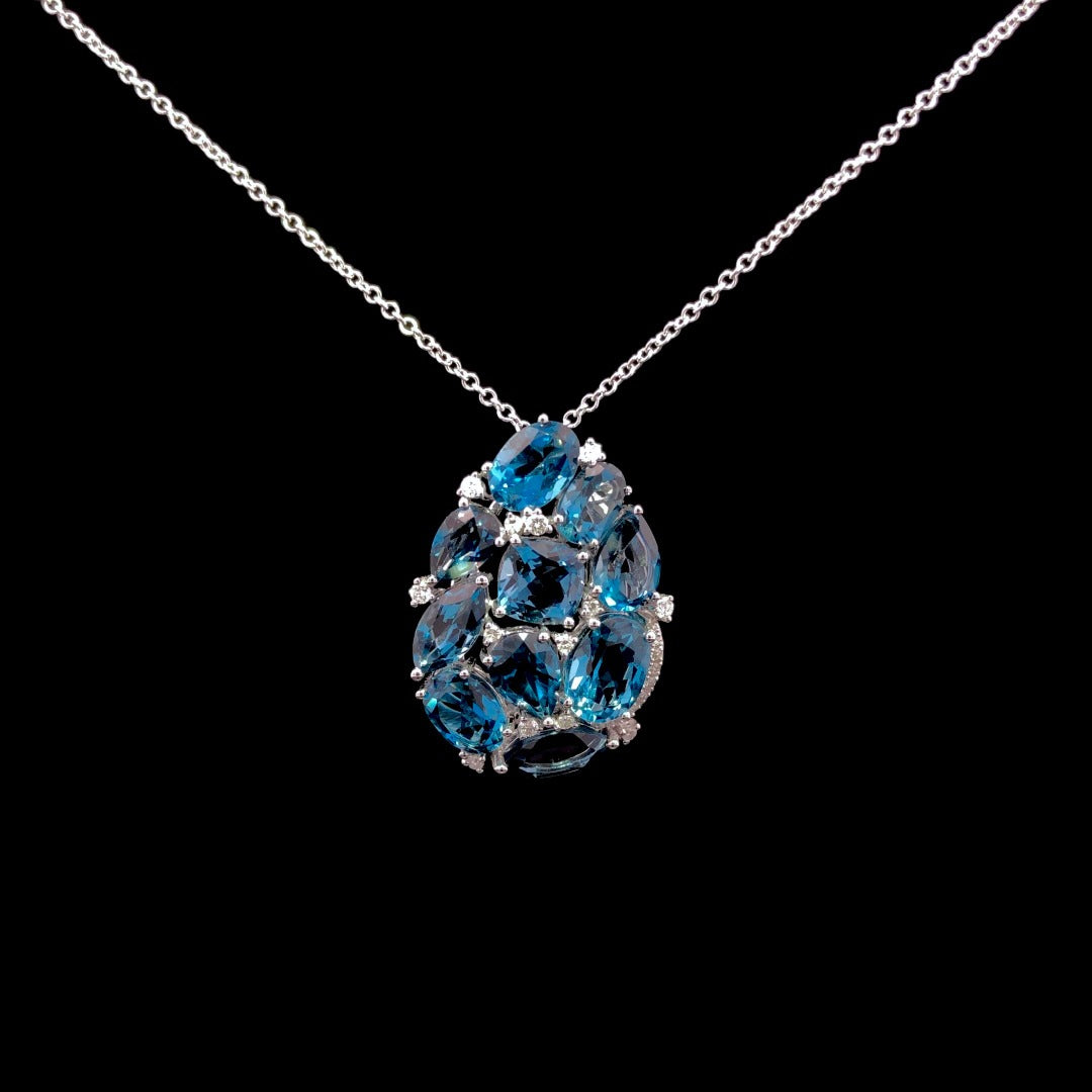 This exquisite pendant showcases 10 ctw of stunning london blue topaz stones and .14ctw of sparkling round diamond accents, all set in elegant 14kt white gold. Elevate any outfit with a touch of sophistication and luxury.