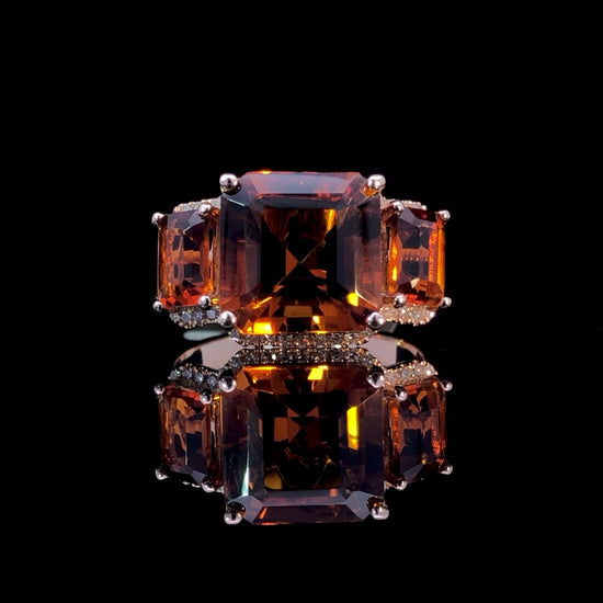 Indulge in luxury with this gorgeous statement piece. Adorned with 3 square citrines totaling 5.90ctw and .18ctw of round diamond accents, all set in 14kt rose gold. Embrace the sophistication and exclusivity of this stunning piece. This ring is a size 6.75. If that size is not