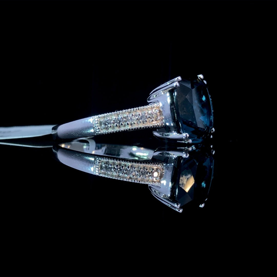 Indulge in luxury with this exquisite ring. The centerpiece is a stunning 4.20ct cushion cut London Blue Topaz, enhanced by sparkling round diamond accents (.06ctw) and delicate milgrain detailing. Crafted in 14kt white gold, this ring is a truly sophisticated addition to your collection. This ring is a size 7. If that size is not a perfect fit, first time sizing is free at the time of purchase. Additional sizing fees may apply.