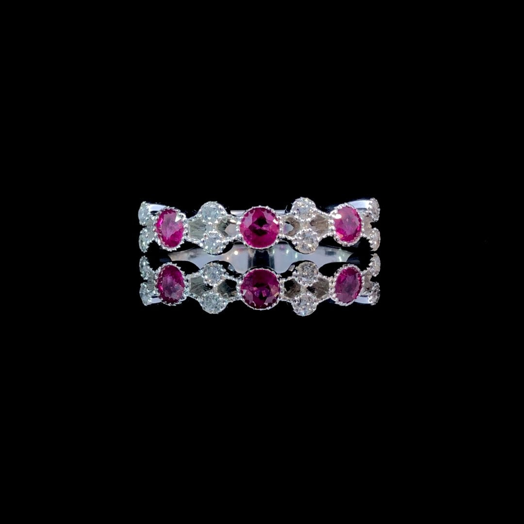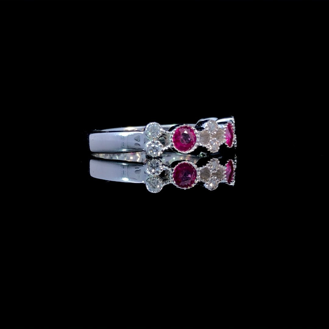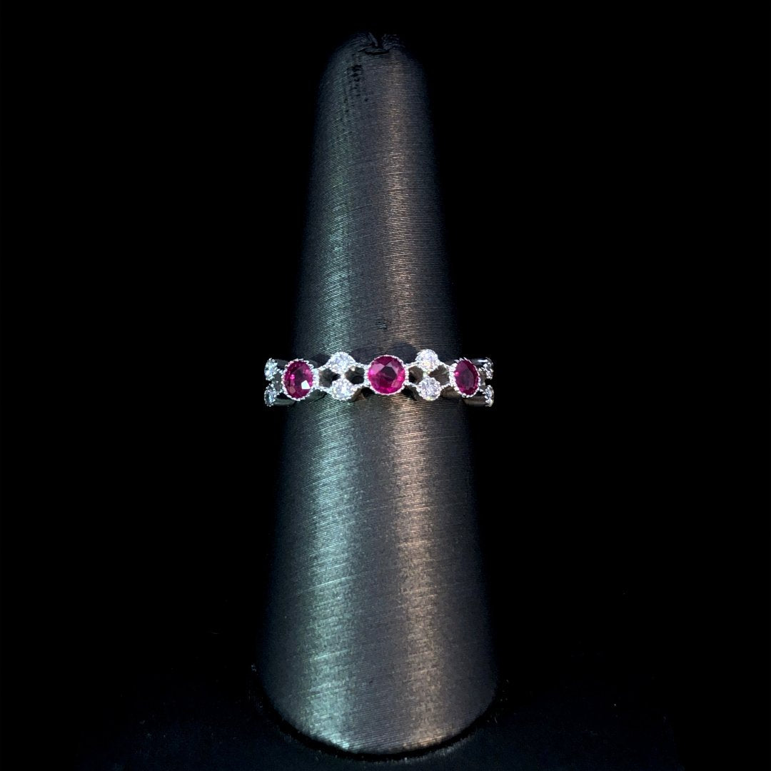 Elevate your style with this ring. Versatile and stunning, wear it alone or stack it for a bold look. The chic milgrain design showcases .62ctw of round rubies and diamonds set in 14kt white gold. Make a statement with this unique piece. This ring is a size 7.25. If that size is not a perfect fit, first time sizing is free at the time of purchase. Additional sizing fees may apply.