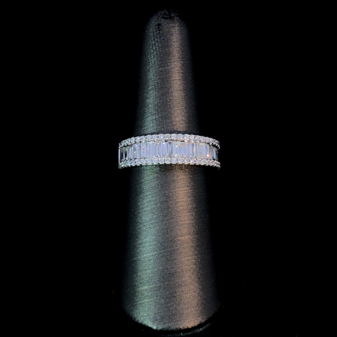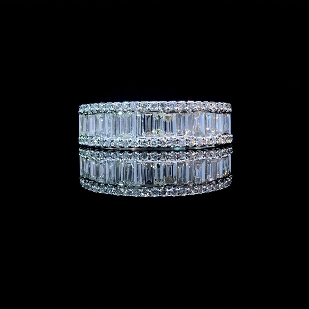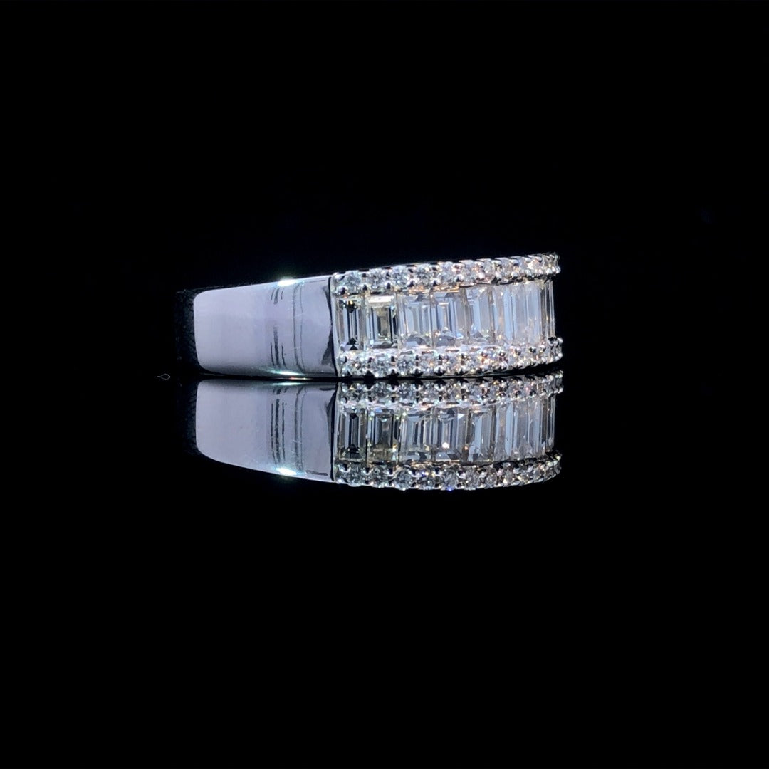 Upgrade your jewelry collection with this stunning diamond band that boasts 1.08ctw of round and baguette diamonds set in lustrous 14kt white gold. Add a touch of elegance and sparkle to any outfit with this dazzling piece! This ring is a size 7. If that size is not a perfect fit, first time sizing is free at the time of purchase. Additional sizing fees may apply.