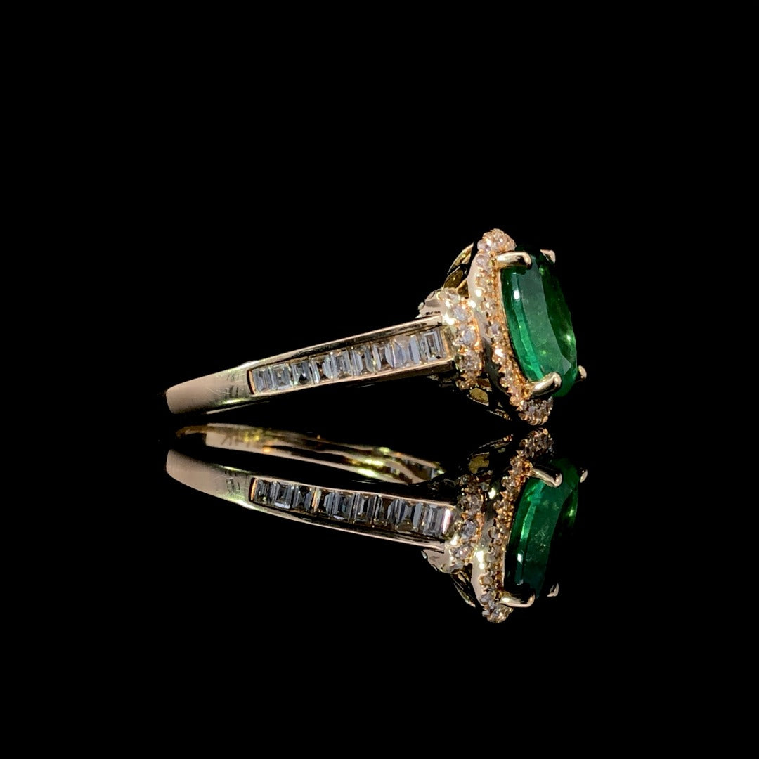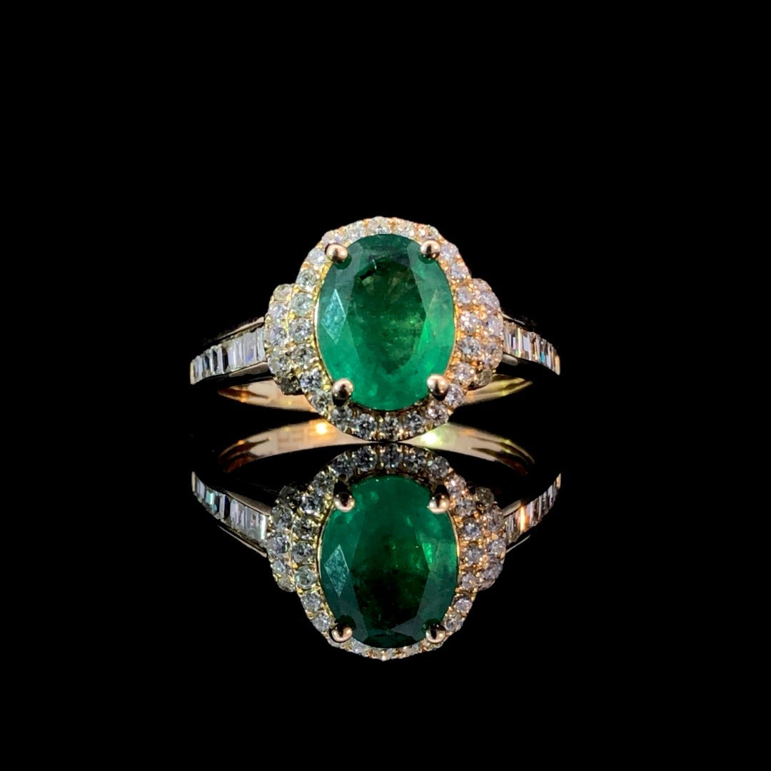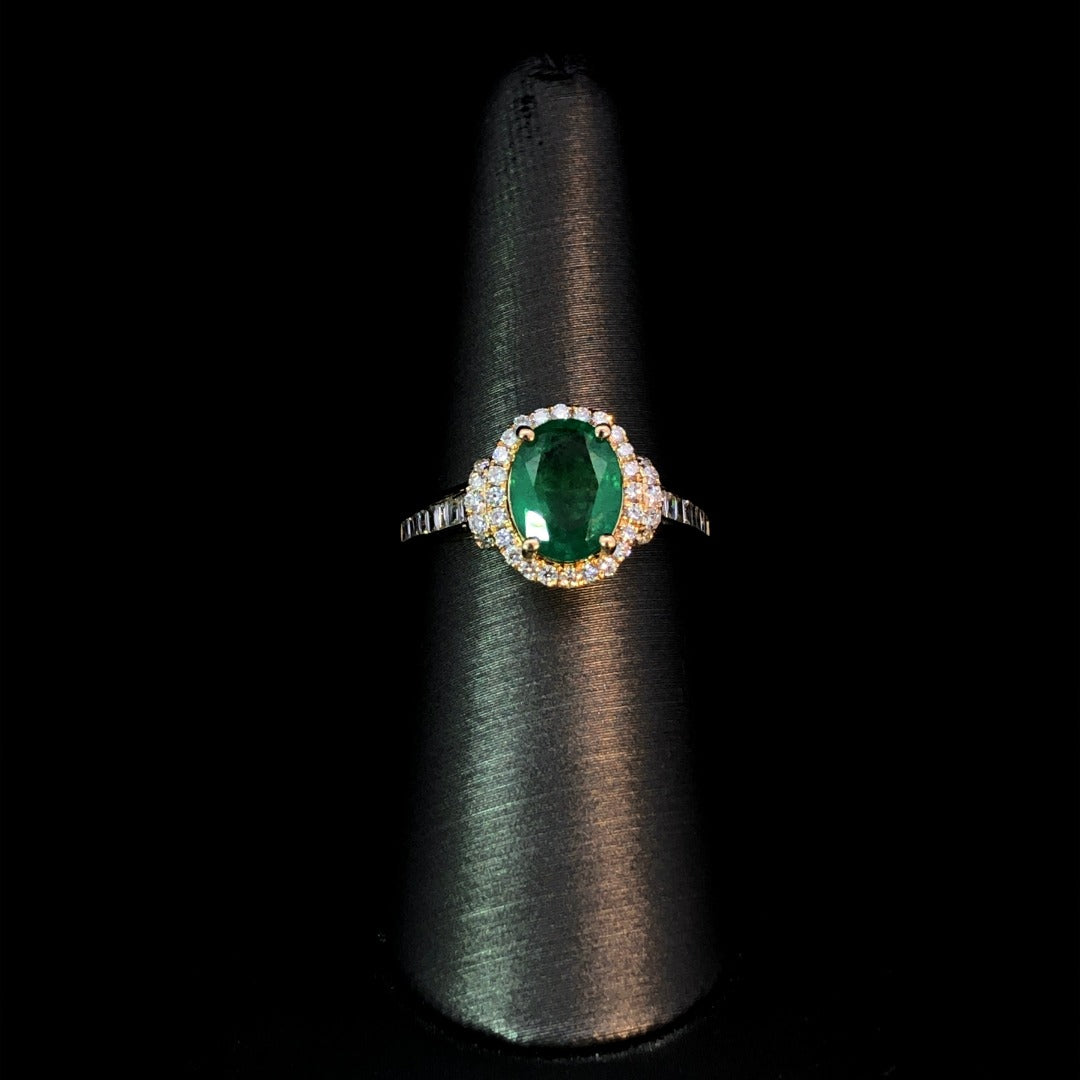 Experience the luxurious feeling of royalty with our stunning 2.04ctw emerald and diamond ring. The oval shaped 1.52ct emerald is surrounded by dazzling round accent and baguette diamonds, all set in 14kt yellow gold. With a total diamond weight of .52ctw and a total carat weight of 2.04ctw, this ring is a true showstopper. Elevate your style and make a statement with this beautiful piece. This ring is a size 7. If that size is not a perfect fit, first time sizing is free at the time of purchase. Additional sizing fees may apply.