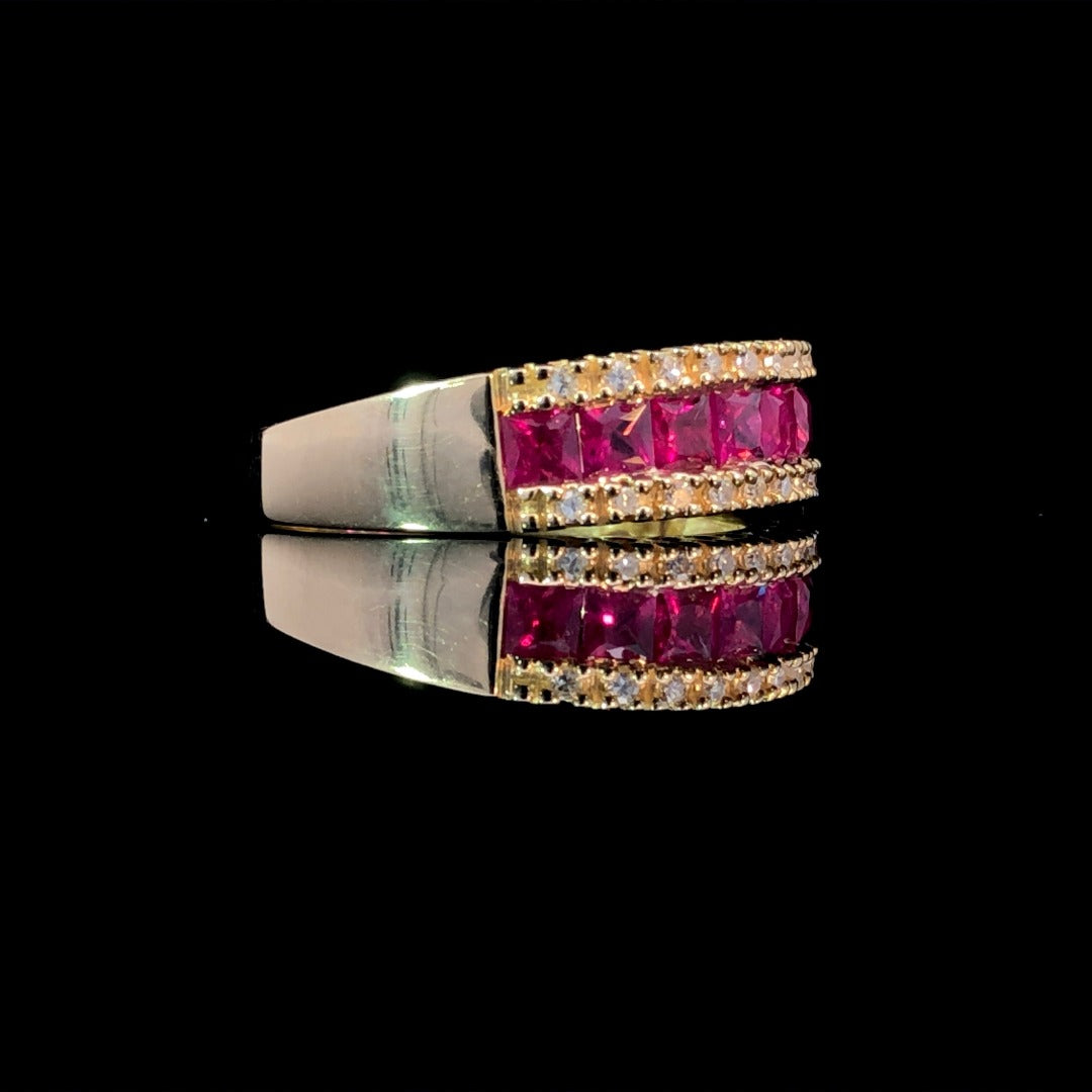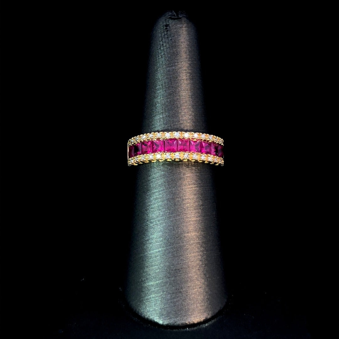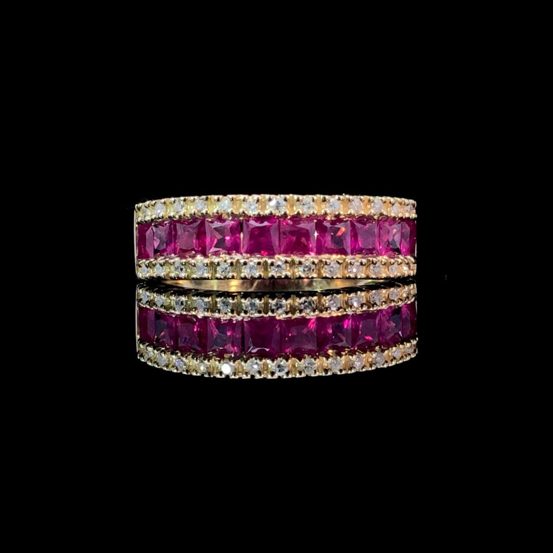 Elevate your style with our stunning band. The 1.33ctw of rubies at the center are accentuated by .13ctw of round diamonds, creating an exquisite contrast. Crafted in 14kt yellow gold, this band boasts a total weight of 1.46ctw of diamonds and gemstones. Make a statement with this eye-catching design. This ring is a size 7. If that size is not a perfect fit, first time sizing is free at the time of purchase. Additional sizing fees may apply.