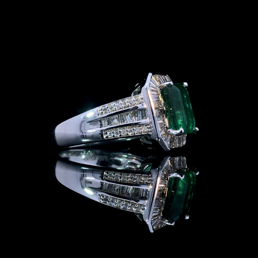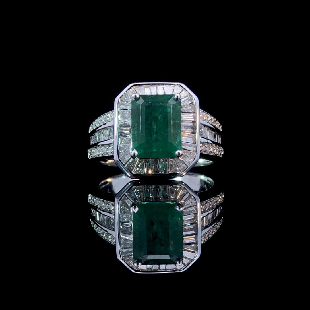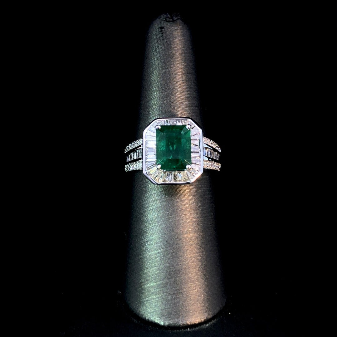 Experience regal elegance with this beautiful ring. Featuring a stunning 2.19ct Emerald center stone, surrounded by a halo of sparkling baguette diamonds, and a diamond-adorned band for a total diamond weight of .81ctw. Crafted in 14kt white gold, this impressive piece shines with a total of 3.00ctw. Elevate your style with this captivating treasure. This ring is a size 7.25. If that size is not a perfect fit, first time sizing is free at the time of purchase. Additional sizing fees may apply.