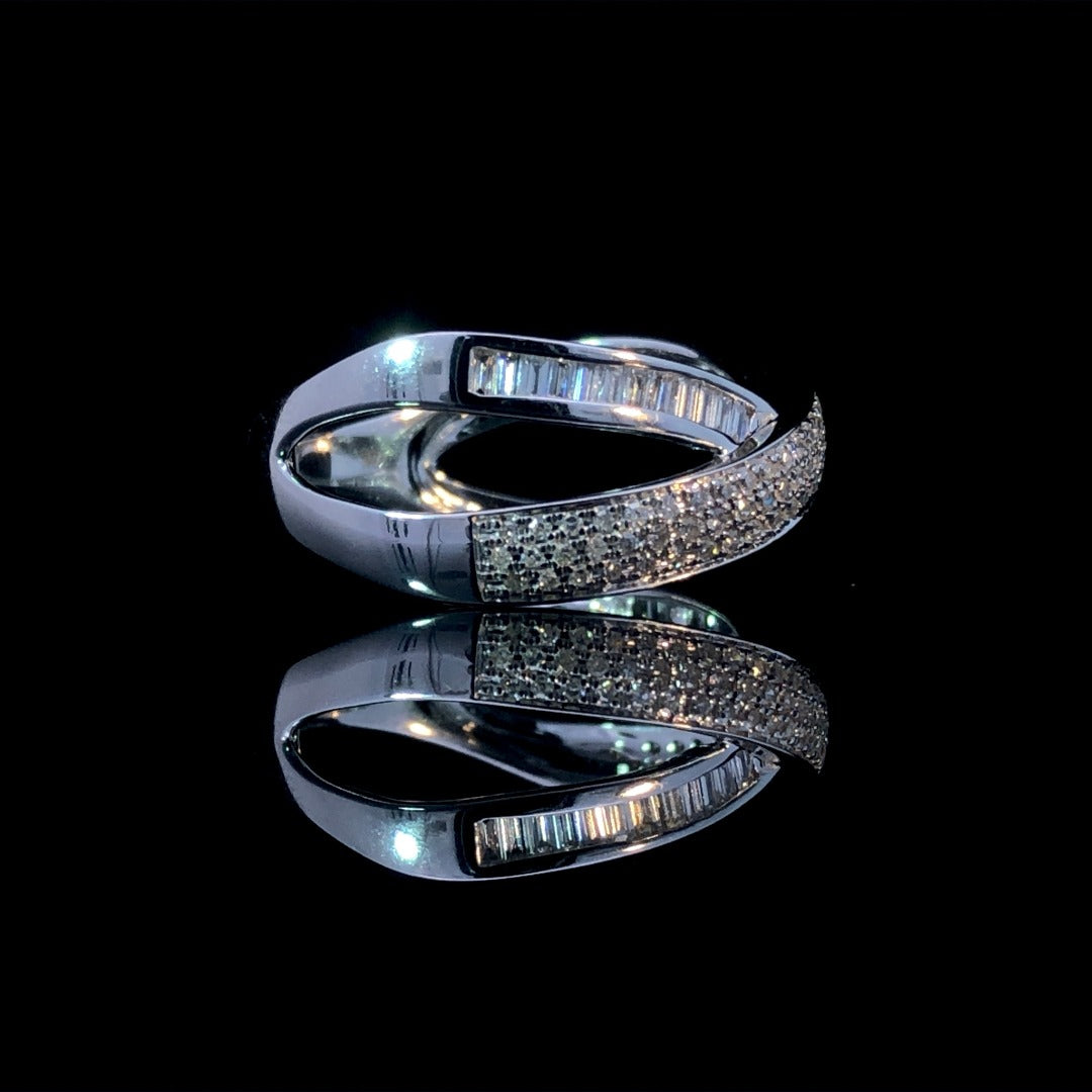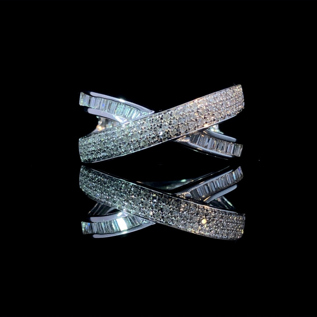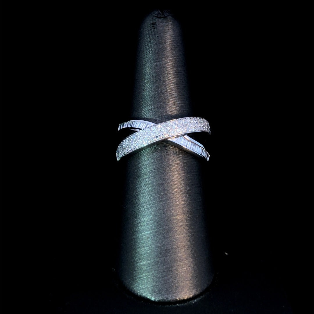 Experience the ultimate in luxury and elegance with our stunning diamond ring! Its unique "X" design showcases sparkling round pave set diamonds and baguette diamonds, totaling .63ctw, set in sleek 14kt white gold. Make a statement and elevate any outfit with this exquisite piece. This ring is a size 7. If that size is not a perfect fit, first time sizing is free at the time of purchase. Additional sizing fees may apply.