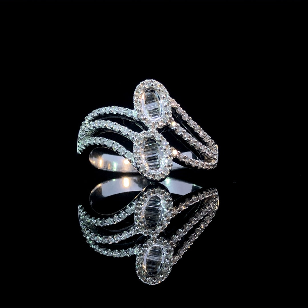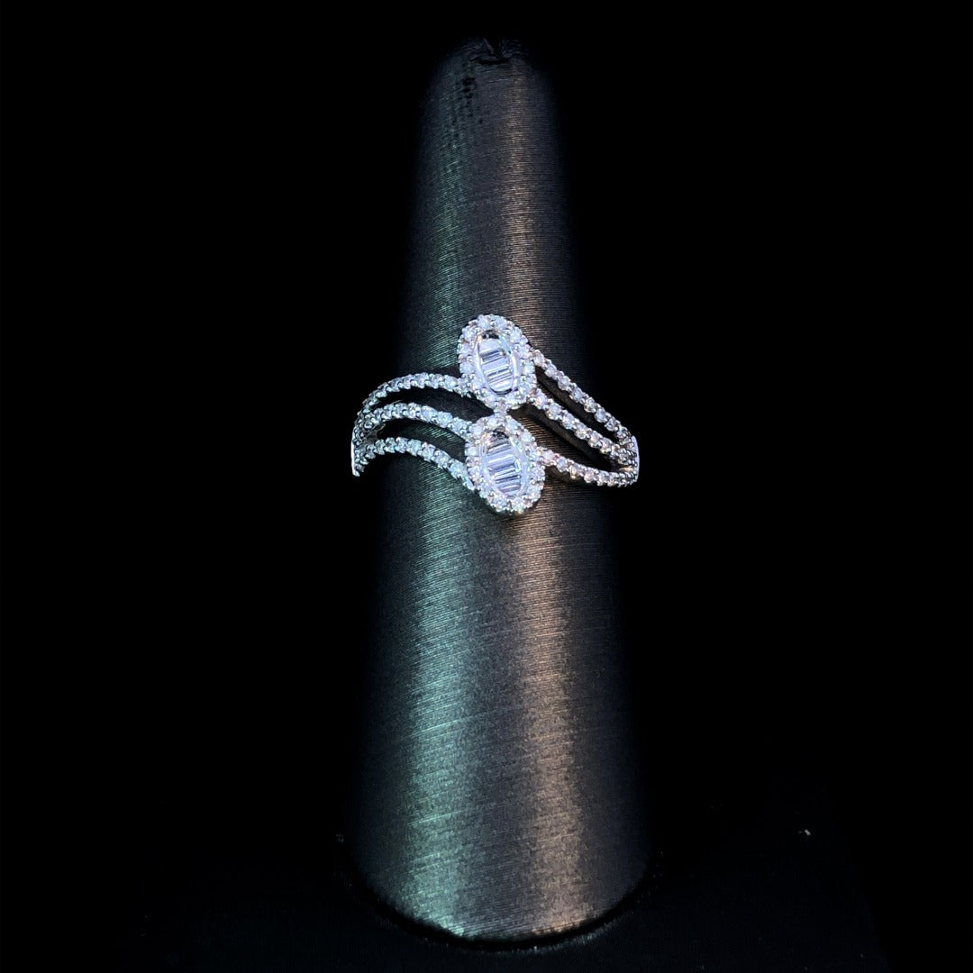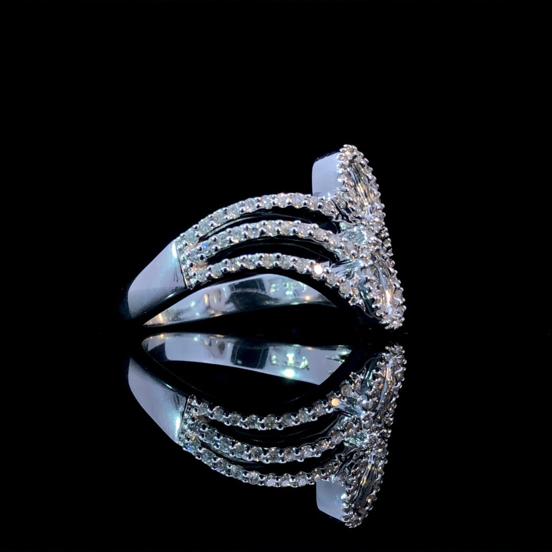 Set your style apart with this dazzling ring. Featuring a stunning combination of round and baguette diamonds totaling .56ctw, this 14kt white gold piece's design is sure to turn heads and start conversations. Elevate your look with this one-of-a-kind ring. This ring is a size 7. If that size is not a perfect fit, first time sizing is free at the time of purchase. Additional sizing fees may apply.