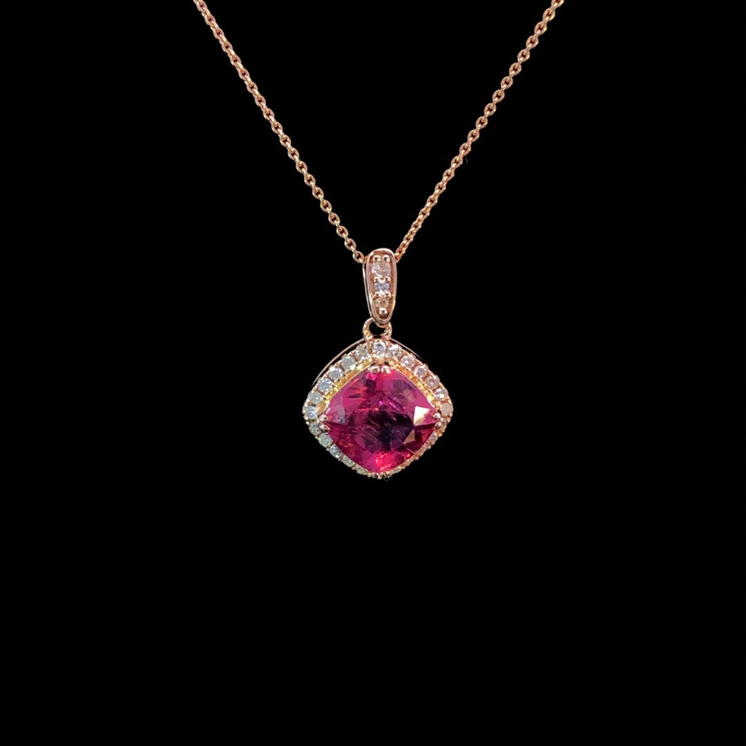 Experience the captivating beauty of this pendant. Featuring a 2.28ct cushion cut Rubellite surrounded by .15ctw of sparkling round diamonds, all set in luxurious 14kt rose gold. Elevate any look with this stunning piece. Chain not included.