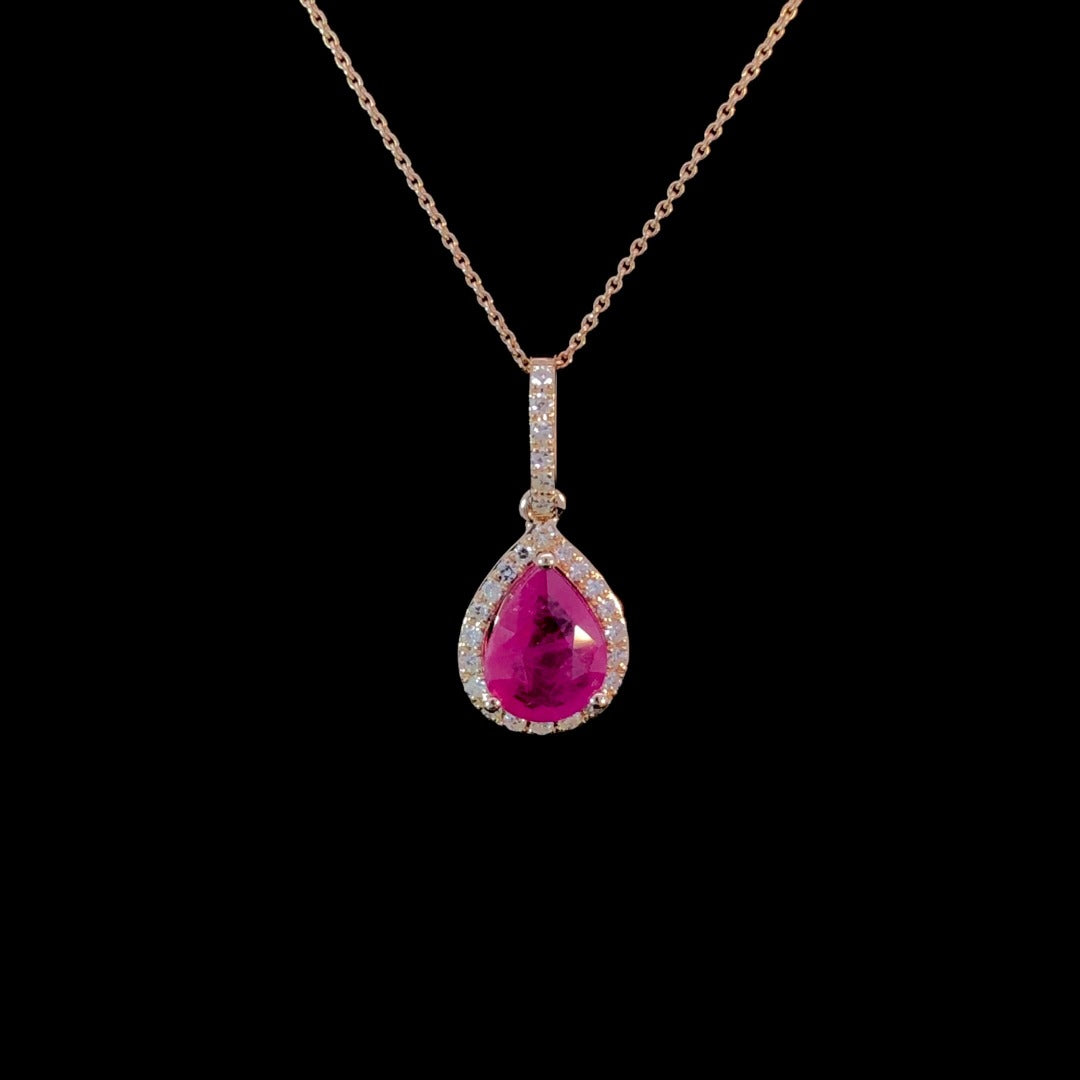 Add a pop of color to your jewelry box with our stunning ruby and diamond pendant. Featuring a .95ct pear shaped ruby, surrounded by a .12ctw diamond halo and bail, set in 18kt rose gold. Elevate any outfit with this classic design. Chain is not included.