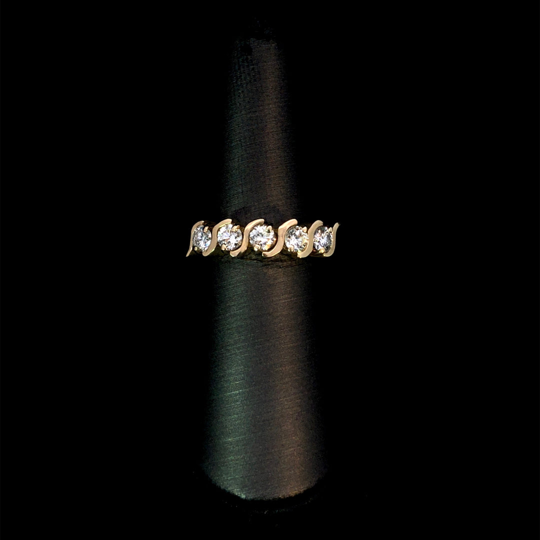 Feel confident and stylish with this diamond band. The .90ctw of round diamonds are set in 14kt yellow gold, accented with curved bars for a unique look. Add a touch of elegance to any outfit. This ring is a size 6.5. If that size is not a perfect fit, first time sizing is free at the time of purchase. Additional sizing fees may apply.