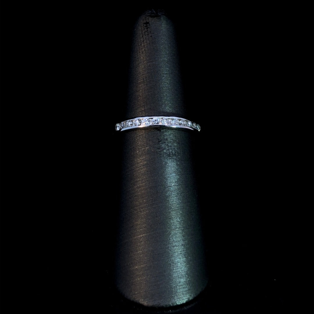 Elevate your style with our stunning diamond band! Sparkling .24ctw of round diamonds are channel set in luxurious 14kt white gold for a classic and sophisticated look. Effortlessly add a touch of sparkle and elegance to any outfit with this timeless piece. This ring is a size 6. If that size is not a perfect fit, first time sizing is free at the time of purchase. Additional sizing fees may apply.