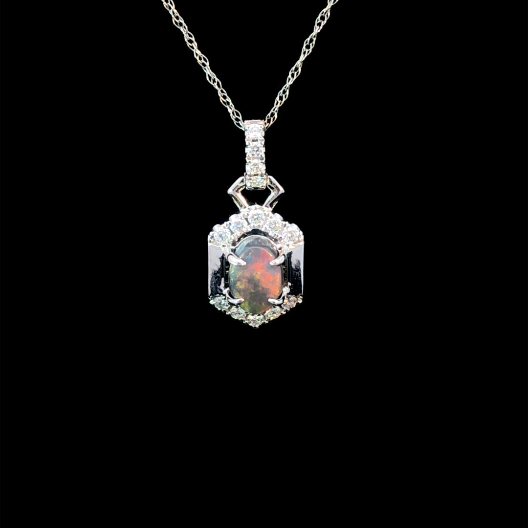 This dazzling pendant showcases a rare .67ct black opal, brilliantly complemented by .18ctw of round diamond accents, all set in lustrous 14kt white gold. Elevate any outfit with this unique piece and make a statement that will captivate all who see it. Chain is not included.