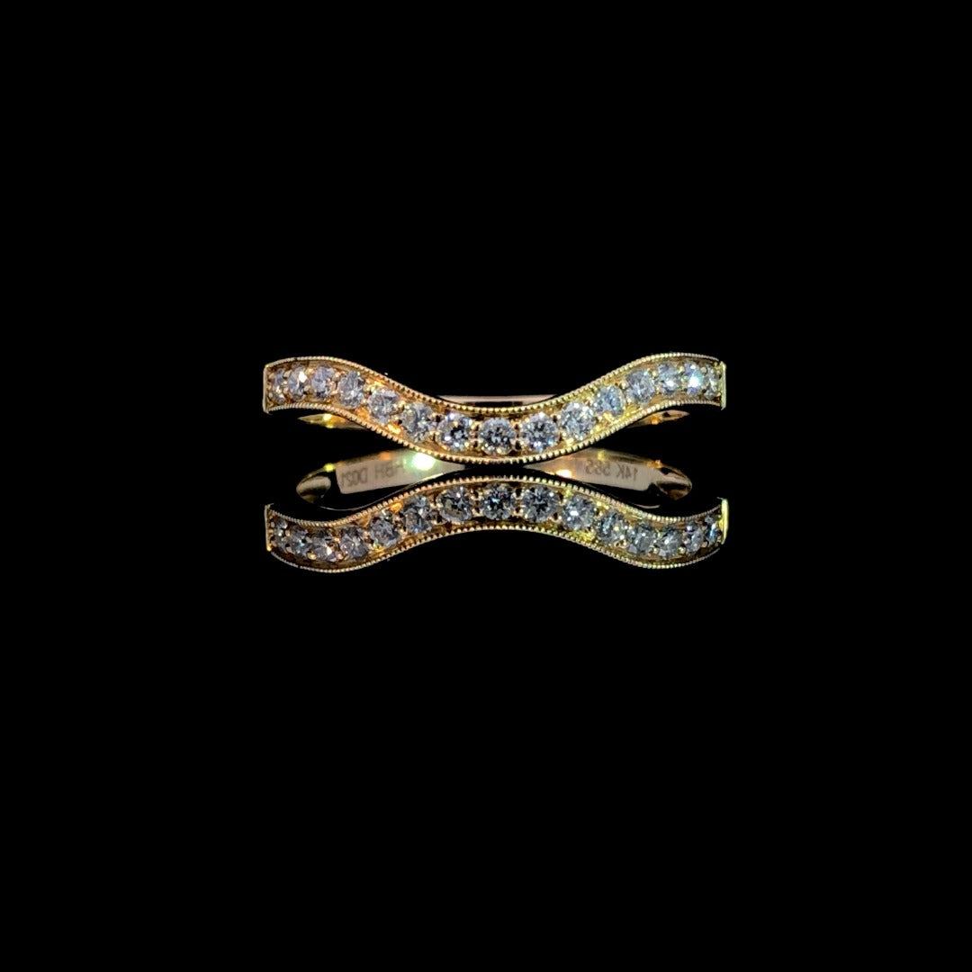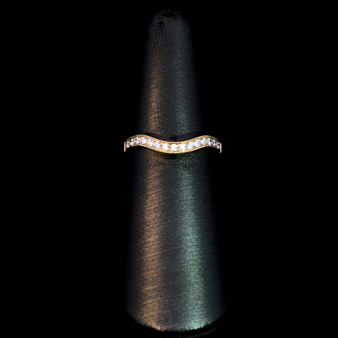Elevate your engagement ring with our beautiful diamond contour band, specifically designed to complement its unique curvature. Crafted with .22ctw of sparkling round diamonds and delicate milgrain details, this band adds a touch of elegance to any look. Made with 14kt yellow gold for lasting beauty. This ring is a size 6.5. If that size is not a perfect fit, first time sizing is free at the time of purchase. Additional sizing fees may apply.