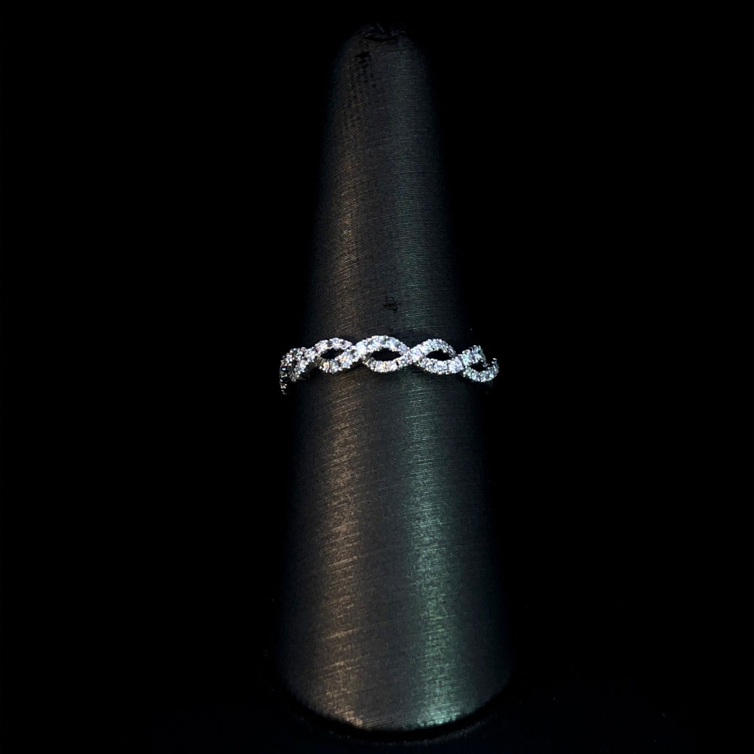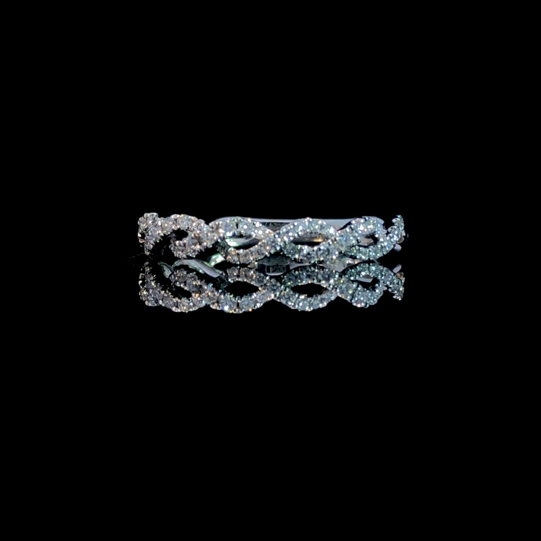 Elevate your style with our stunning diamond band! Featuring a unique twist design, this band is crafted with .24ctw of sparkling round diamonds set in 14kt white gold. Make a statement and add a touch of elegance to any outfit with this beautiful piece. This ring is a size 7.25. If that size is not a perfect fit, first time sizing is free at the time of purchase. Additional sizing fees may apply.