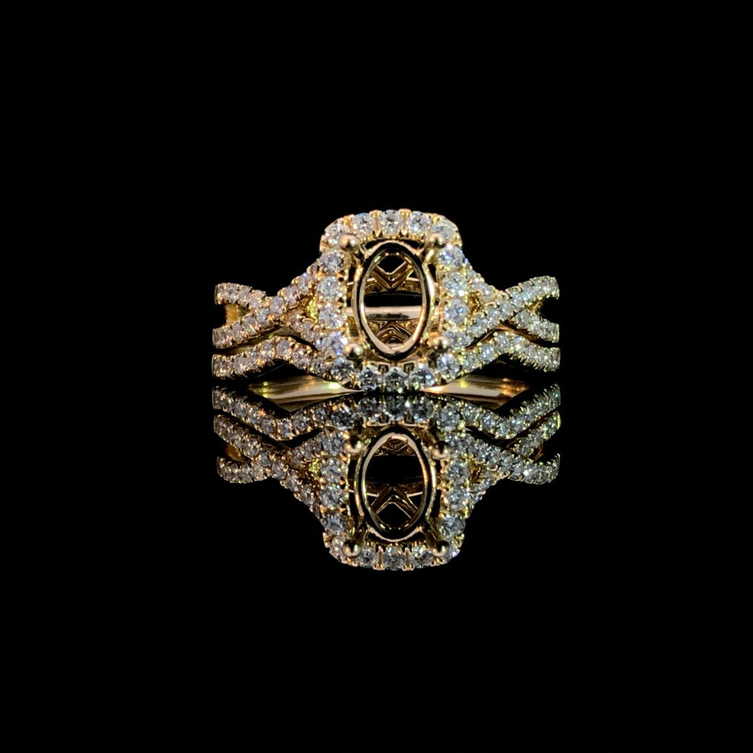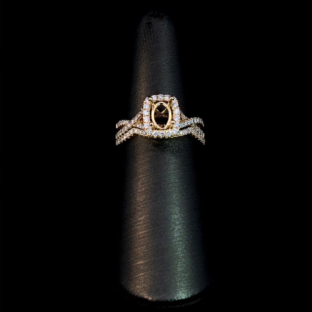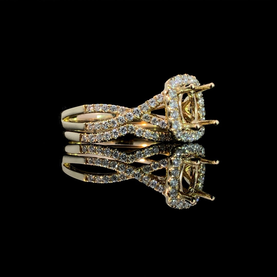 This exquisite 14kt yellow gold semi mount boasts a diamond halo and crossing shank with a total weight of .39ctw. Its elegant design makes it the perfect choice for any special occasion. For a complete and glamorous look, pair it with the matching contour band (sold separately) featuring .14ctw of round diamonds. Price is for the semi mount only. Center stone and band will be added at an additional cost. This ring is a size 6.5. If that size is not a perfect fit, first time sizing is free at the time of purchase. Additional sizing fees may apply.