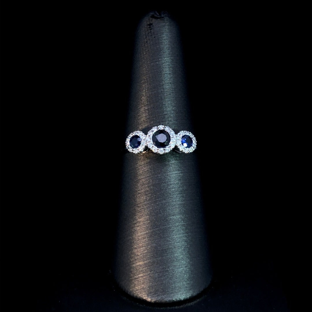 Elevate your look with this stunning ring. The 3 stone design features 3 round sapphires totaling .60 ctw, each encircled by a diamond halo for a total weight of .13 ctw of round diamonds. The smooth 18 kt white gold band adds a touch of elegance. A simple, yet sophisticated choice for any occasion. This ring is a size 7. If that size is not a perfect fit, first time sizing is free at the time of purchase. Additional sizing fees may apply.