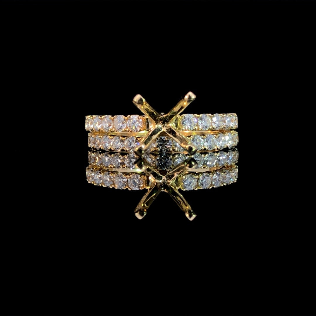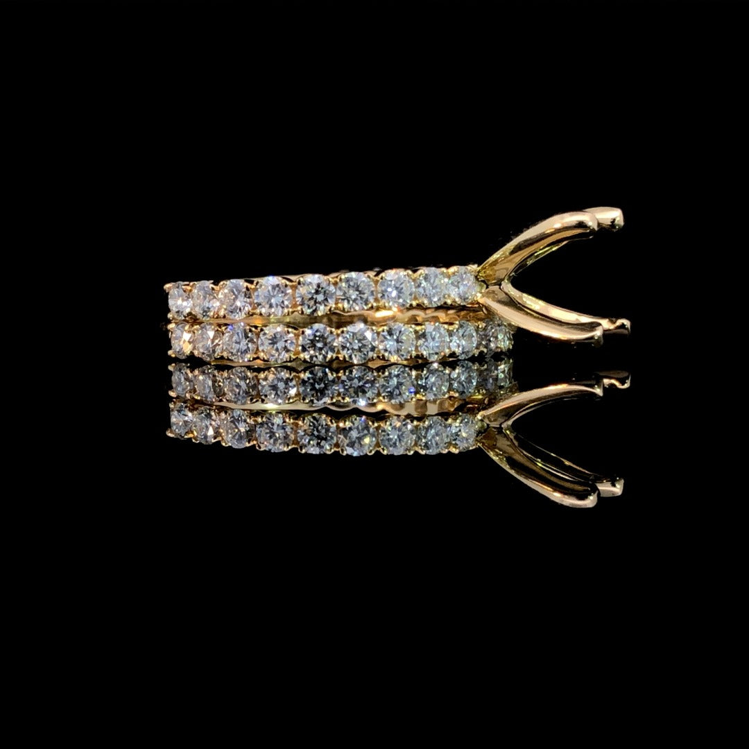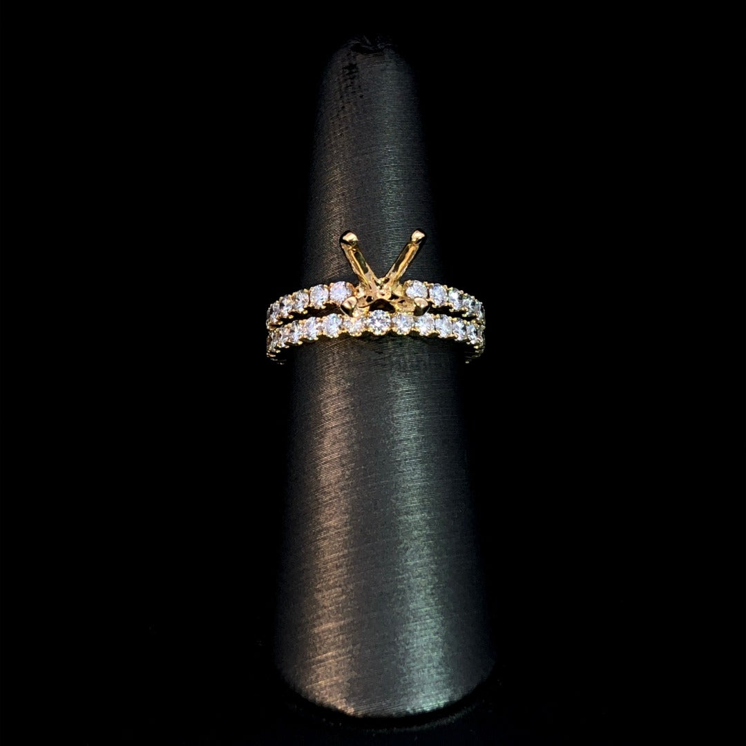 Elevate your bridal look with this classic diamond semi mount. Crafted in 14kt yellow gold, this timeless piece features a stunning .68ctw of round diamonds along the band. Choose from our selection of loose stones to be your perfect center stone. Complete the set with the matching .77ctw diamond band (sold separately). Price is for the semi mount only. Center stone and band will be added at an additional cost. This ring is a size 6.5. If that size is not a perfect fit, first time sizing is free at the time of purchase. Additional sizing fees may apply.