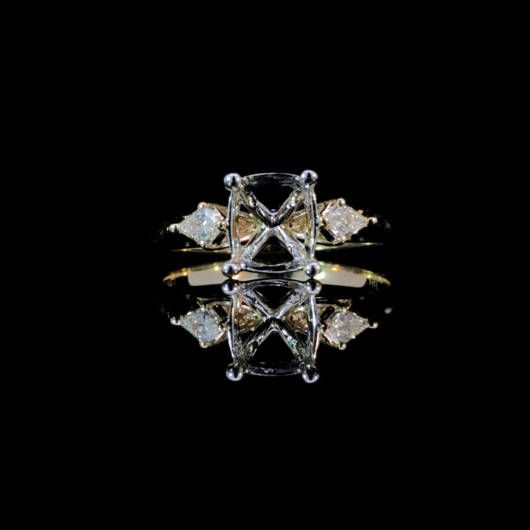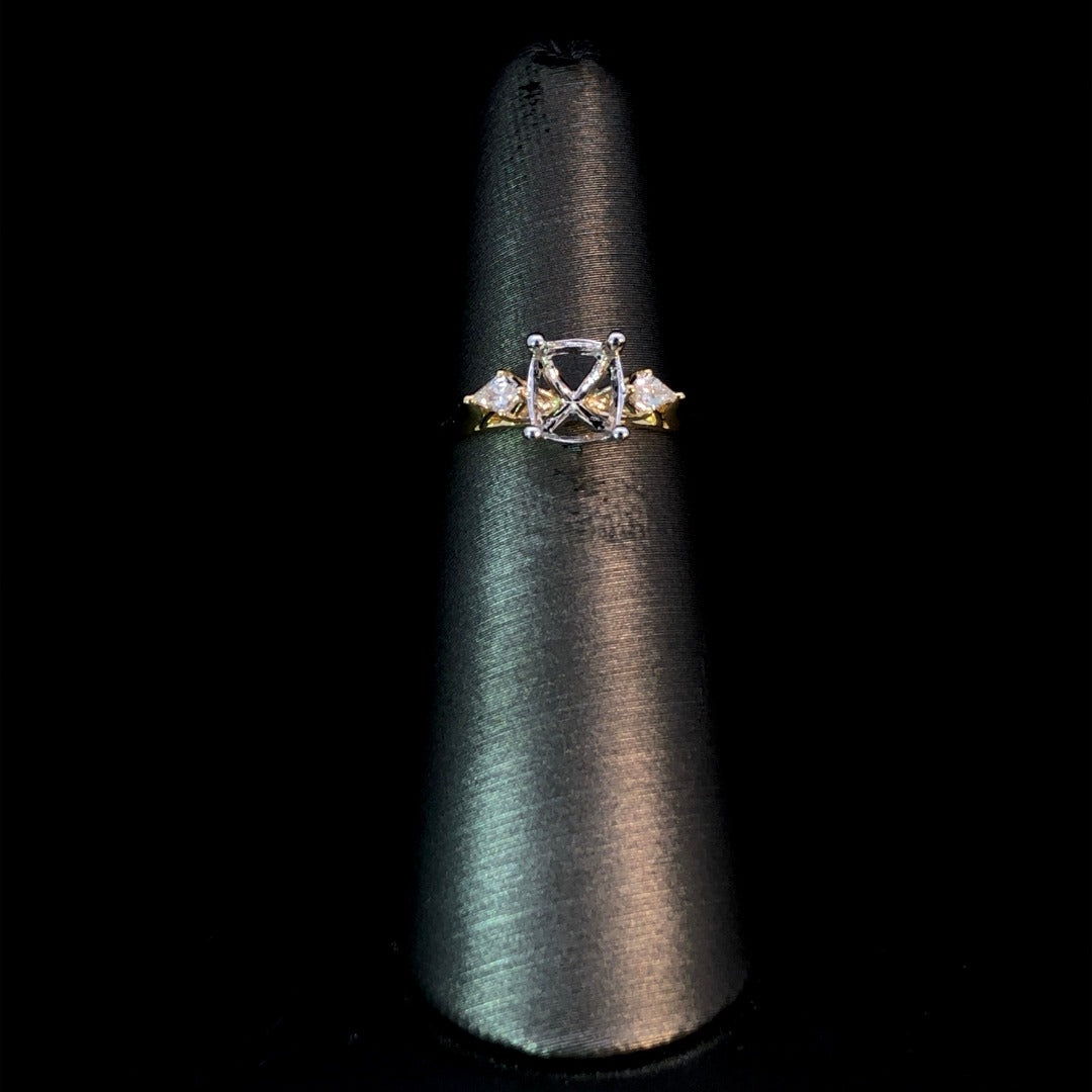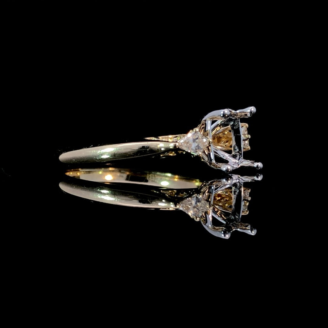This luxurious diamond semi mount is the perfect showcase for your chosen center stone, surrounded by 2 kite shaped diamonds totaling .20ctw. Designed in stunning 14kt 2-tone gold for the ultimate in elegance and sophistication. Choose from our unparalleled selection of loose stones to create a truly one-of-a-kind piece. Price is for the semi mount only. Center stone will be added at an additional cost. This ring is a size 5.5. If that size is not a perfect fit, first time sizing is free at the time of purchase. Additional sizing fees may apply.