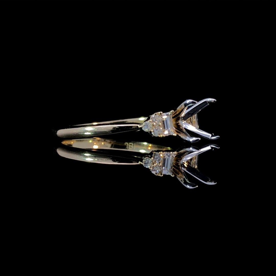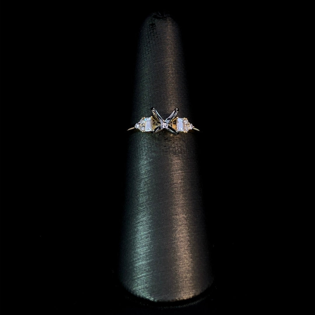 Create your own unique piece with our stunning diamond semi mount. Featuring .11ctw of baguette side stones and .07ctw of round diamonds set in a captivating trillion shape, this 14kt yellow gold design offers unparalleled sparkle. Select your perfect center stone from our wide selection for a truly stunning statement. Price is for the semi mount only. Center stone will be added at an additional cost. This ring is a size 6. If that size is not a perfect fit, first time sizing is free at the time of purchase. Additional sizing fees may apply.