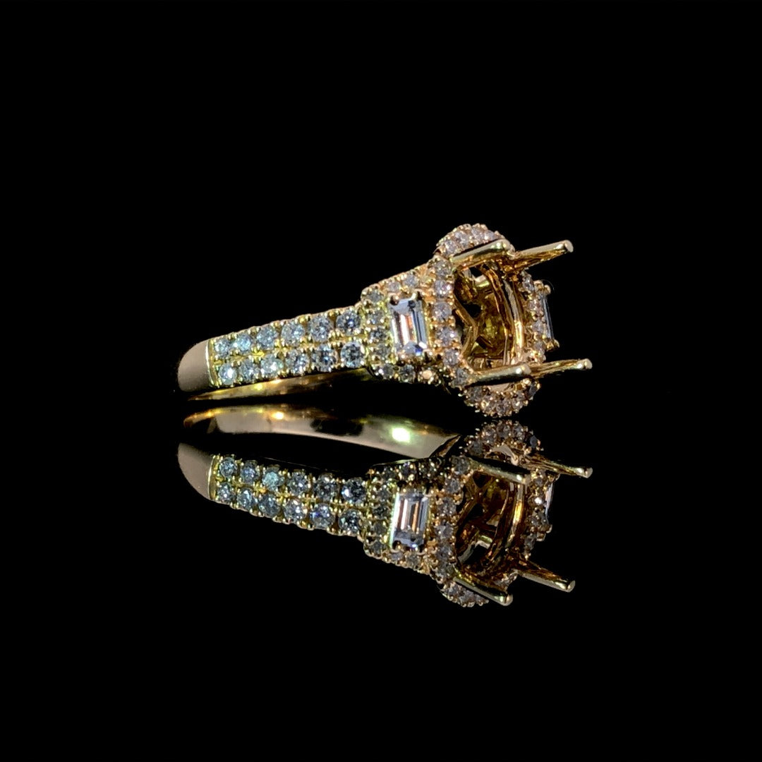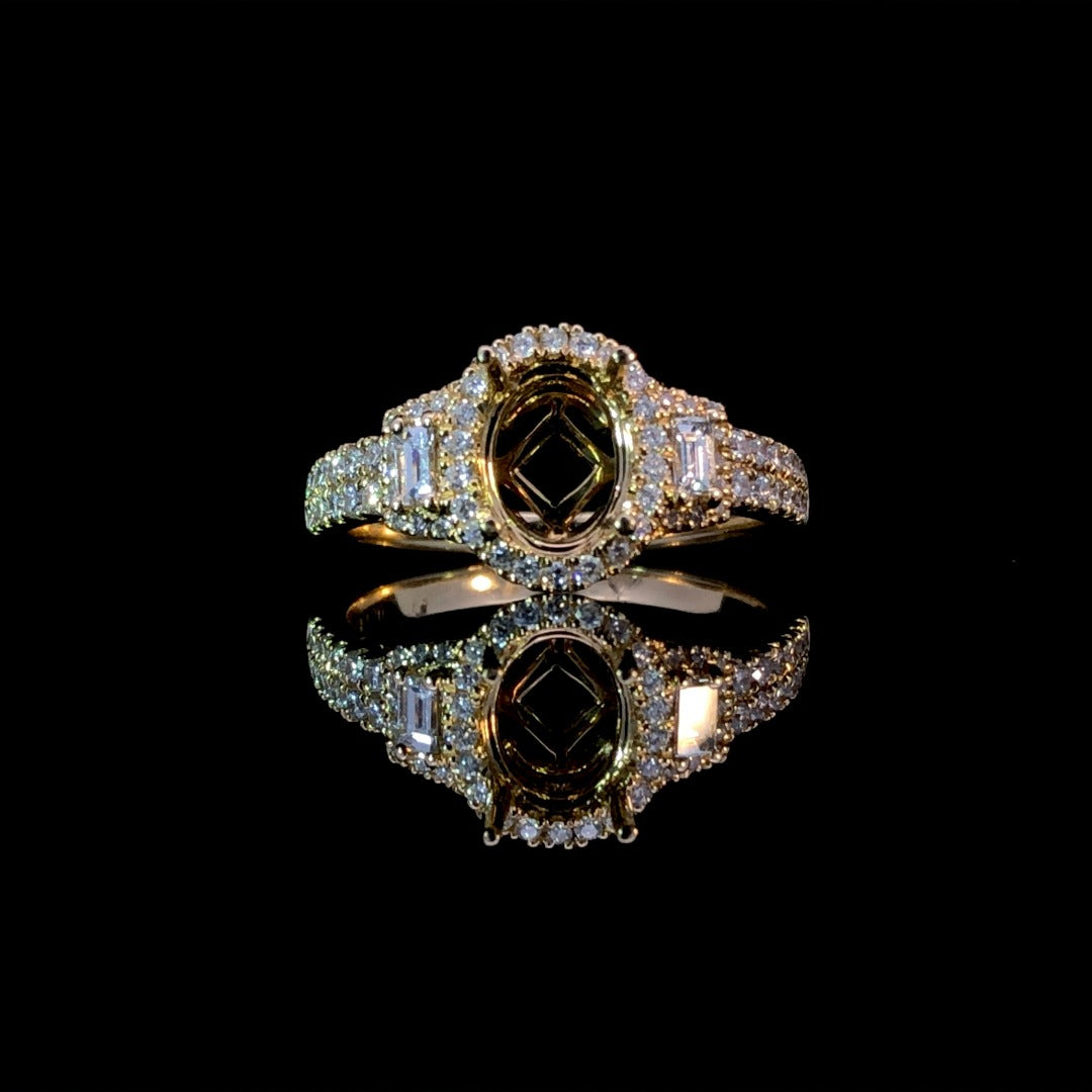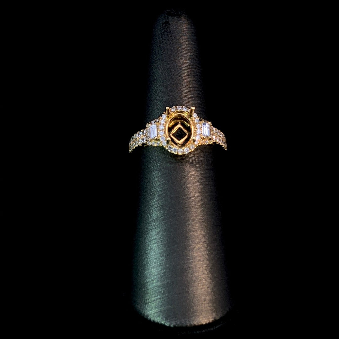 Indulge in this stunning diamond semi-mount ring, an exquisite combination of an oval halo, .13ctw of baguette side stones, and a double band adorned with round diamonds. Made of 18kt yellow gold, this piece sparkles with a total of .48ctw of diamonds. Personalize it with a center stone from our premium selection. Bring your dream ring to life! Price is for the semi mount only. Center stone will be added at an additional cost. This ring is a size 7.25. If that size is not a perfect fit, first time sizing is free at the time of purchase. Additional sizing fees may apply.