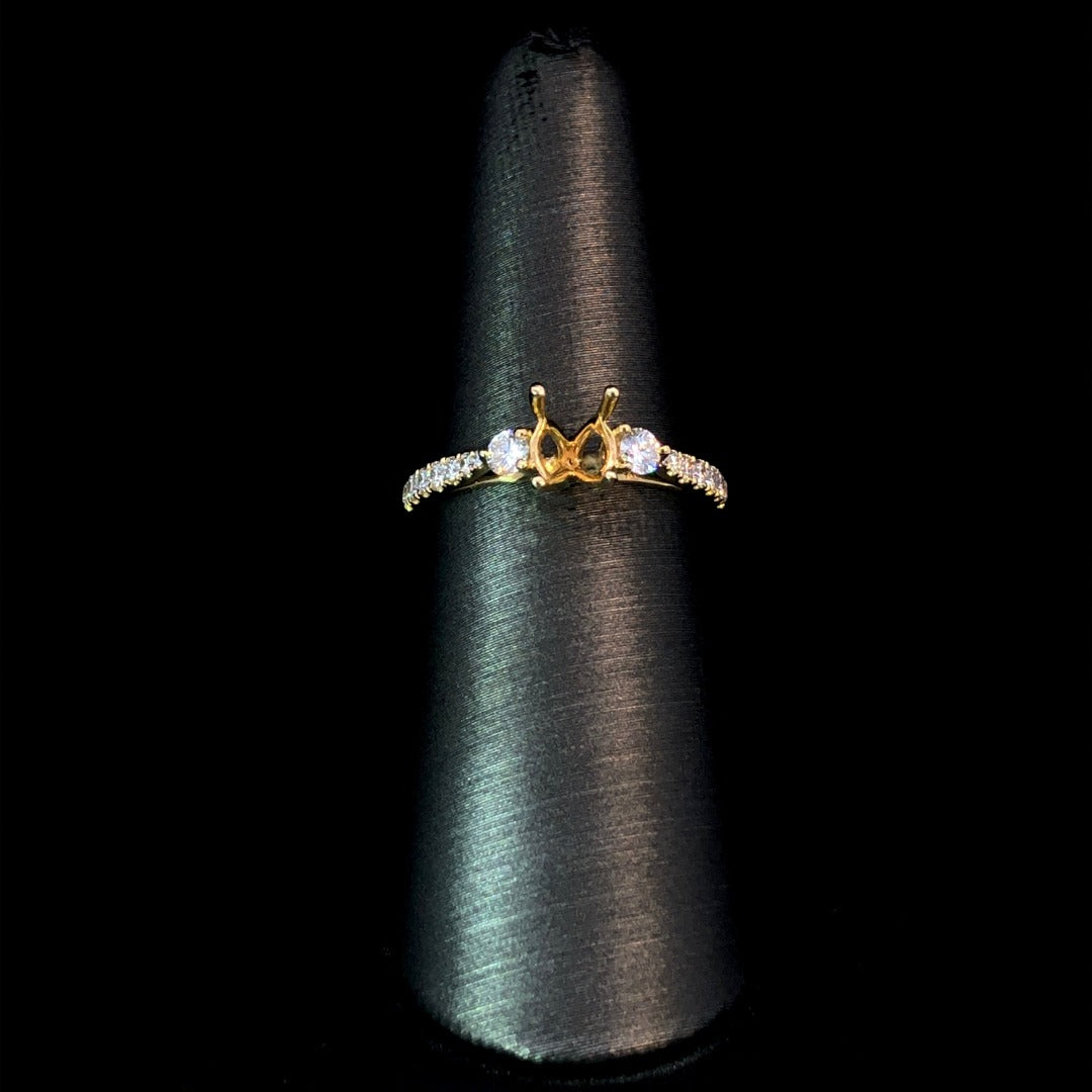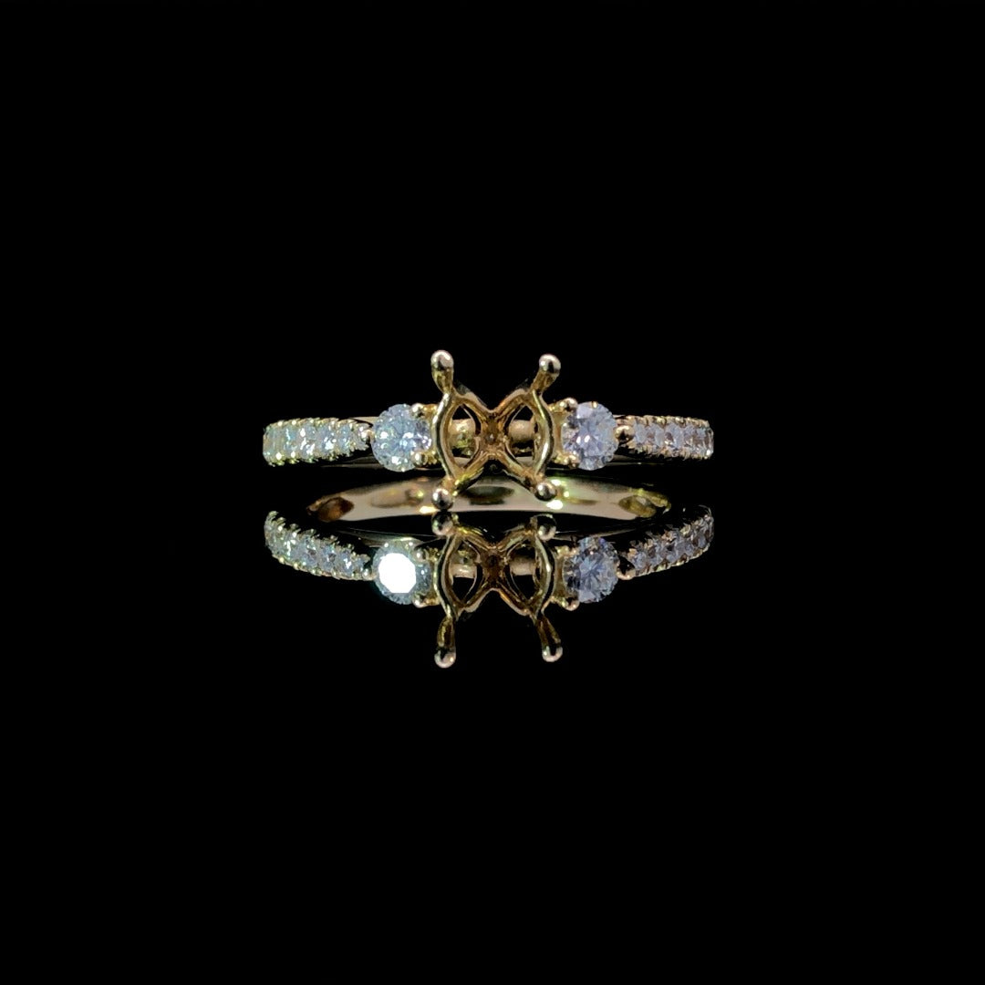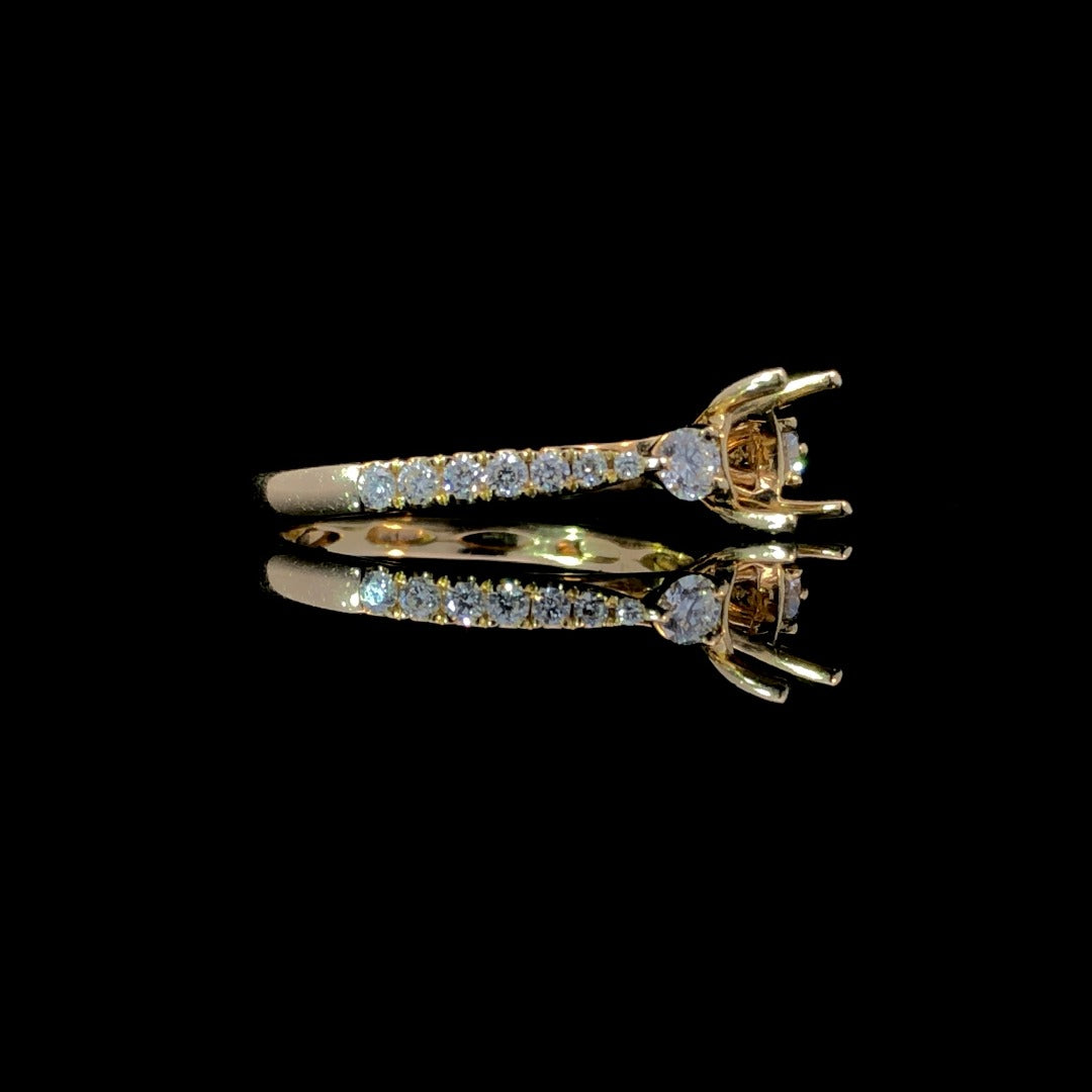 Complete your dream engagement ring with our stunning semi mount. The 14kt yellow gold cathedral style band showcases 2 round side diamonds and cascading round diamonds for a total weight of .39ctw. Customize your ring with a center stone of your choice from our unbeatable selection. Price is for the semi mount only. Center stone will be added at an additional cost. This ring is a size 6.5. If that size is not a perfect fit, first time sizing is free at the time of purchase. Additional sizing fees may apply.