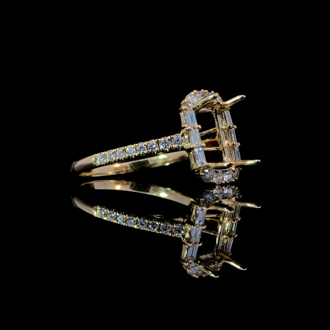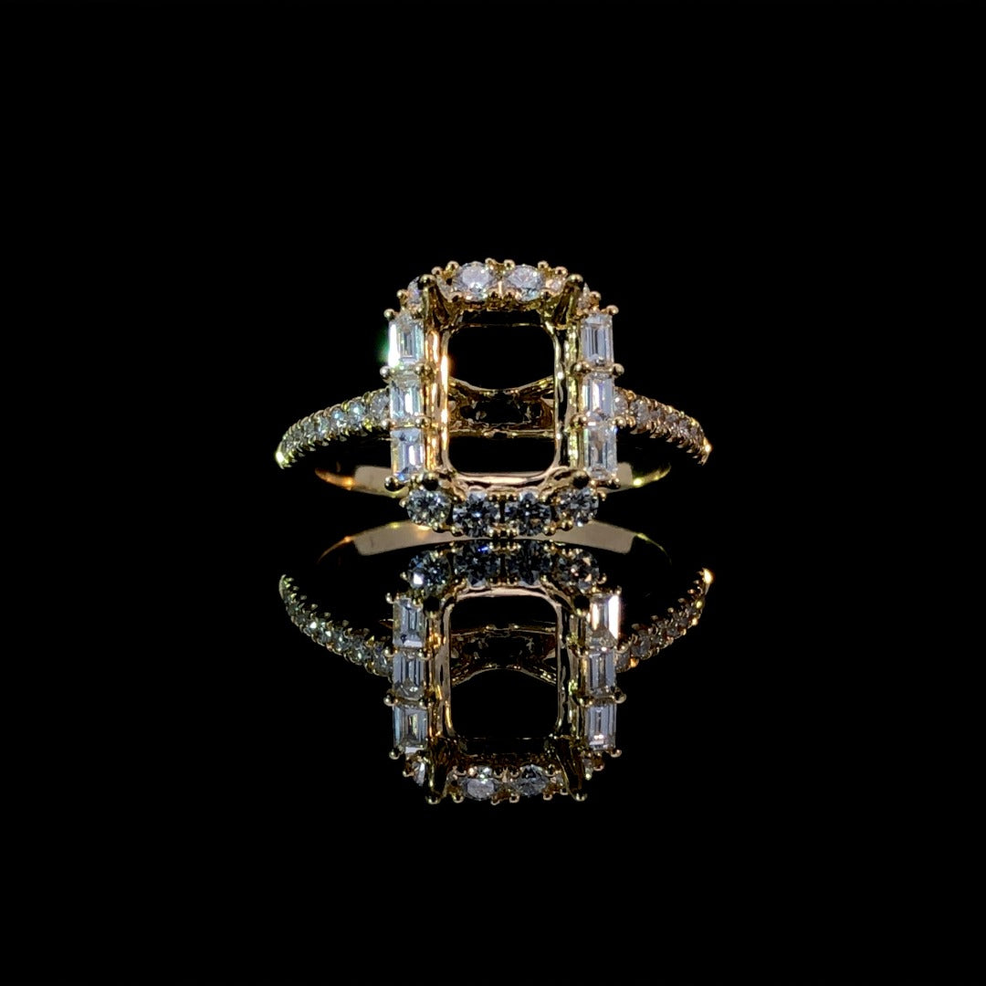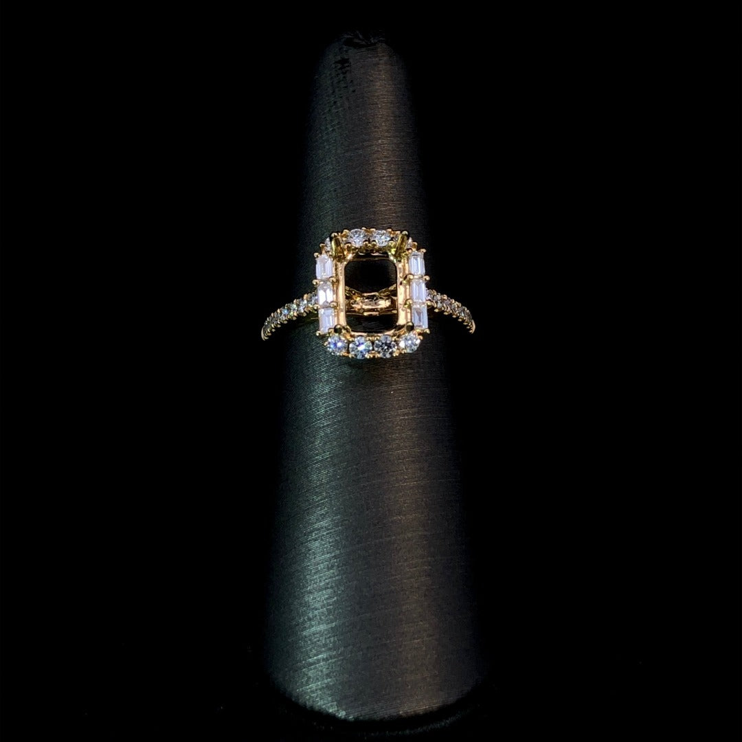 Indulge in luxury with this gorgeous diamond semi mount. Adorned with a stunning rectangular halo of round and baguette diamonds, the band cascades with additional round diamonds for a total weight of .59ctw. Crafted in 18kt yellow gold, choose a radiant or emerald shaped center stone from our exquisite collection to complete this exquisite piece. Price is for the semi mount only. Center stone will be added at an additional cost. This ring is a size 6.25. If that size is not a perfect fit, first time sizing is free at the time of purchase. Additional sizing fees may apply.