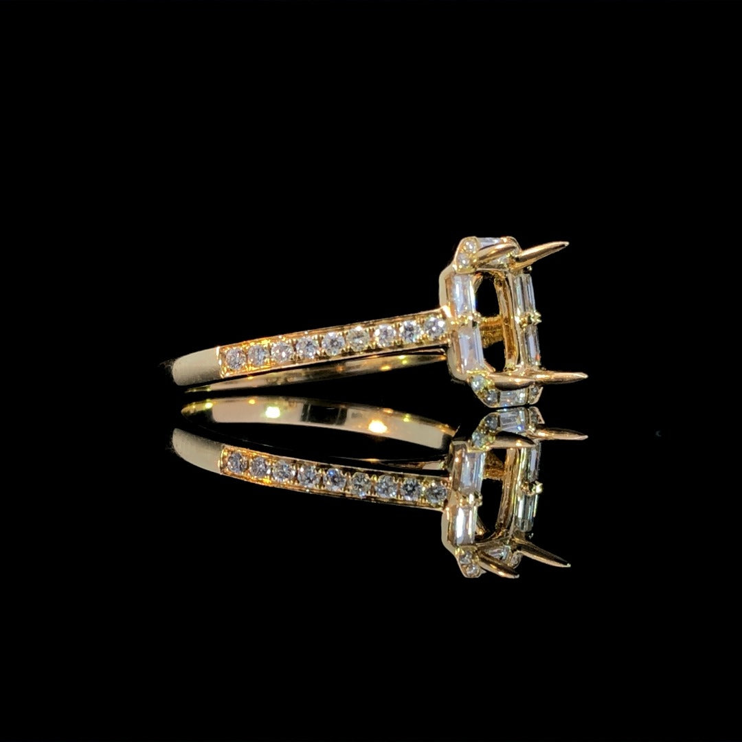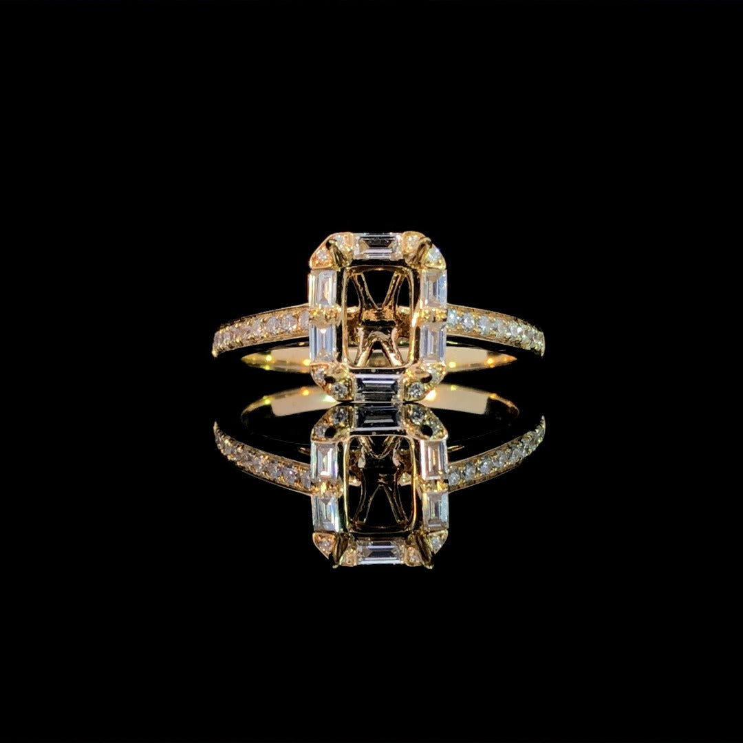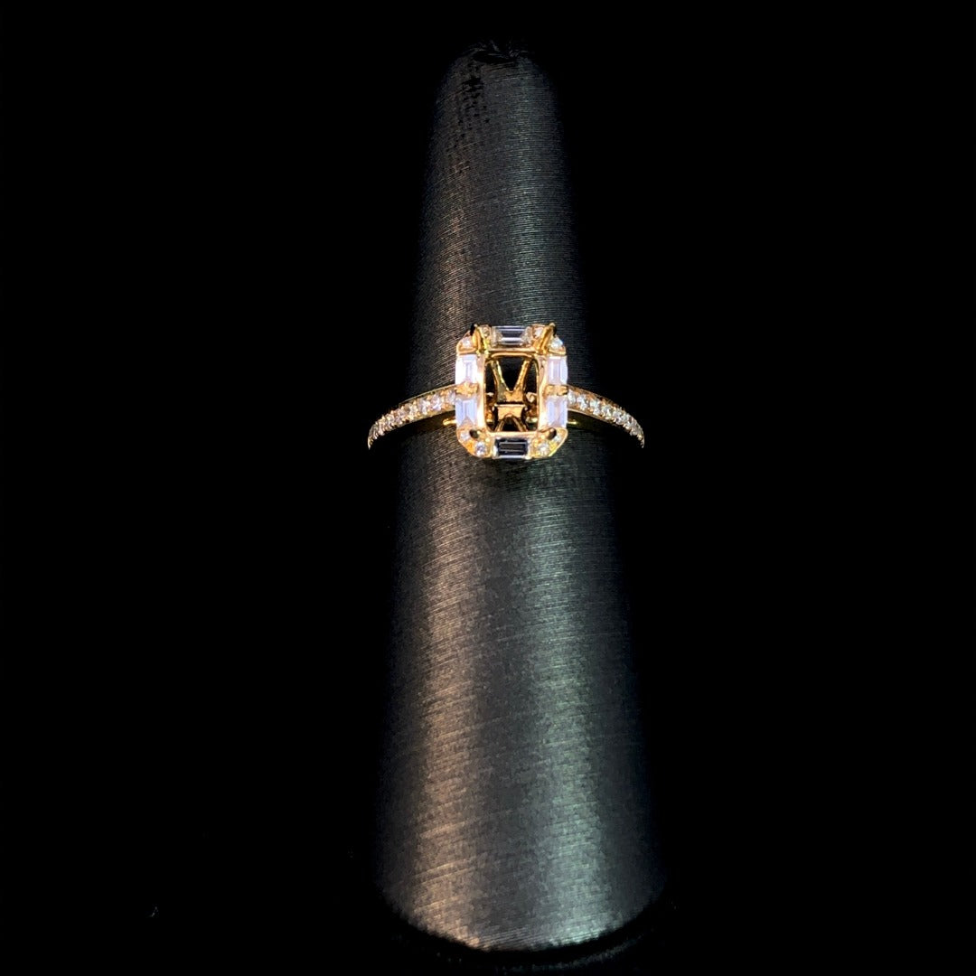 Indulge in luxury with this beautiful diamond semi mount. The warm 18kt yellow gold sets the stage for a stunning halo with .23ctw of baguette diamonds with round diamonds in the corner of the halo, while the band features additional round diamonds, for a total diamond weight of .40ctw. Select your dream emerald or radiant cut center stone to complete this elegant piece. Price is for the semi mount only. Center stone will be added at an additional cost. This ring is a size 6.25. If that size is not a perfect fit, first time sizing is free at the time of purchase. Additional sizing fees may apply.