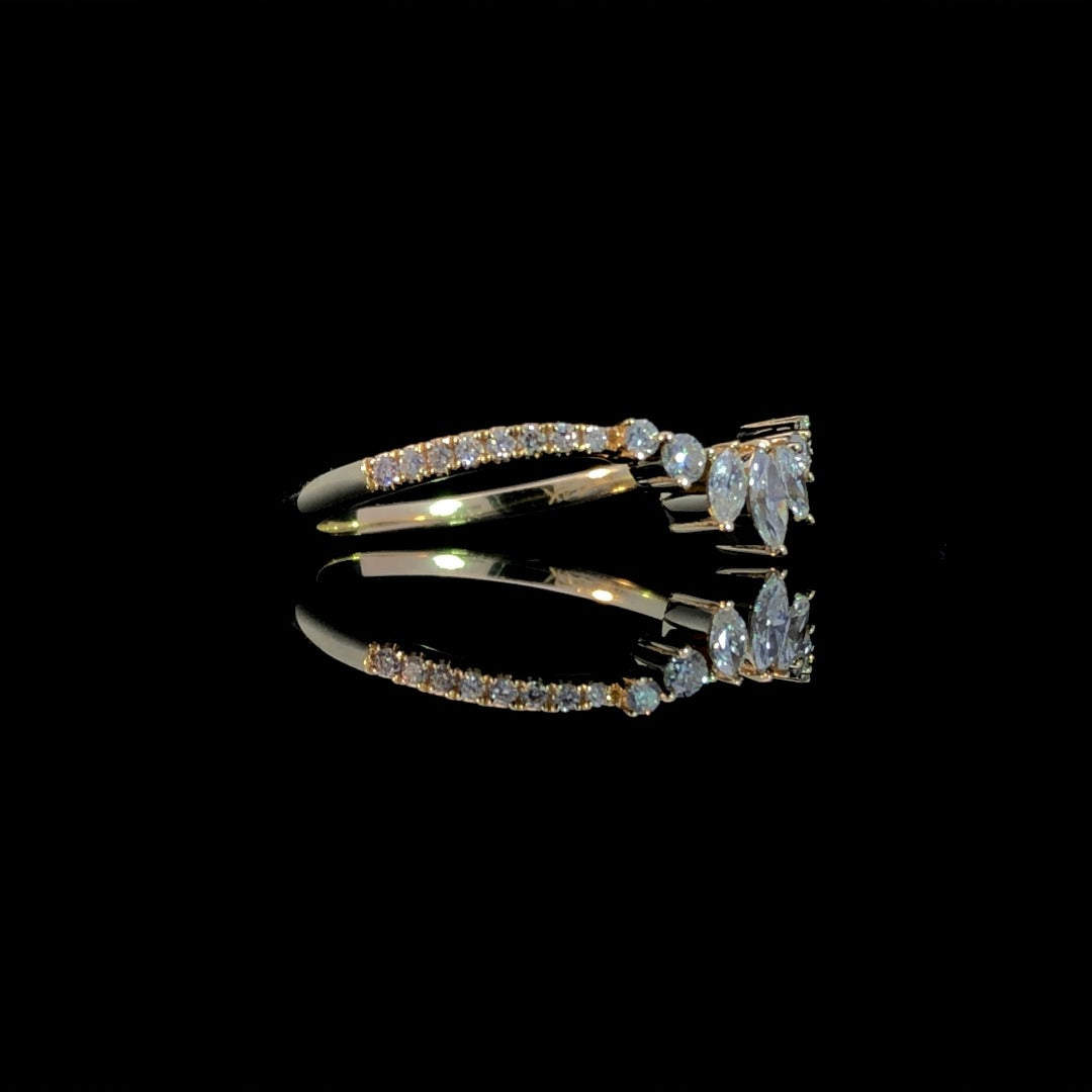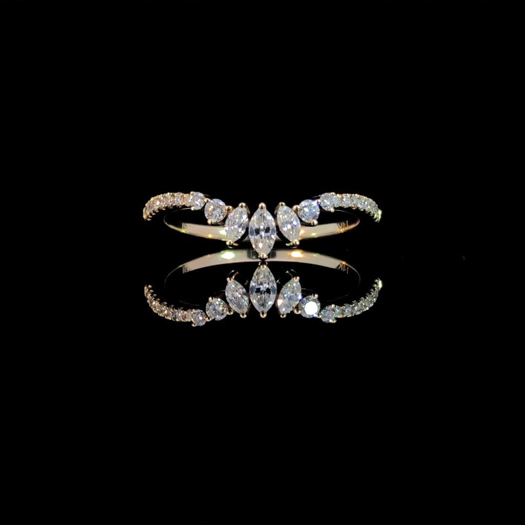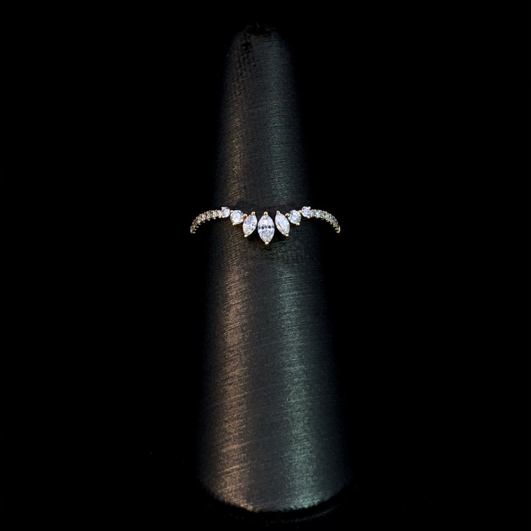 Expertly crafted, this band boasts a sleek curved design adorned with .30ctw of dazzling round and marquise diamonds in 14kt yellow gold. Elevate any outfit with this stunning and versatile piece that exudes elegance and sophistication. This ring is a size 6. If that size is not a perfect fit, first time sizing is free at the time of purchase. Additional sizing fees may apply.