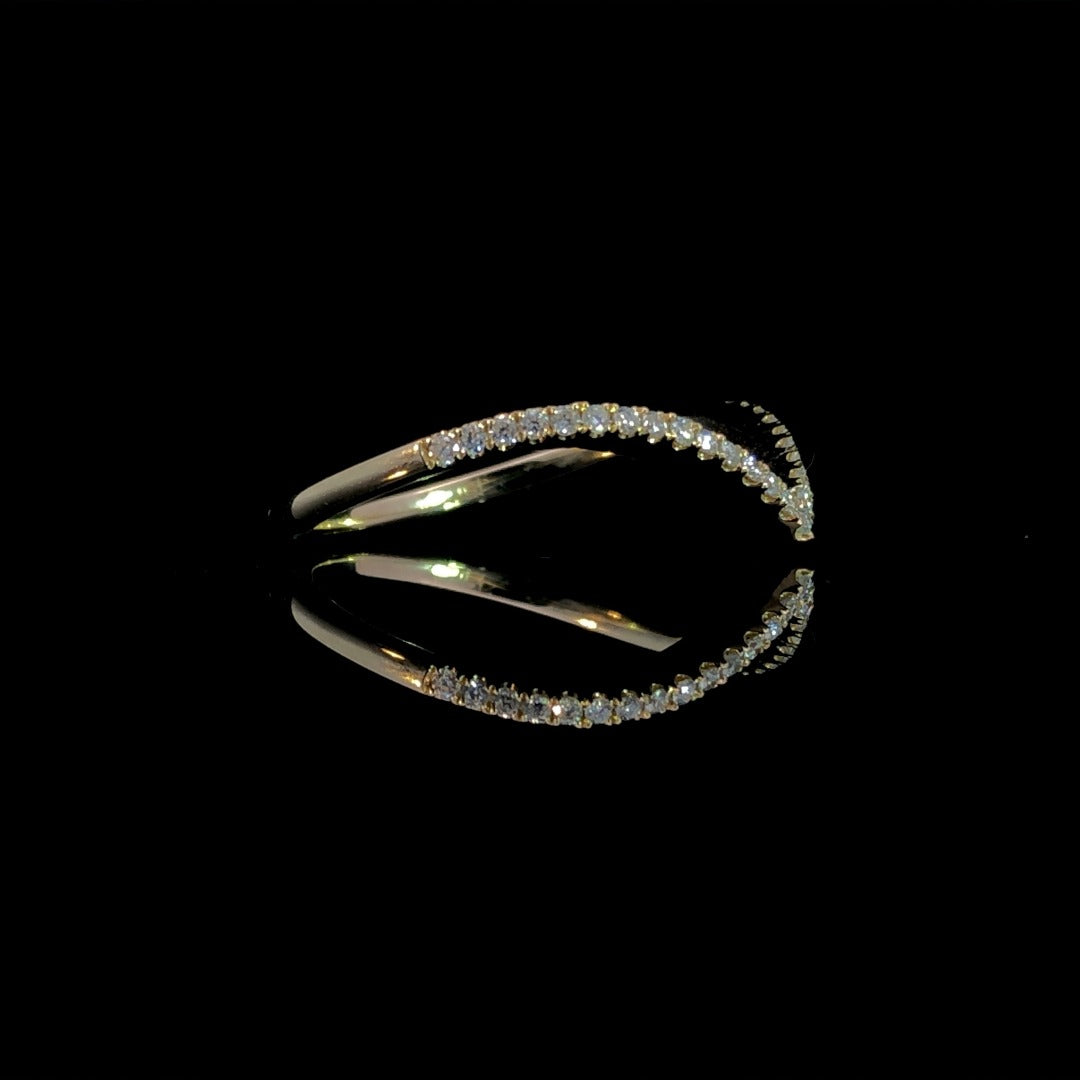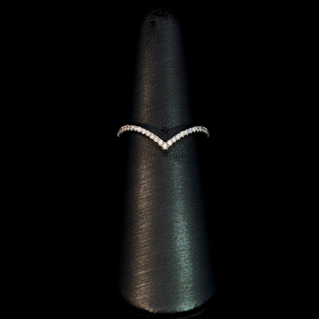 Expertly crafted and uniquely designed, our diamond band boasts .15 ctw of sparkling round diamonds set in 14kt yellow gold. Its sharp curve offers versatility to wear alone or stack with other bands. Elevate your style with this stunning addition to your jewelry collection. This ring is a size 6. If that size is not a perfect fit, first time sizing is free at the time of purchase. Additional sizing fees may apply.