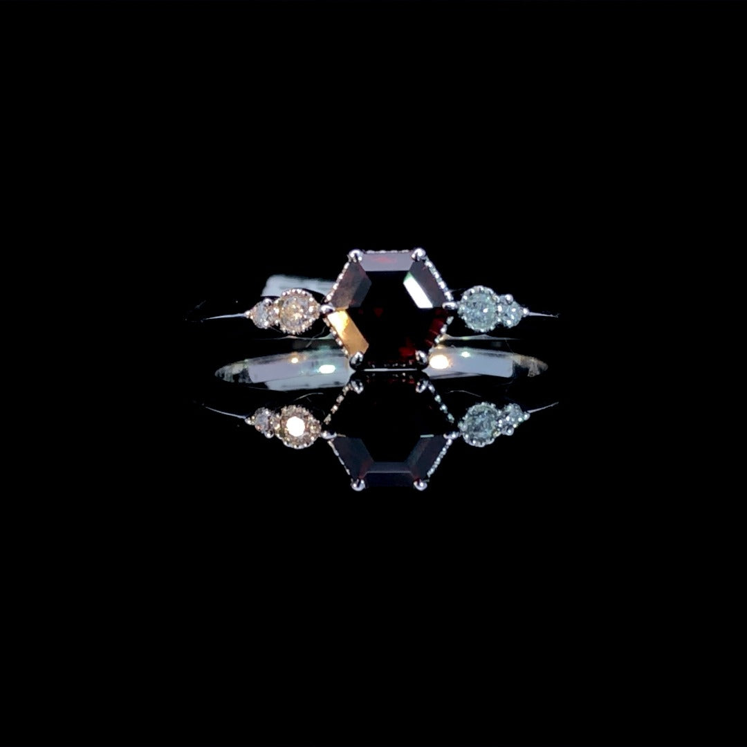 This charming ring showcases a stunning .65ct hexagonal garnet accented by .05ctw of round side diamonds set in 14kt white gold. Add a touch of elegance to any outfit with this lovely piece. This ring is a size 6. If that size is not a perfect fit, first time sizing is free at the time of purchase. Additional sizing fees may apply.
