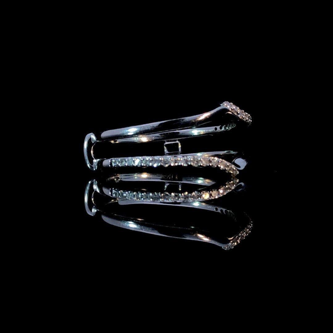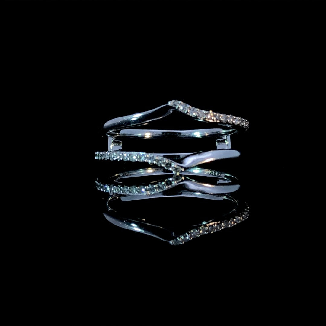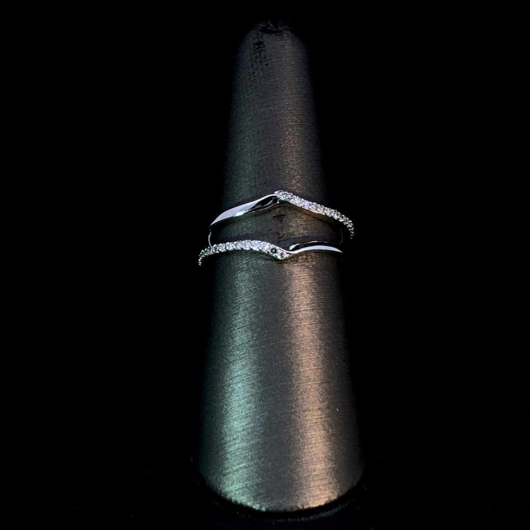 Add a touch of elegance to your bridal set with our stunning ring guard. Crafted with 14kt white gold and adorned with .16ctw of sparkling round diamonds, this beautiful piece is the perfect complement to your engagement ring. Elevate your look and make a statement with this must-have accessory. This ring is a size 7. If that size is not a perfect fit, first time sizing is free at the time of purchase. Additional sizing fees may apply.