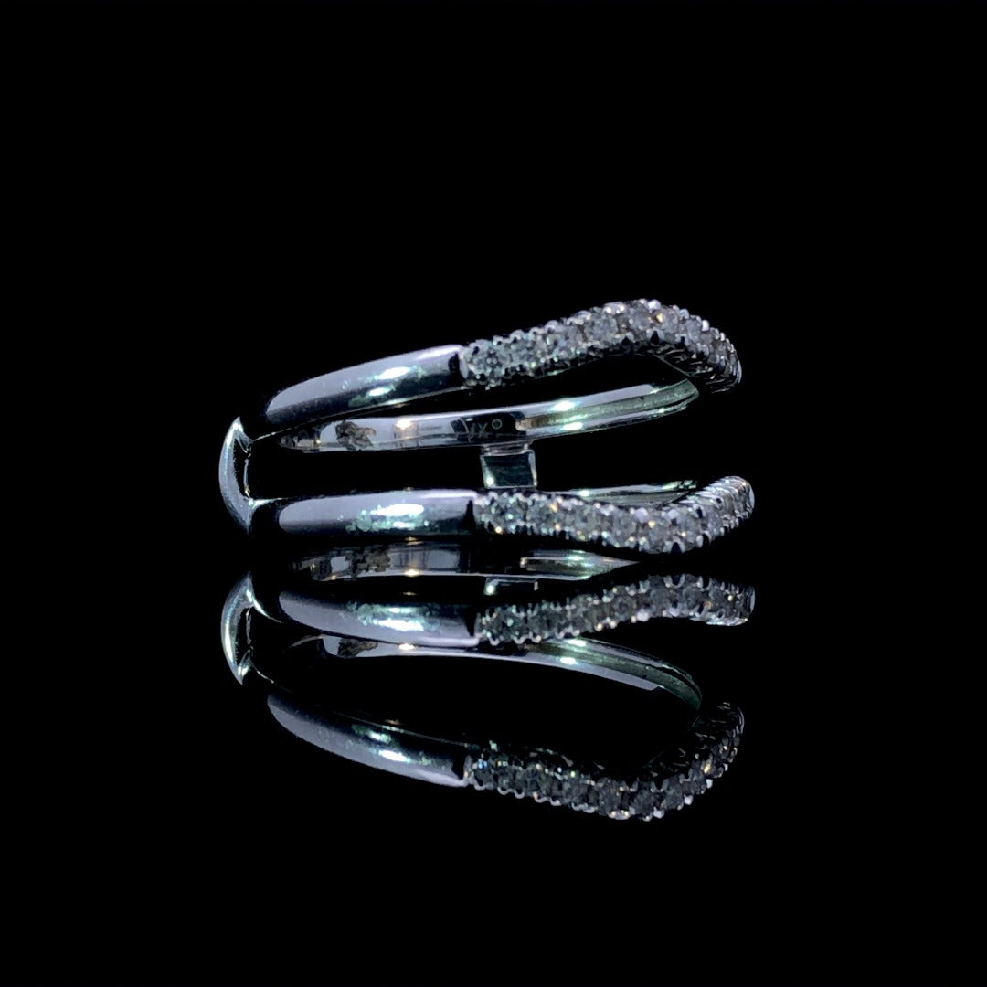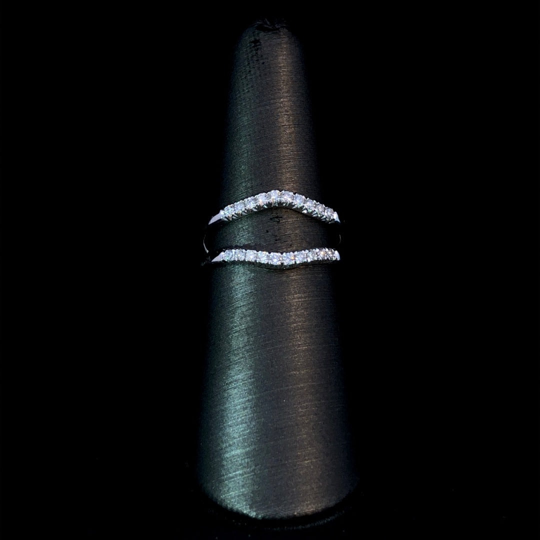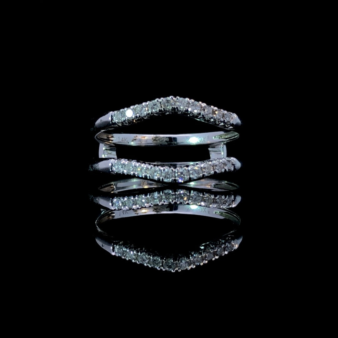 Elevate your bridal set with our exquisite ring guard featuring .25ctw of round diamonds set in 14kt white gold. Enhance your ring's sparkle and make a statement of elegance with this luxurious addition. This ring is a size 7.25. If that size is not a perfect fit, first time sizing is free at the time of purchase. Additional sizing fees may apply.