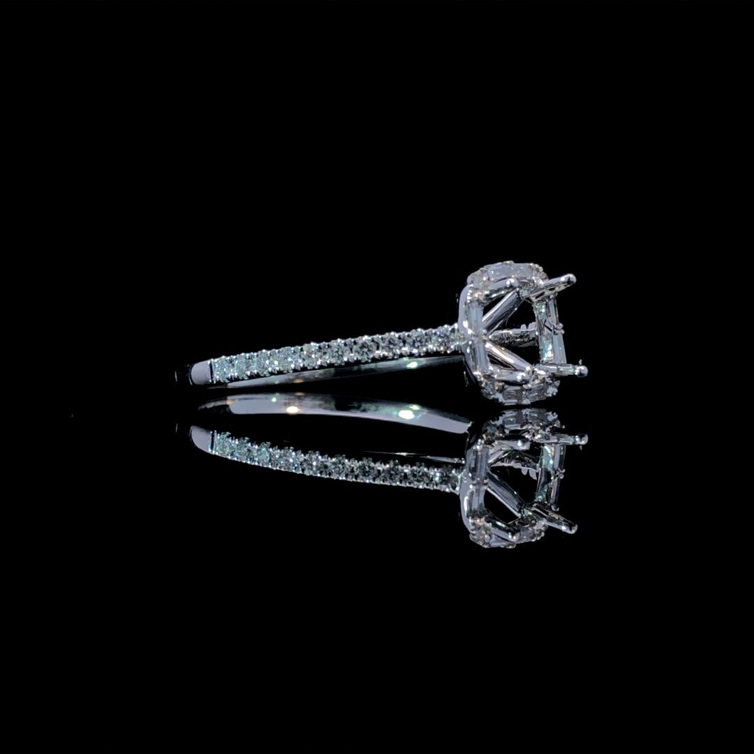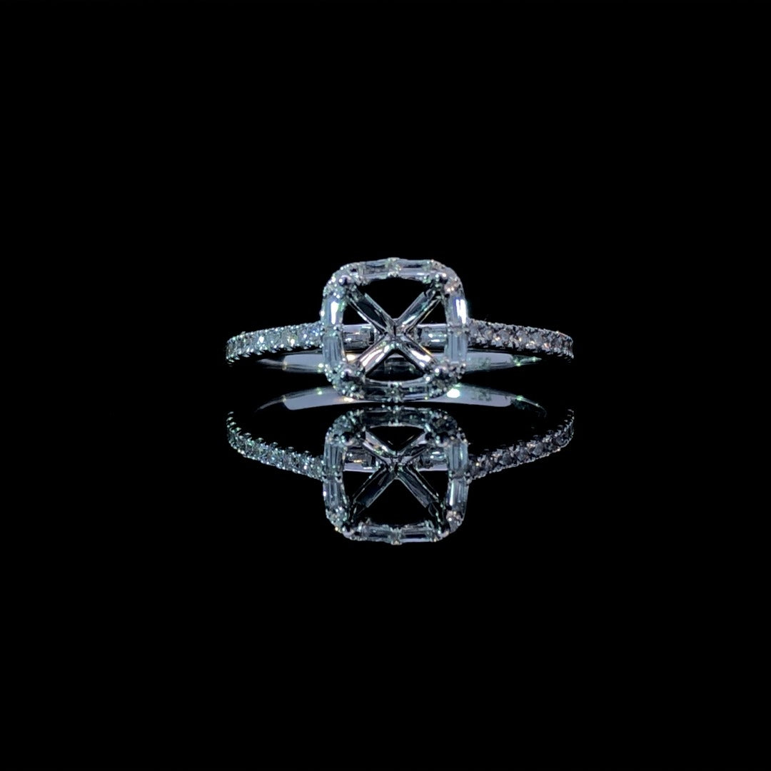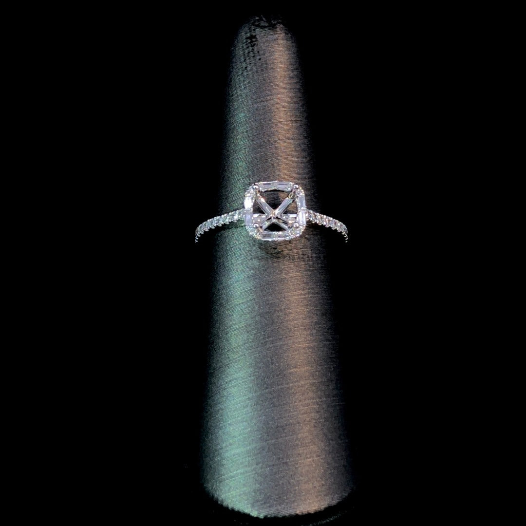 Elevate your style with our stunning diamond semi mount. A cushion shaped halo, decorated by round and baguette diamonds, creates a dazzling center. The 18kt white gold band is further adorned with cascading round diamonds for a total diamond weight of .24ctw. This customizable piece allows you to select your own center stone from our unmatched selection for a truly unique and beautiful look. Price is for the semi mount only. Center stone will be added at an additional cost. This ring is a size 6.25. If that size is not a perfect fit, first time sizing is free at the time of purchase. Additional sizing fees may apply.