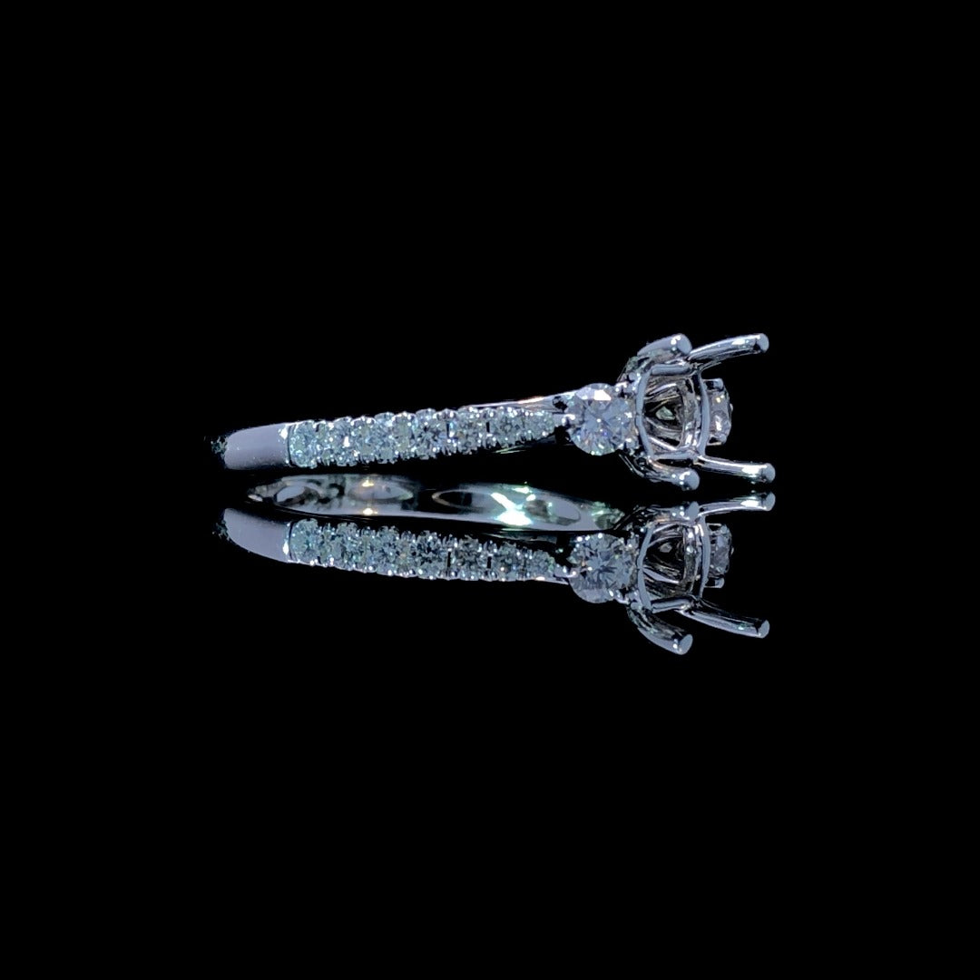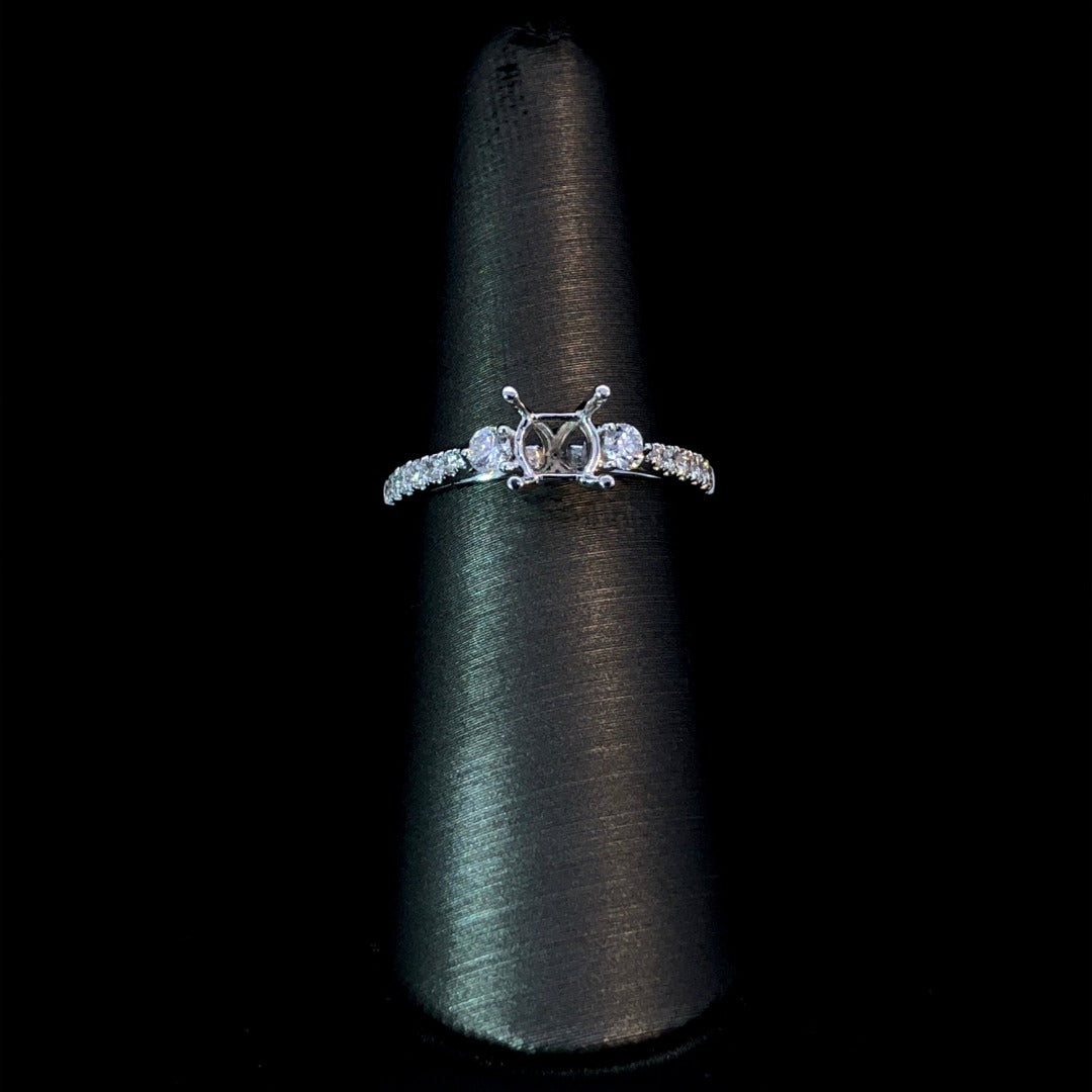 Enhance your chosen center stone with this beautiful diamond semi mount in 14kt white gold. With 2 round side diamonds and smaller diamonds cascading down the band, this piece adds a touch of elegance with a total diamond weight of .39ctw. Find your perfect center stone from our unmatched selection. Price is for the semi mount only. Center stone will be added at an additional cost. This ring is a size 6.5. If that size is not a perfect fit, first time sizing is free at the time of purchase. Additional sizing fees may apply.