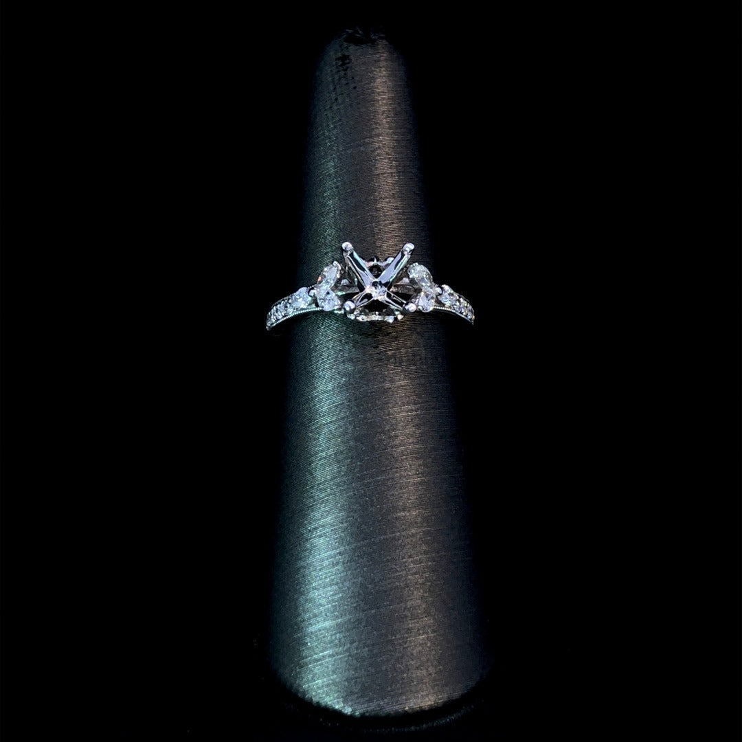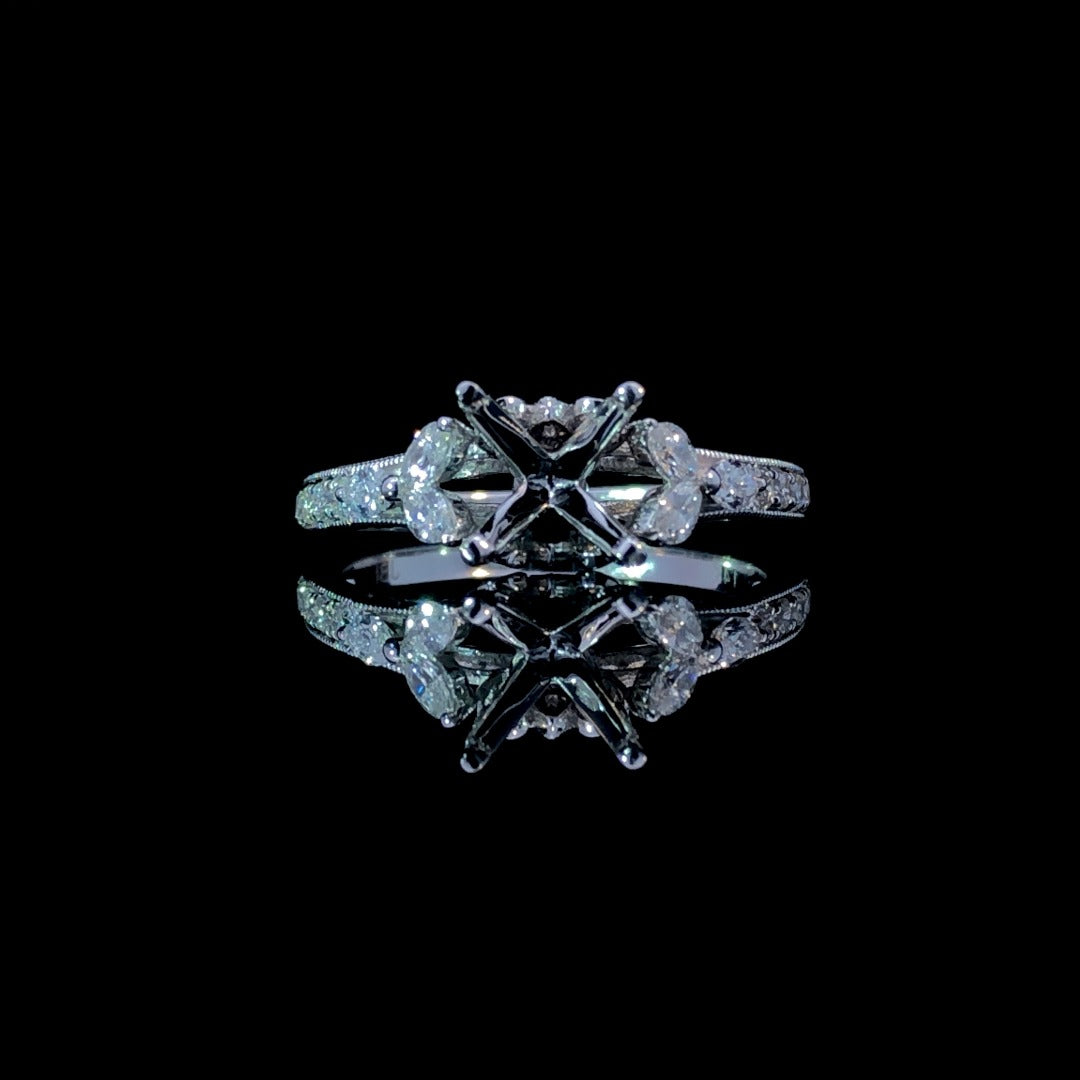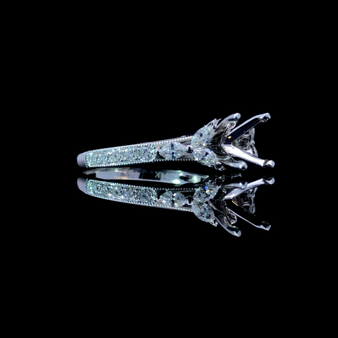 Create your dream ring with our beautiful diamond semi mount. The 14kt white gold band features .27ctw of marquise diamonds and .17ctw of round diamonds for a total weight of .44ctw. With milgrain and etchings, this detailed setting is the perfect backdrop for your chosen center stone from our wide selection. Price is for the semi mount only. Center stone will be added at an additional cost. This ring is a size 6. If that size is not a perfect fit, first time sizing is free at the time of purchase. Additional sizing fees may apply.