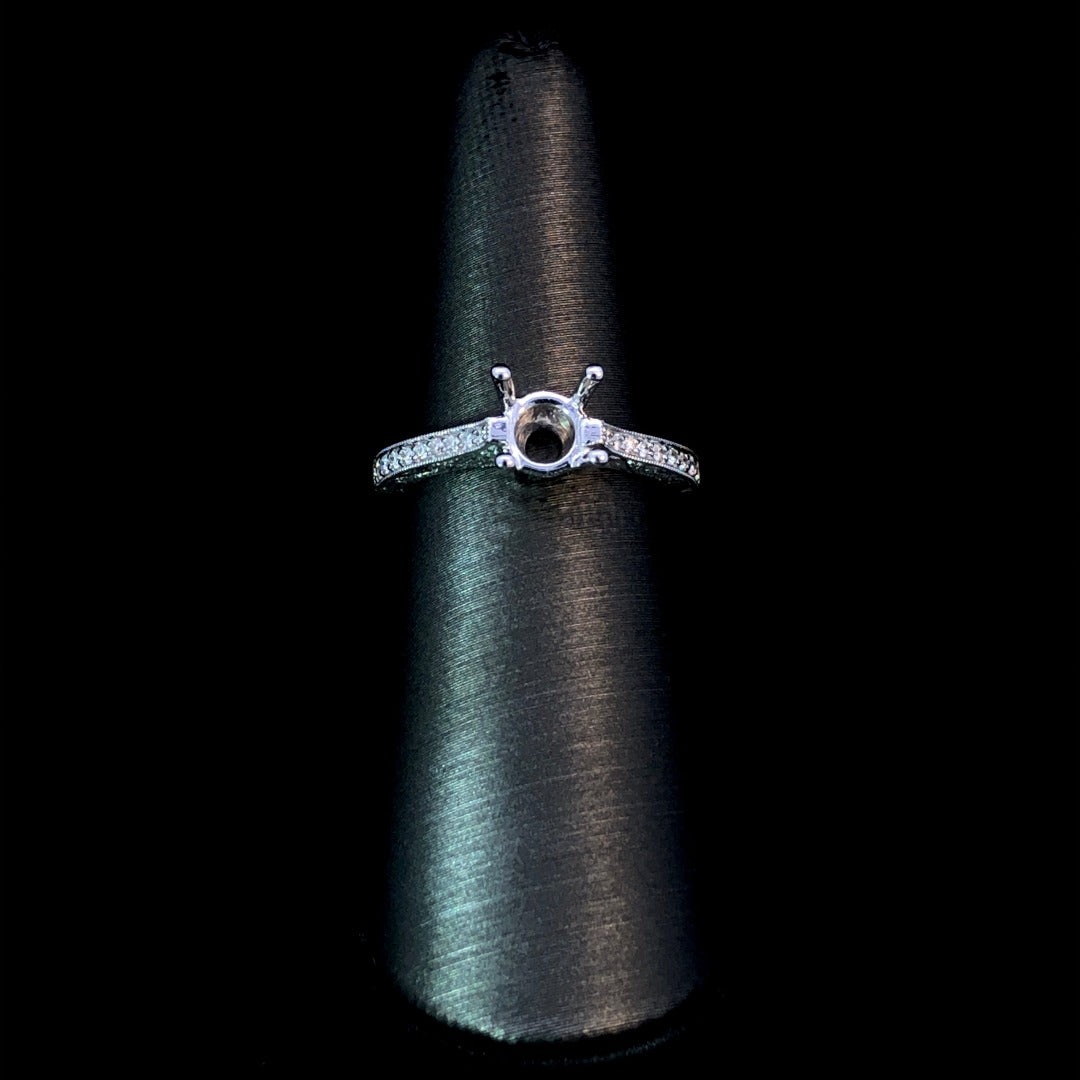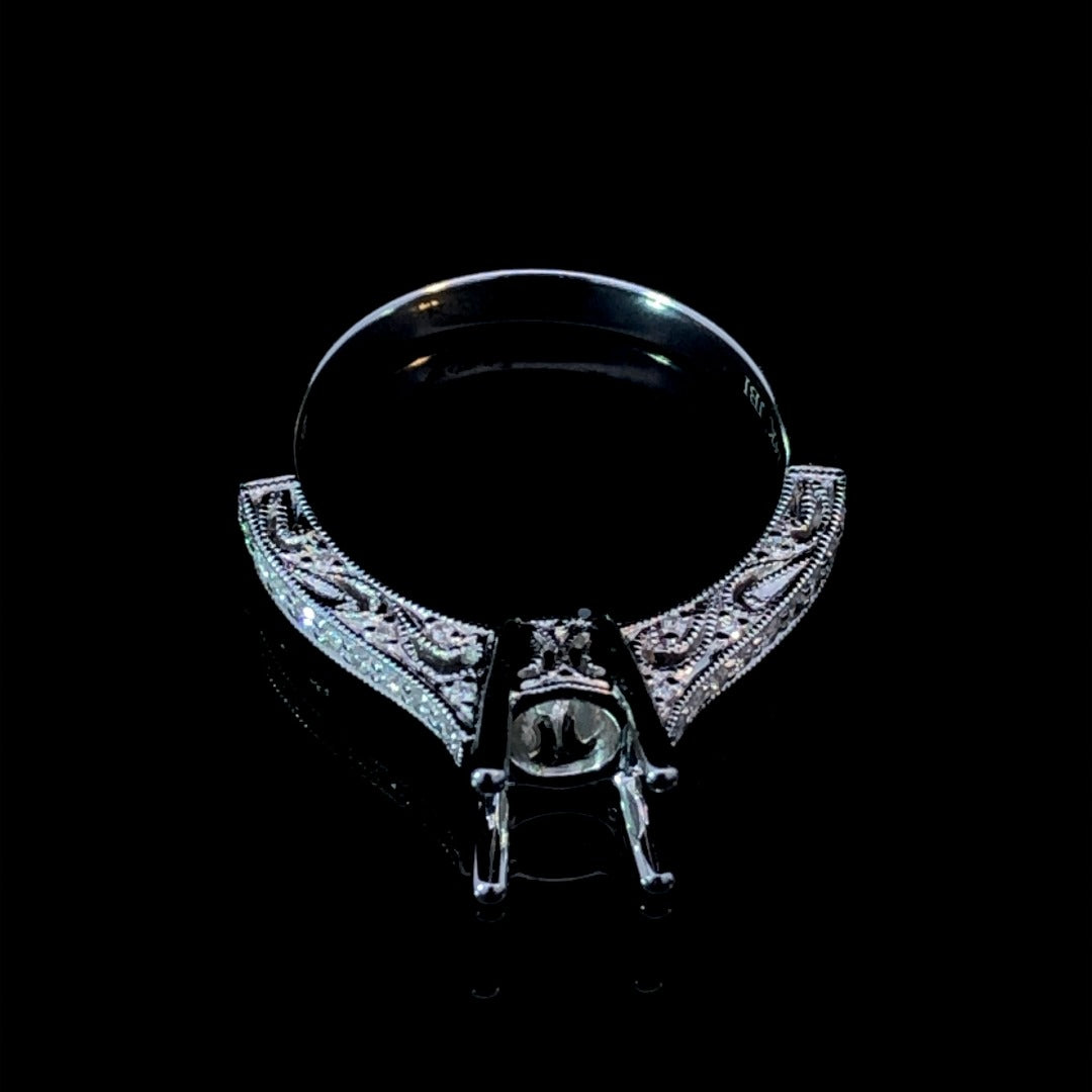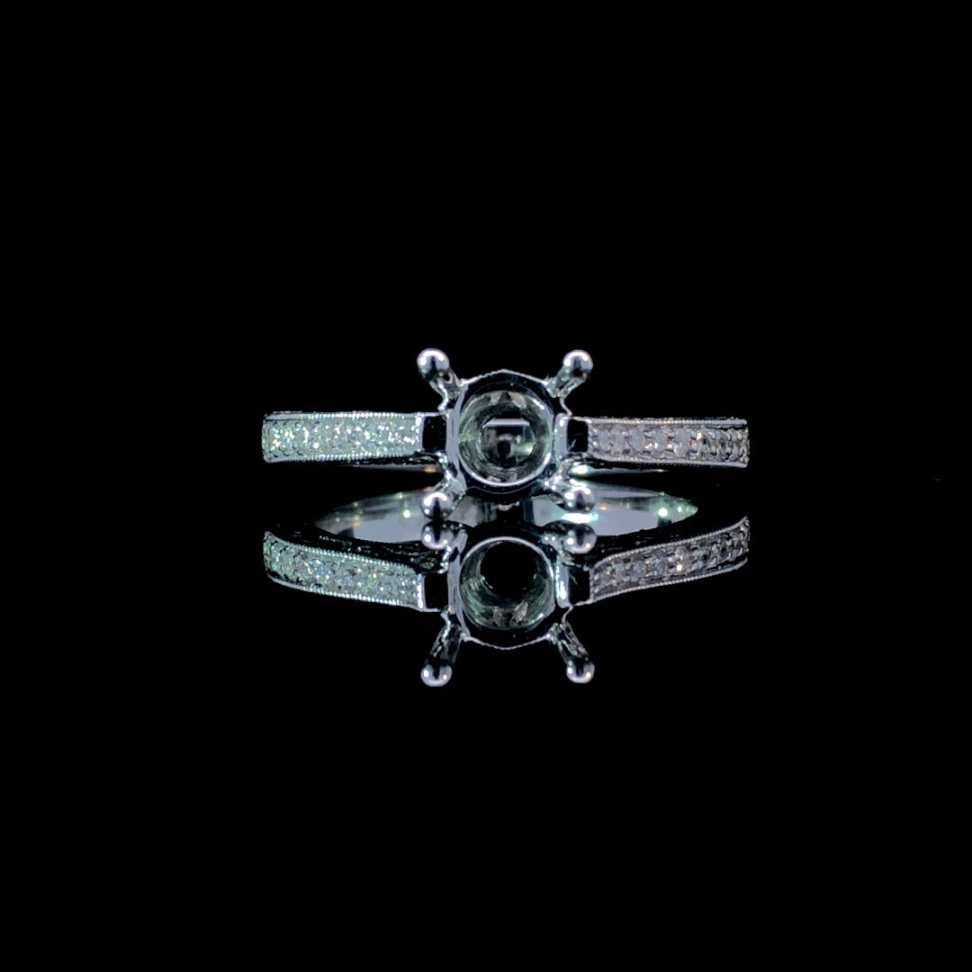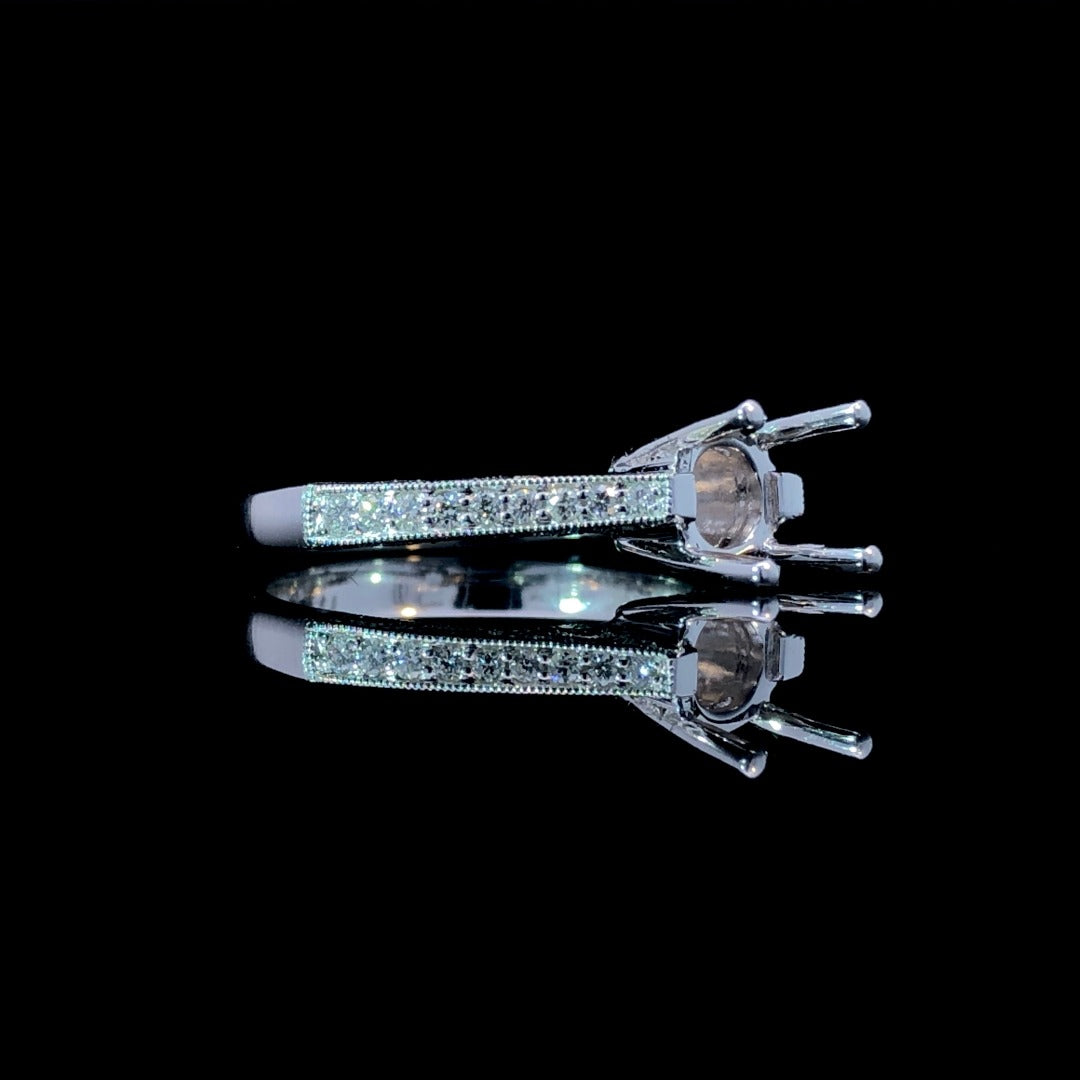 Looking for the perfect foundation for your dream engagement ring? Look no further than this elegant diamond semi mount. The 14kt white gold band is adorned with .21ctw of sparkling round diamonds, delicate milgrain, and intricate filigree detailing on the sides. Add your choice of center stone from our unbeatable selection of loose stones for a truly unique piece. Price is for the semi mount only. Center stone will be added at an additional cost. This ring is a size 6.25. If that size is not a perfect fit, first time sizing is free at the time of purchase. Additional sizing fees may apply.