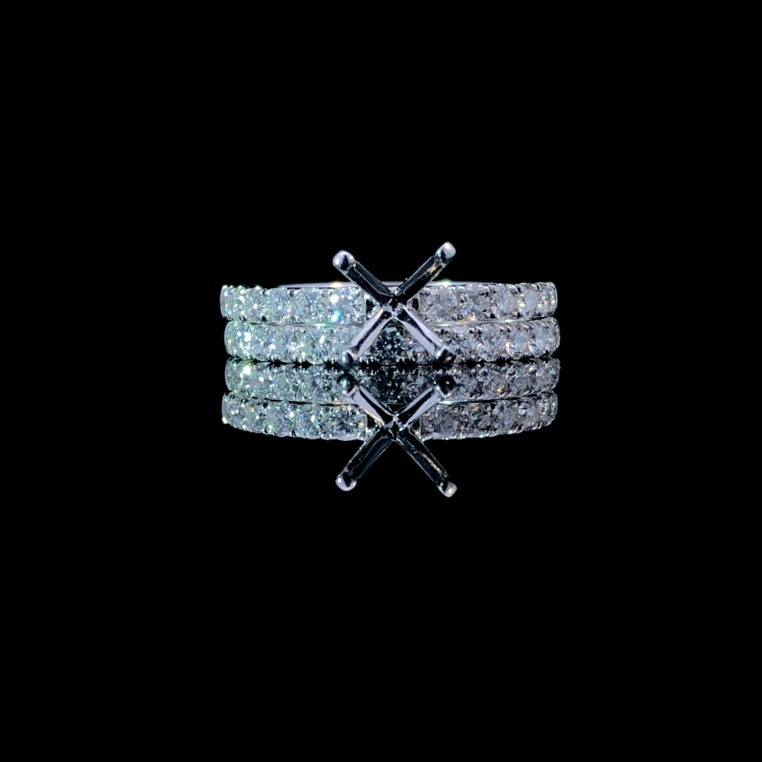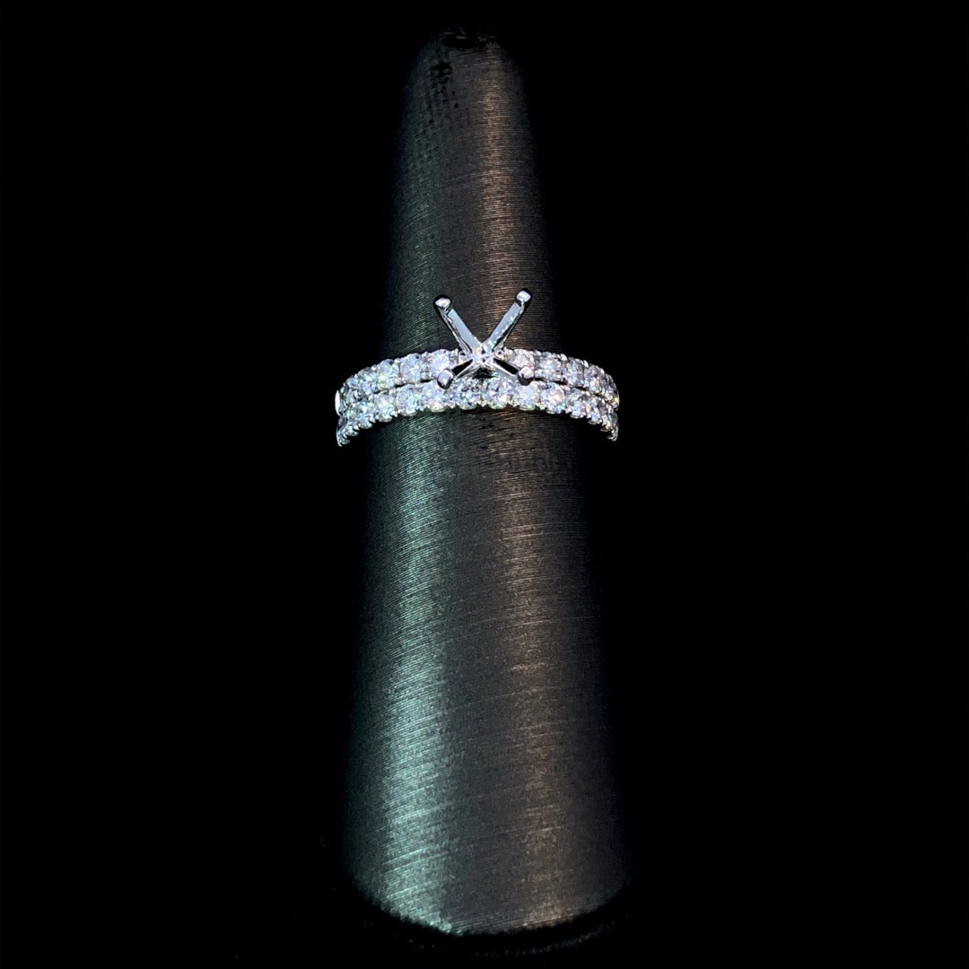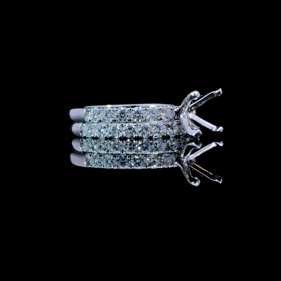 Complete the look with the matching .48ctw diamond band (sold separately) for a truly stunning set. Price is for the semi mount only. Center stone and band will be added at an additional cost. This ring is a size 6.5. If that size is not a perfect fit, first time sizing is free at the time of purchase. Additional sizing fees may apply.