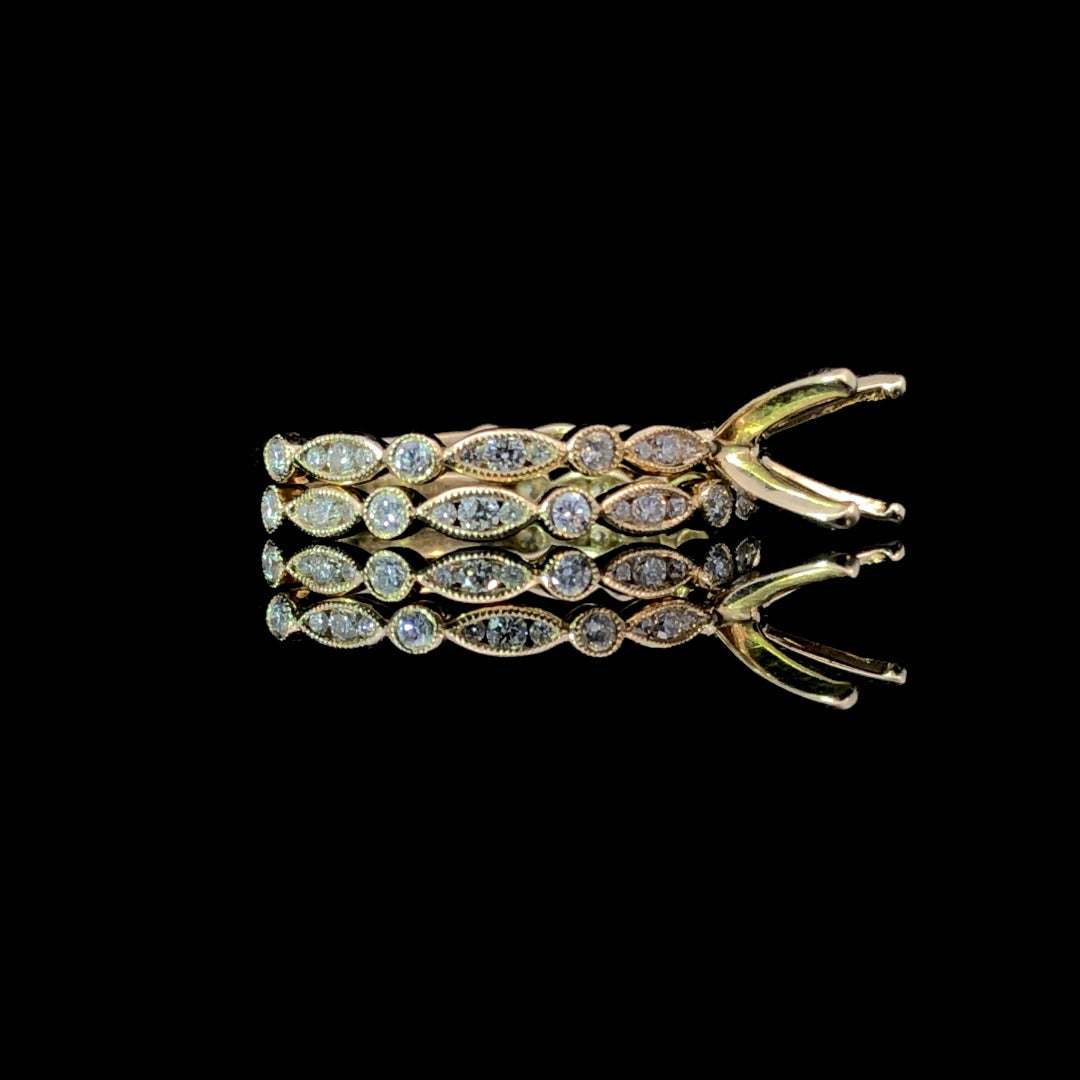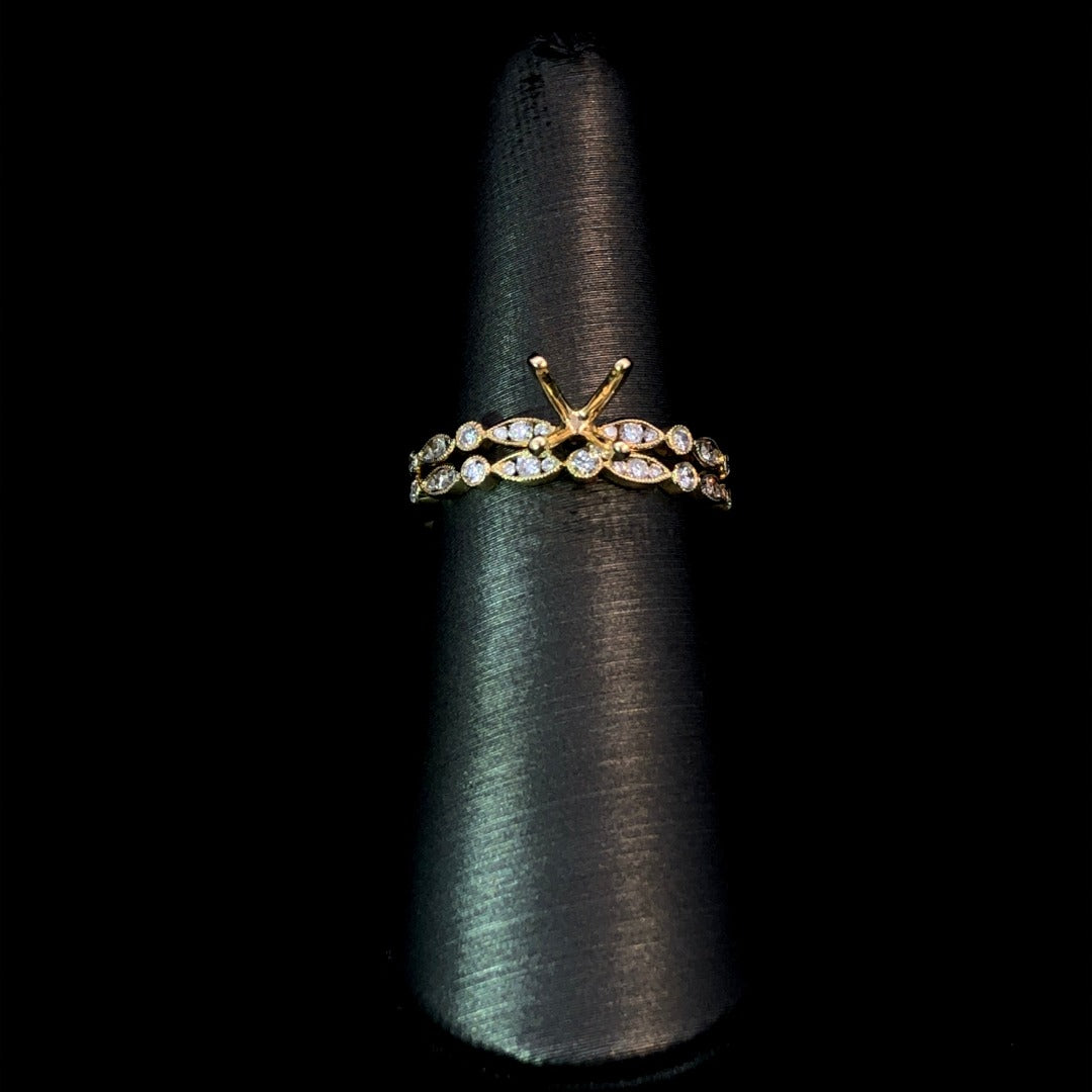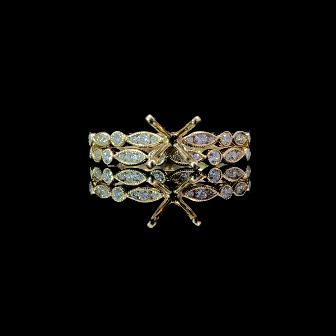 Elevate your style with our luxurious diamond semi mount. Crafted in 14kt yellow gold, this chic design boasts .25ctw of round diamonds, artfully set in alternating round and marquise shapes. Personalize your look with your choice of center stone from our unmatched collection. Complete the set with the matching .25ctw band (sold separately). Price is for the semi mount only. Center stone and band will be added at an additional cost. This ring is a size 6.5. If that size is not a perfect fit, first time sizing is free at the time of purchase. Additional sizing fees may apply.