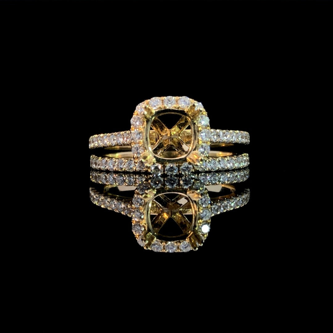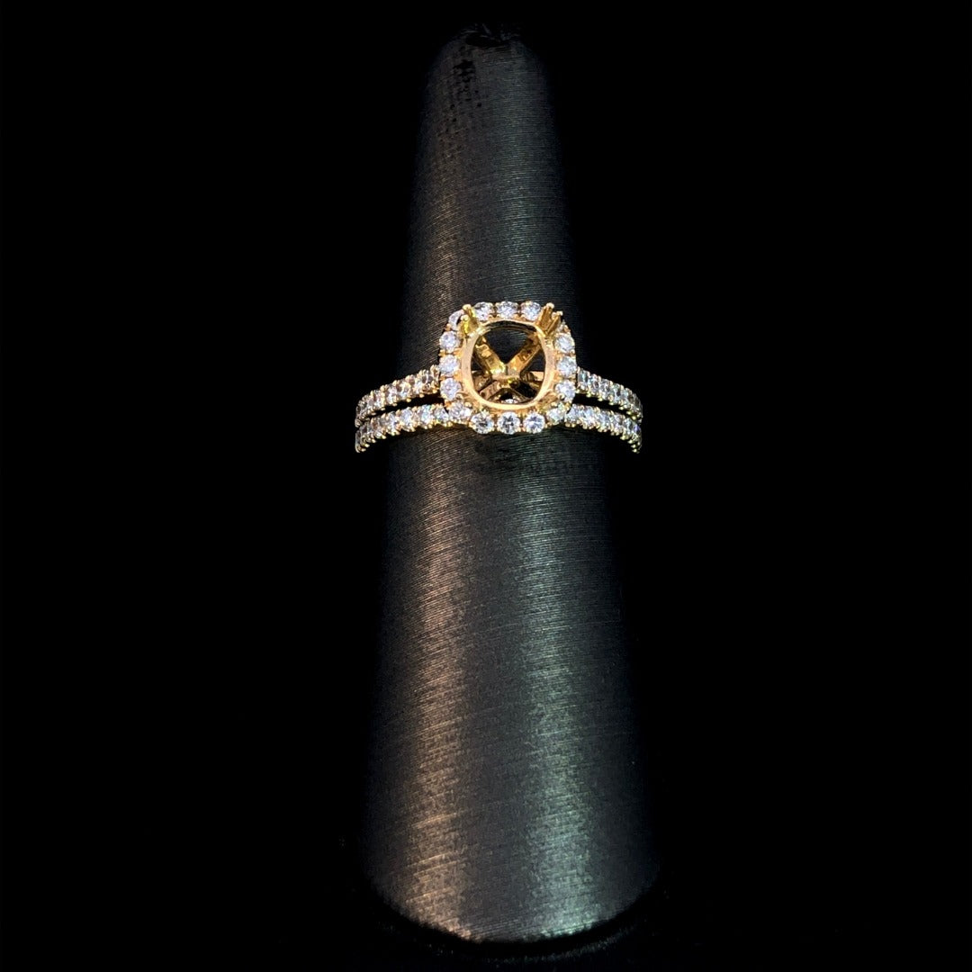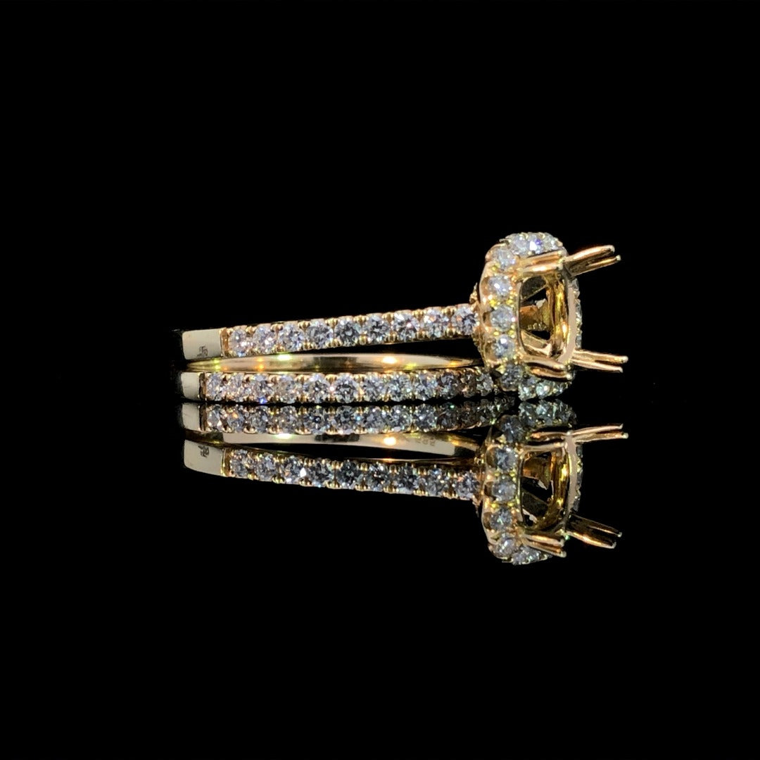 Indulge in luxury with our exquisite diamond semi mount. The breathtaking diamond halo and cascading diamonds on the cathedral band add up to a total weight of .55ctw. Personalize your ring with a center stone from our wide selection. Complete the set with the matching .30ctw diamond band (sold separately). Price is for the semi mount only. Center stone and band will be added at an additional cost. This ring is a size 6.5. If that size is not a perfect fit, first time sizing is free at the time of purchase. Additional sizing fees may apply.