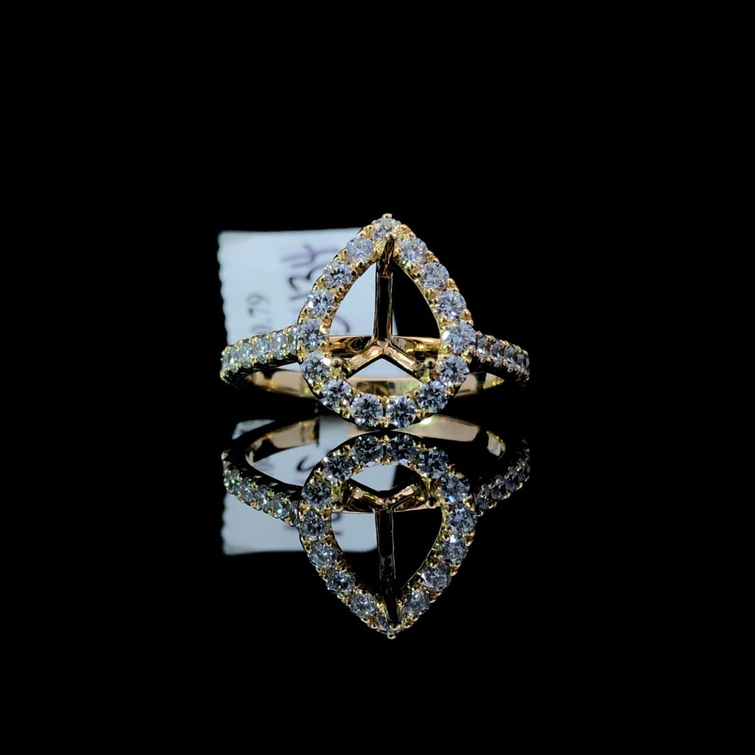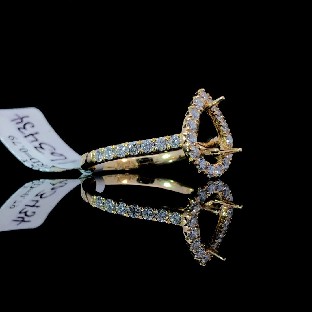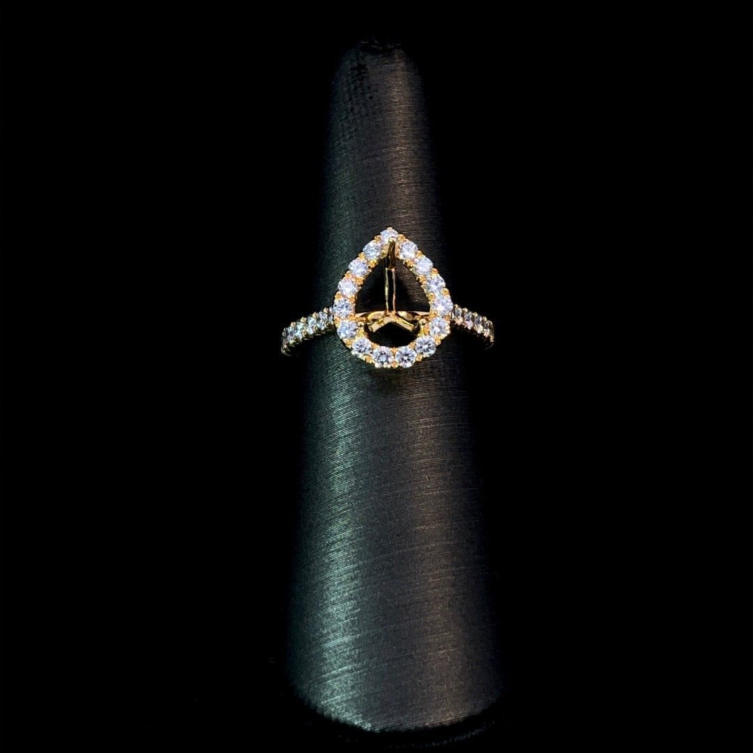 Elevate any outfit with our stunning diamond semi mount. Featuring a timeless design with a pear-shaped halo and sparkling round diamonds on an 18kt yellow gold band, this piece exudes elegance and luxury. Complete the look with your choice of pear center stone from our unmatched selection. Price is for the semi mount only. Center stone will be added at an additional cost. This ring is a size 6.25. If that size is not a perfect fit, first time sizing is free at the time of purchase. Additional sizing fees may apply.