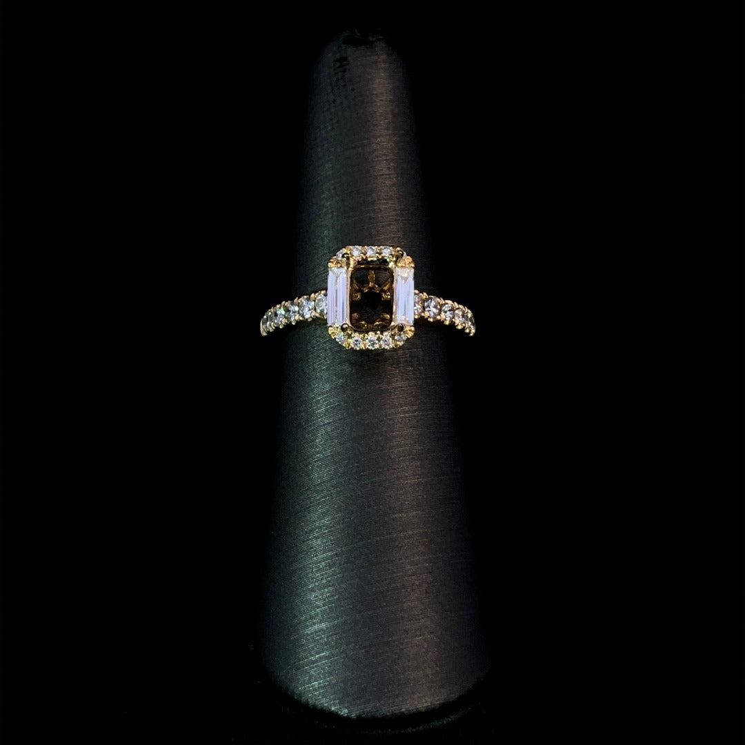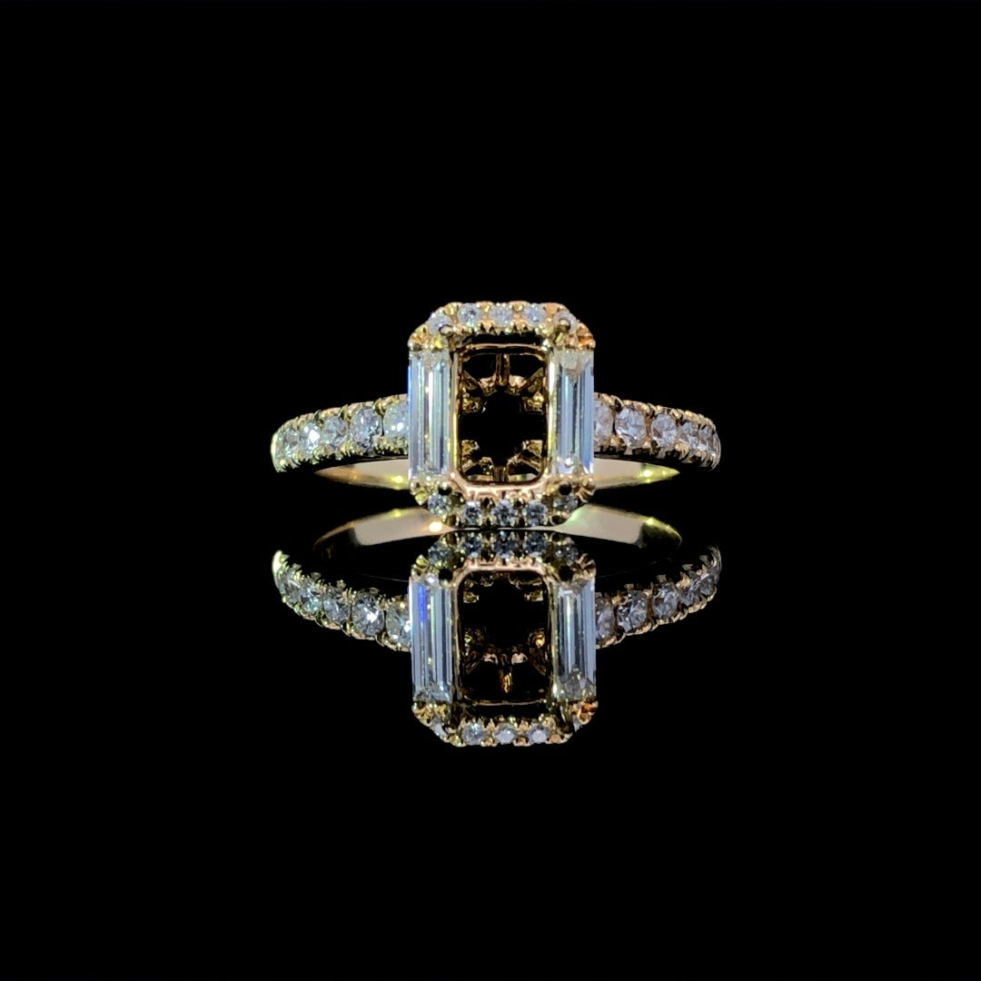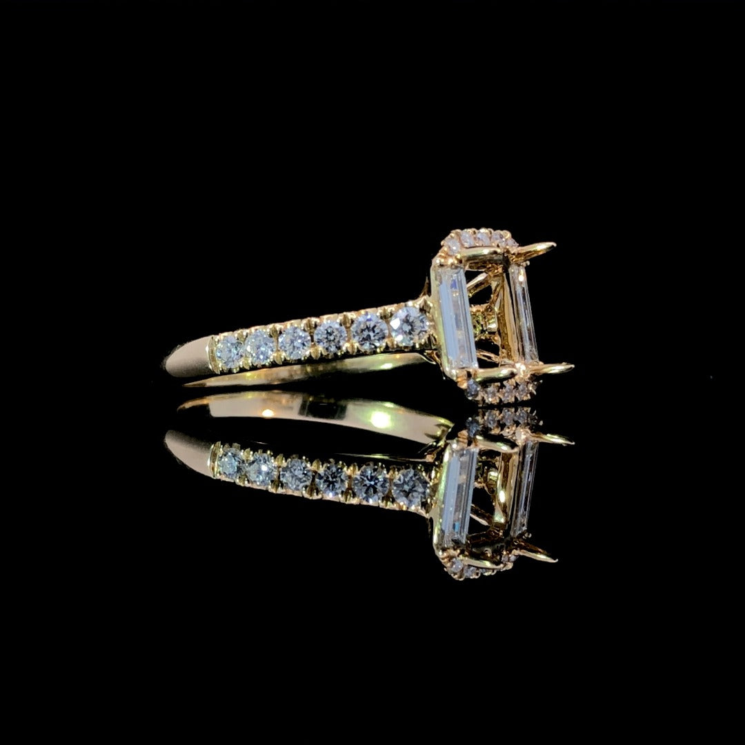 Create a one-of-a-kind piece with this beautiful diamond semi mount. Featuring a stunning rectangular halo with round and baguette diamonds, this 18kt yellow gold band is further accentuated with cascading smaller diamonds. Choose from our unbeatable selection of loose stones to add your personal touch, for your center stone. Price is for the semi mount only. Center stone will be added at an additional cost. This ring is a size 6.25. If that size is not a perfect fit, first time sizing is free at the time of purchase. Additional sizing fees may apply.
