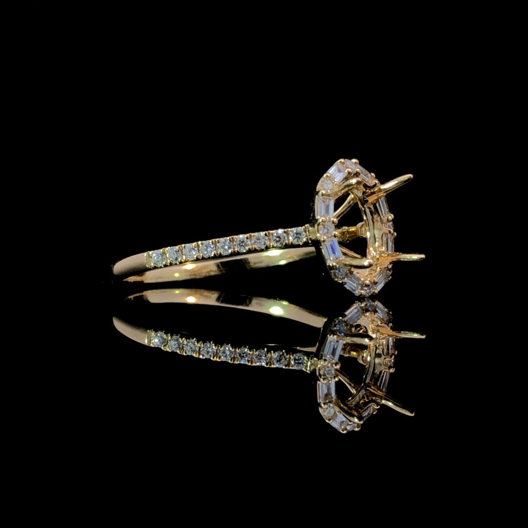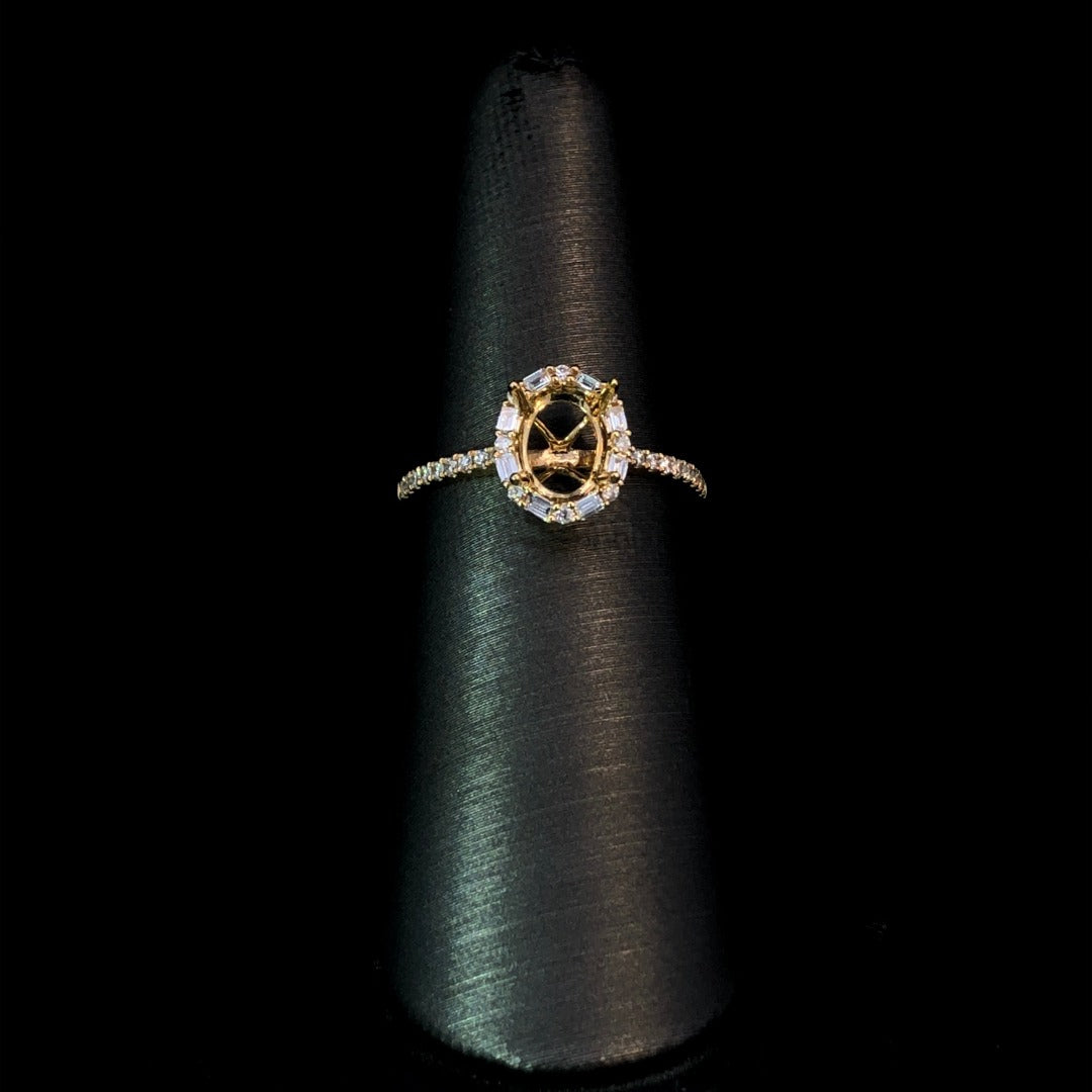 Indulge in luxury with our exquisite diamond semi mount. Its stunning halo of round and baguette diamonds is accented by cascading small round diamonds on the band, totaling .30ctw. Set in 18kt yellow gold, choose your perfect oval center stone from our loose stone selection. Price is for the semi mount only. Center stone will be added at an additional cost. This ring is a size 6.25. If that size is not a perfect fit, first time sizing is free at the time of purchase.