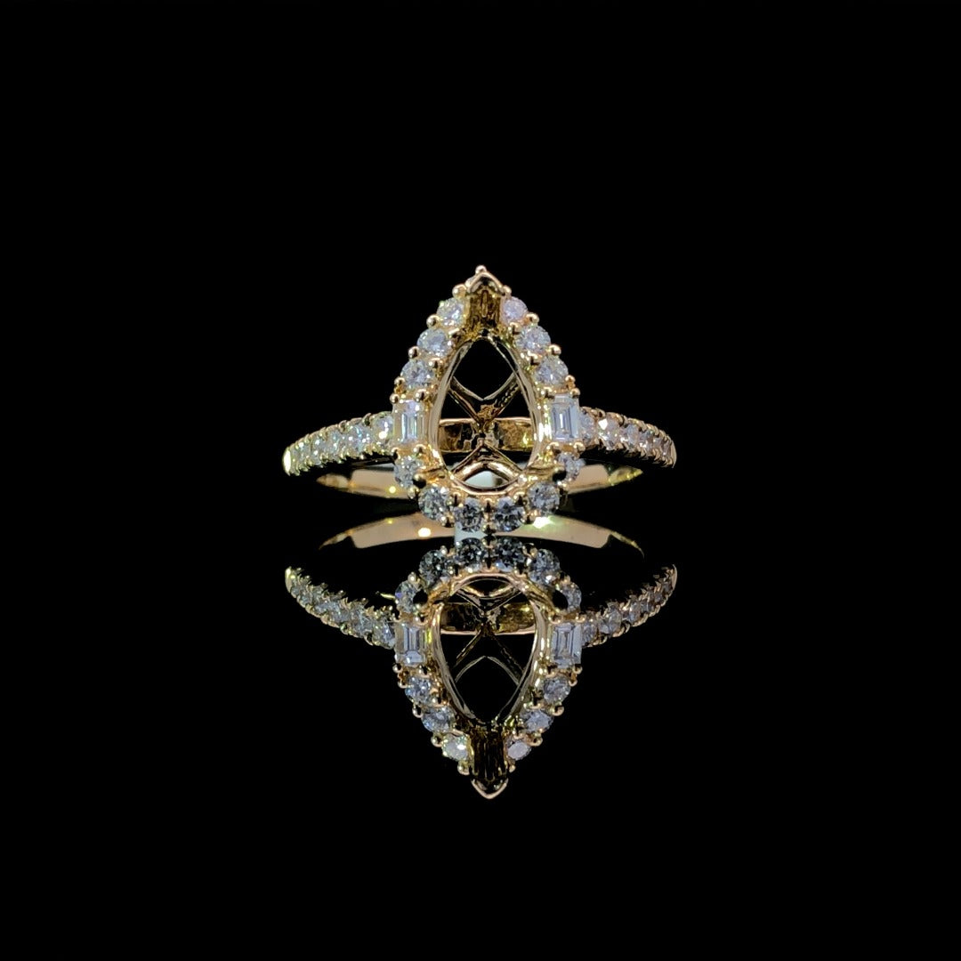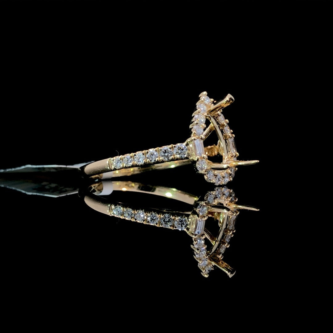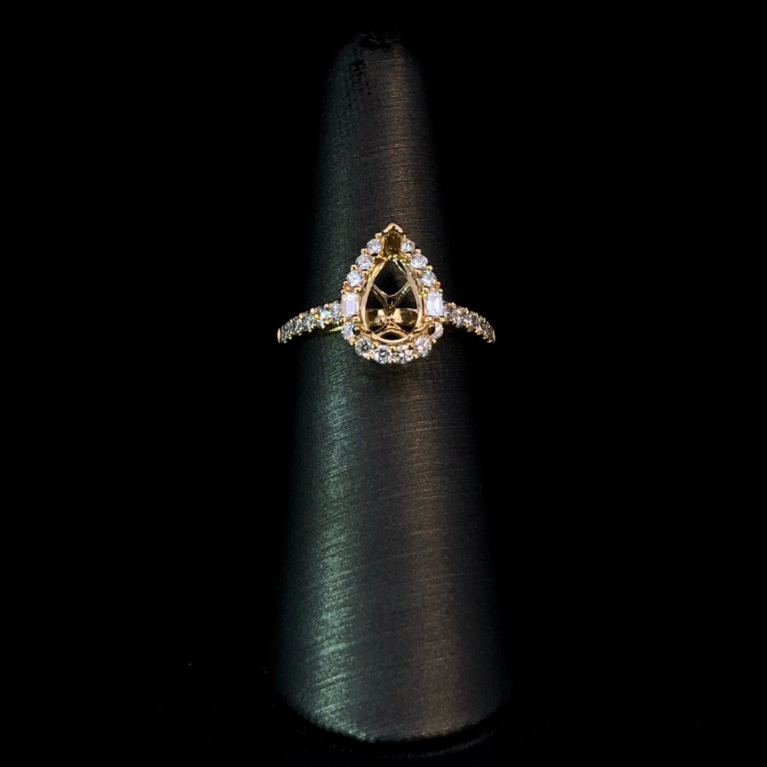 This exquisite 18kt yellow gold semi mount showcases a captivating pear-shaped halo adorned with a mix of round and baguette diamonds. The band features a dazzling cascade of small round diamonds, creating an elegant and luxurious look. Customize this piece with your desired pear-shaped center stone from our unmatched selection for a truly unique and striking piece. With a total diamond weight of .58ctw, this is a beautiful and timeless choice. Price is for the semi mount only. If that size is not a perfect fit, first time sizing is free at the time of purchase, additional sizing fees may apply.