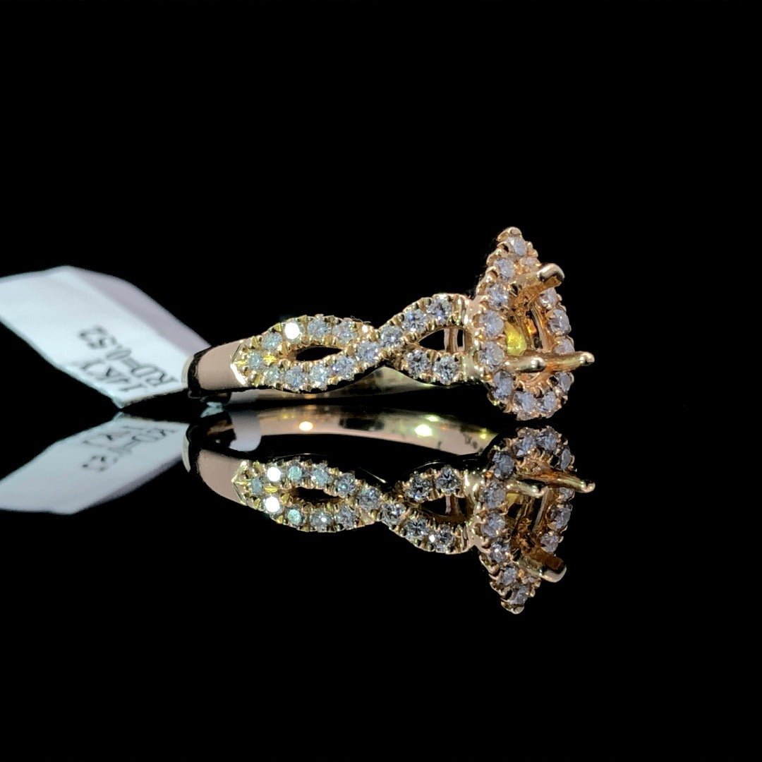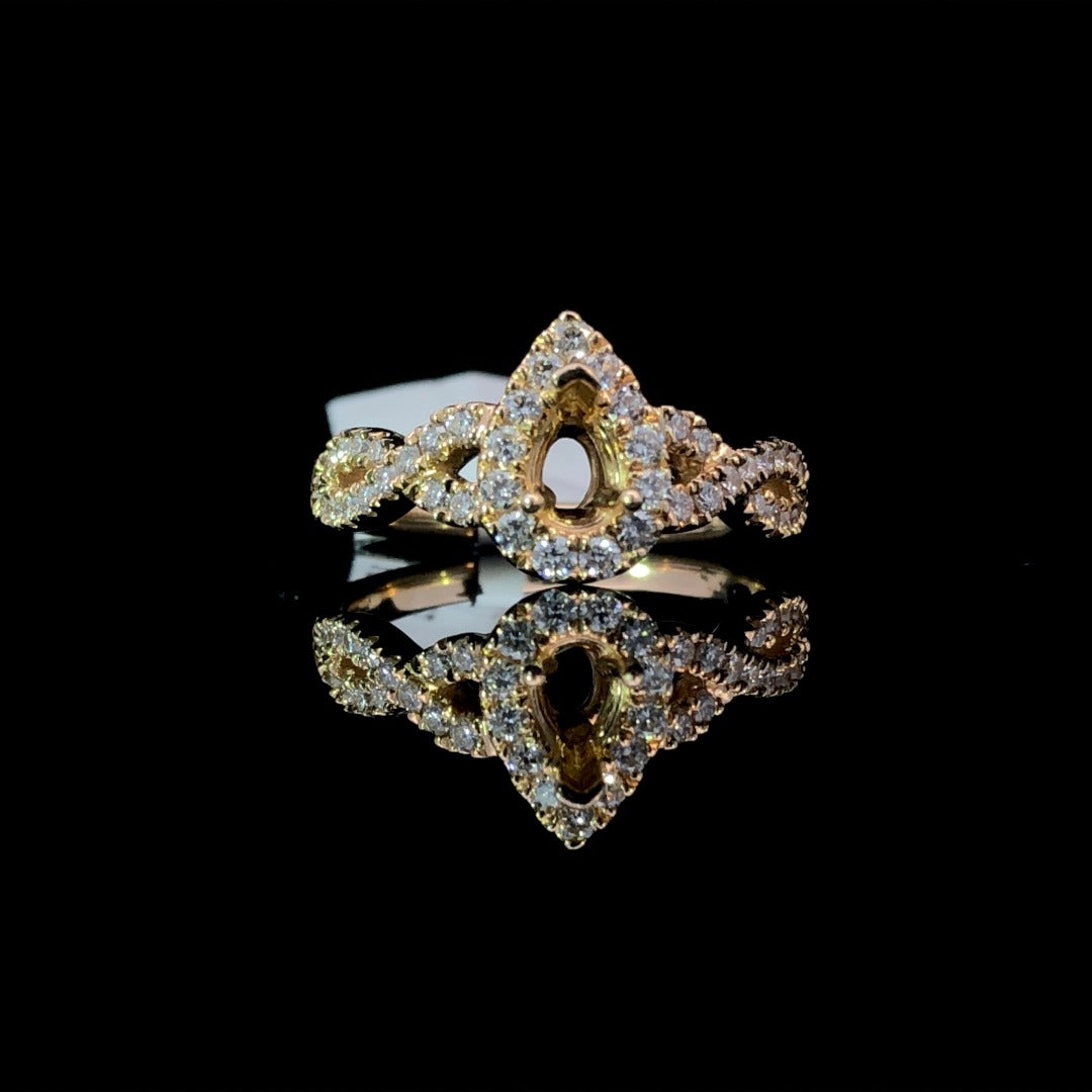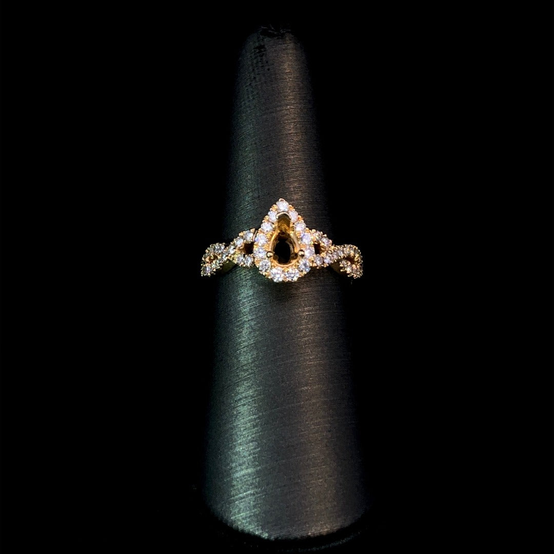 Indulge in luxury with this beautiful diamond semi mount. Featuring a stunning pear-shaped halo and a twisted band, this 14kt yellow gold piece allows you to customize with your choice of center stone from our unmatched selection. With a total diamond weight of .52ctw, experience elegance at its finest. Price is for the semi mount only. Center stone will be added at an additional cost. This ring is a size 6.25. If that size is not a perfect fit, first time sizing is free at the time of purchase. Additional sizing fees may apply.
